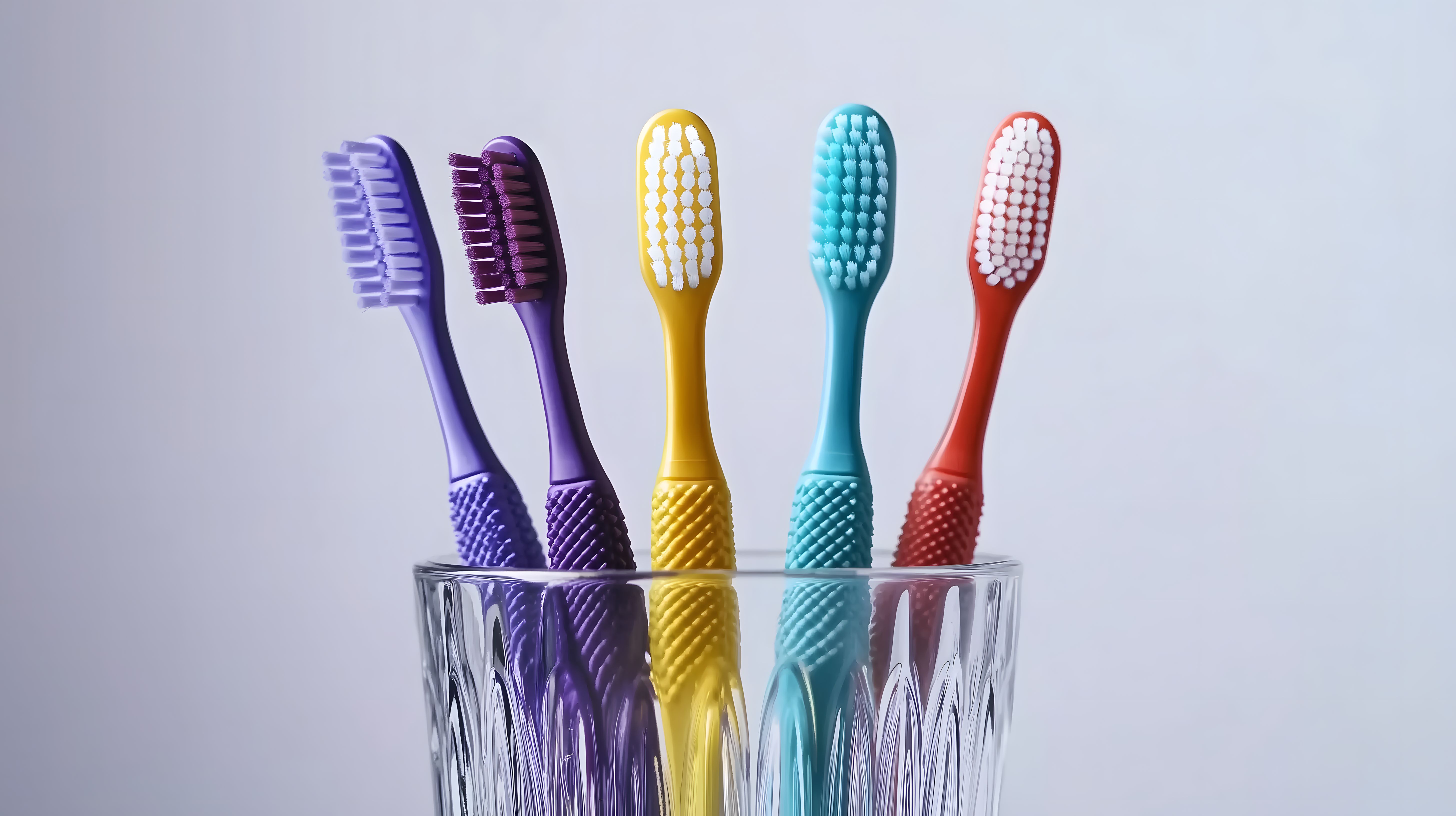 Das Bild zeigt eine Nahaufnahme von fünf farbenfrohen Zahnbürsten, die in einer Glasvase angeordnet sind. Die Zahnbürsten sind in Lila, Gelb, Türkis und Rot gehalten und bilden eine harmonische Farbpalette. Die minimalistisch gestaltete Szene lenkt den Blick auf das Wesentliche und schafft einen ruhigen, ästhetischen Eindruck. Dieses Stockfoto eignet sich hervorragend für die Verwendung in Blogbeiträgen, Newslettern, Social-Media-Posts oder Werbematerialien rund um das Thema Mundpflege, Gesundheit und Hygiene. Es ist in hoher Auflösung verfügbar und unter einer Creative-Commons-Lizenz frei verwendbar.