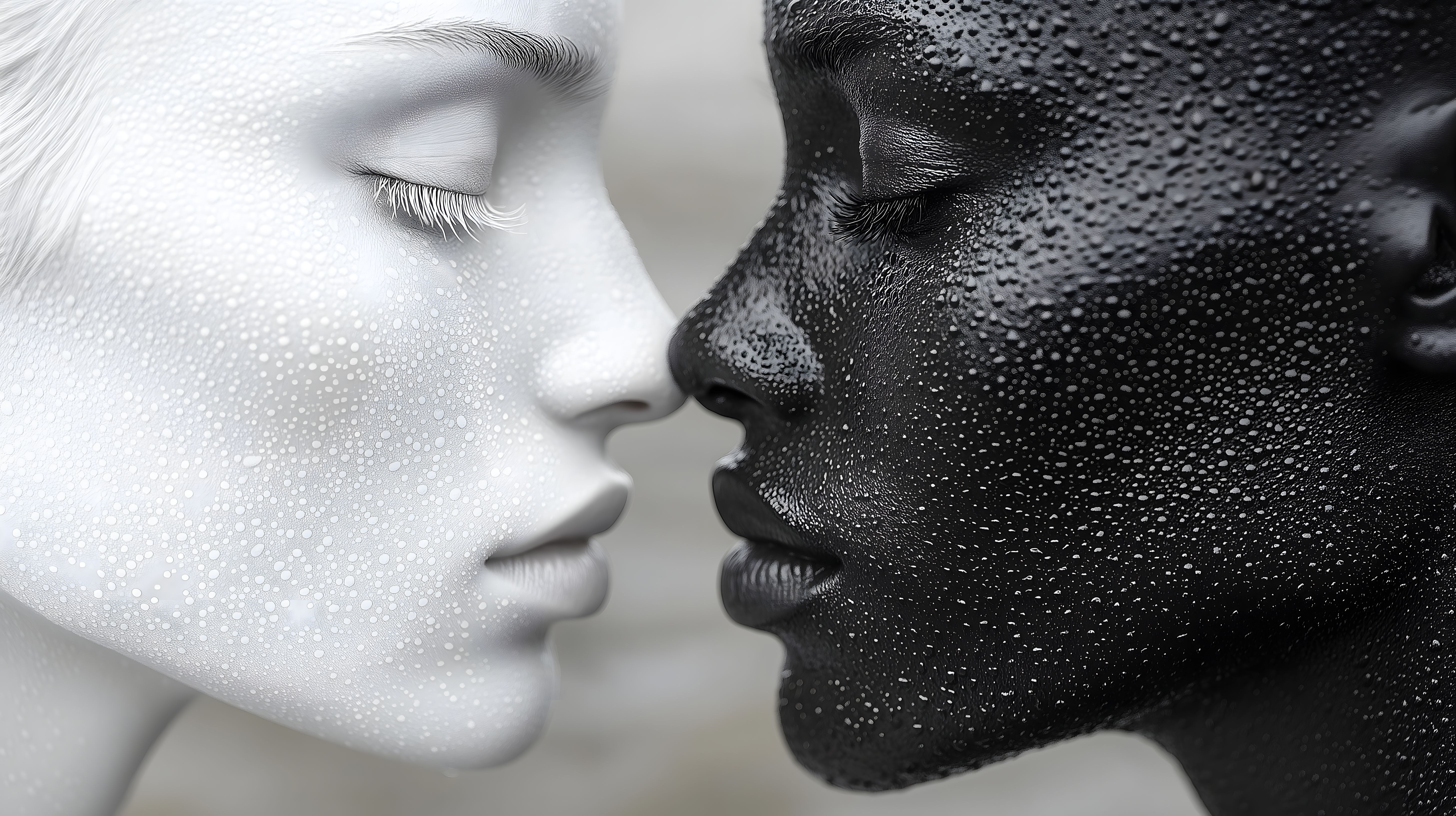 Dieses faszinierende Schwarz-Weiß-Foto zeigt zwei Gesichter, die sich nahe kommen und sich fast berühren. Die Tropfen auf der Haut verleihen dem Bild eine besondere Ästhetik und Sinnlichkeit. Der hohe Kontrast und die realistische Darstellung machen das Foto zu einem eindrucksvollen Kunstwerk. Es eignet sich hervorragend für den Einsatz in editorischen Beiträgen, Werbekampagnen oder auf Social-Media-Kanälen, wo es Aufmerksamkeit und Emotionen wecken kann. Dieses hochauflösende Stockfoto steht unter einer Creative-Commons-Lizenz kostenlos zur Verfügung.