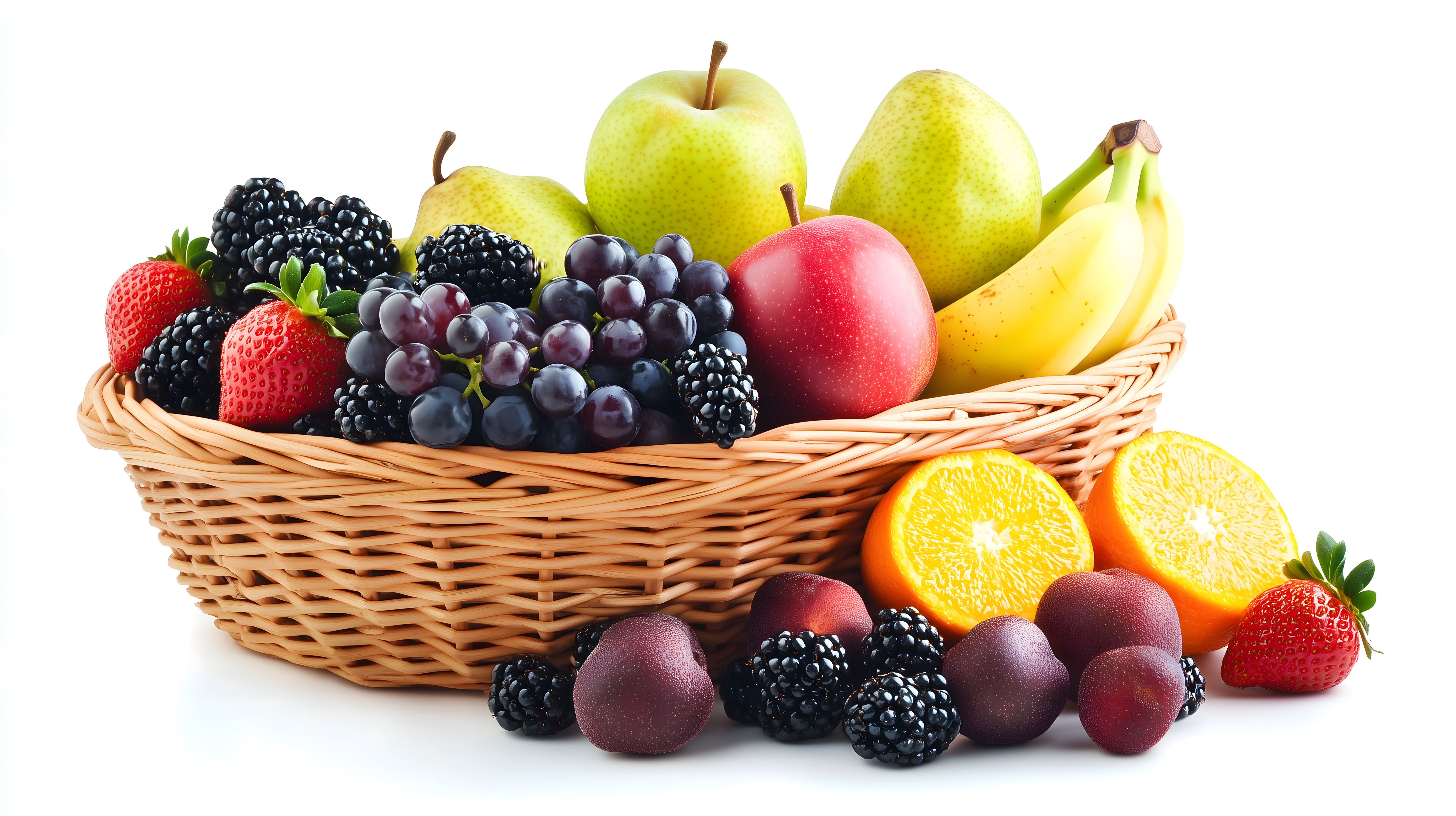 Das Foto zeigt einen Korb voller farbenfroher, frischer Früchte auf weißem Hintergrund. Zu sehen sind Äpfel, Birnen, Orangen, Bananen, Erdbeeren, Brombeeren und Weintrauben, die in einer rustikalen Weide-Schale arrangiert sind. Die Früchte präsentieren sich in leuchtenden Farben und perfekter Reife, was den Eindruck von Frische, Gesundheit und Qualität vermittelt. Dieses Stockfoto eignet sich hervorragend für Lebensmittel-Blogbeiträge, Social-Media-Posts zu gesunder Ernährung, Werbung für Bio-Produkte oder als redaktionelle Illustration in Magazinen und Zeitungen. Die hochauflösende Datei steht unter einer Creative-Commons-Lizenz zur kostenfreien Verwendung zur Verfügung.