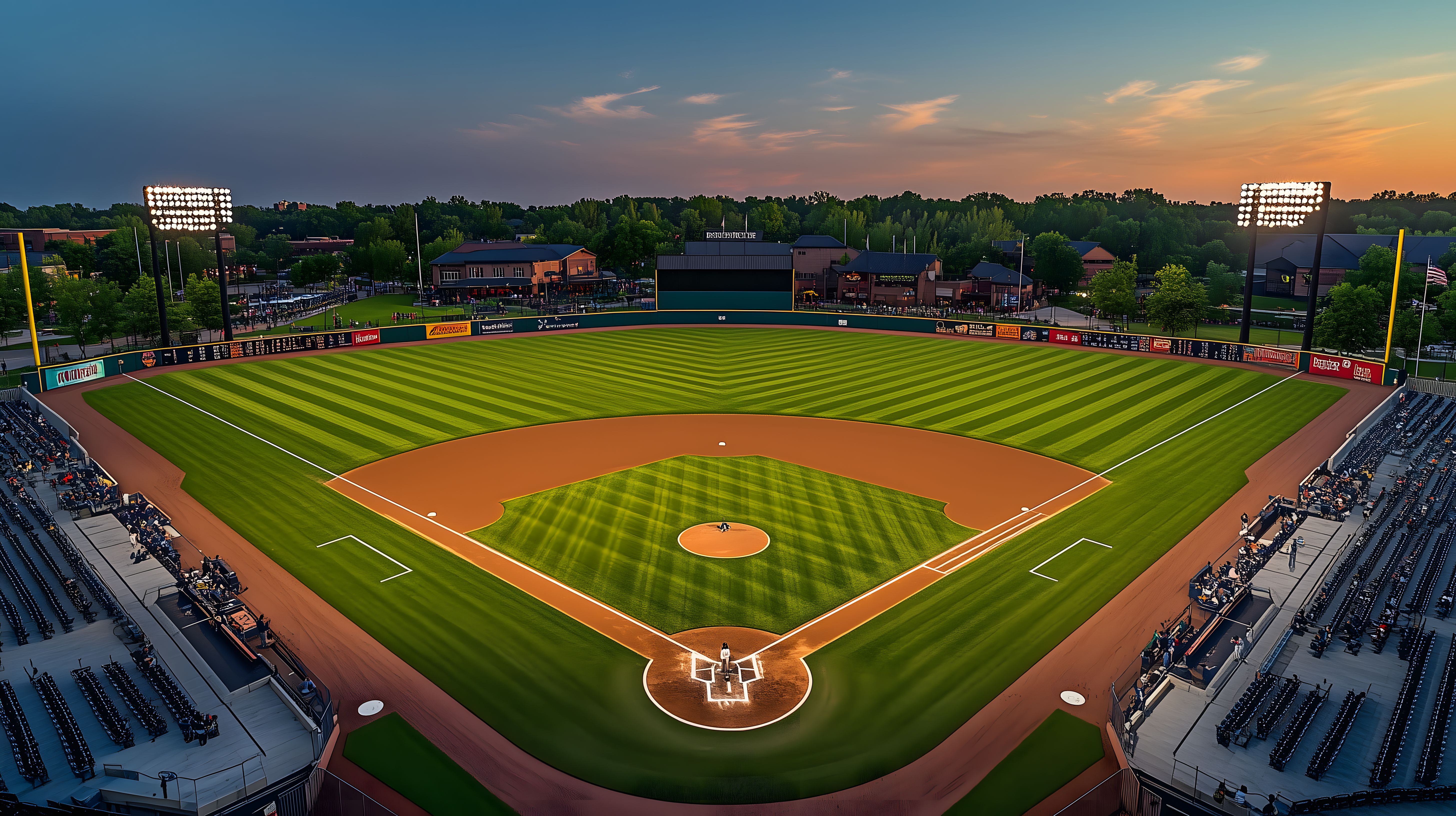 Dieses Foto zeigt ein eindrucksvolles Baseballstadion, das bei Sonnenuntergang aufgenommen wurde. Die Luftaufnahme bietet einen weiten Blick auf das grüne Spielfeld, das von einer orangefarbenen Abenddämmerung erhellt wird. Im Hintergrund sind Wälder und Büsche zu sehen, die einen natürlichen Rahmen für das Stadion bilden. Die Beleuchtungsanlagen des Stadions sind bereits eingeschaltet und verleihen dem Bild eine stimmungsvolle Atmosphäre. Dieses Foto eignet sich hervorragend als Hintergrundbild für Blogs, Newsletter, Social-Media-Beiträge oder Werbekampagnen rund um den Sport oder saisonale Themen. Es ist in hoher Auflösung verfügbar und unter einer Creative-Commons-Lizenz kostenlos nutzbar.