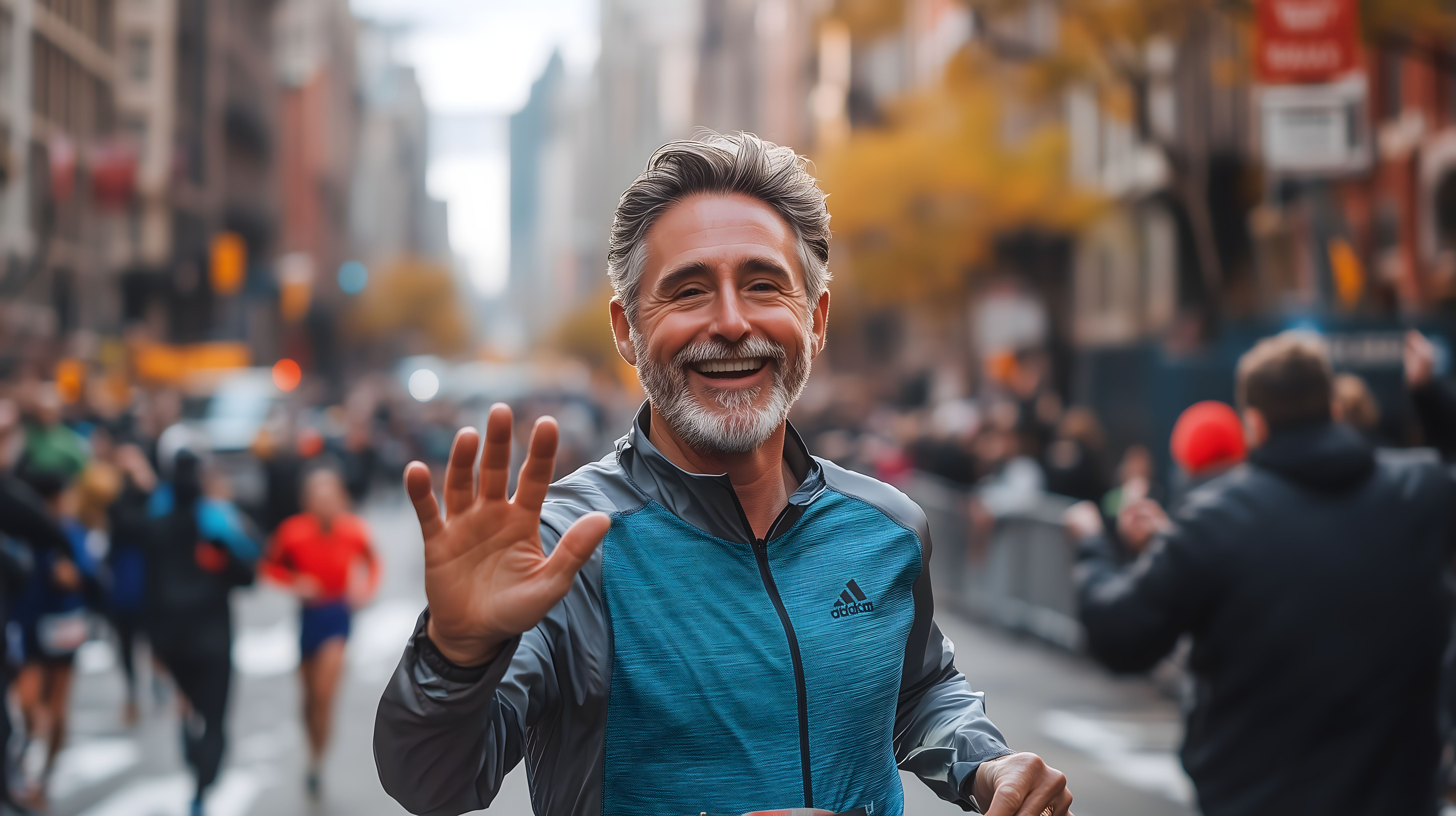 Dieses fröhliche Foto zeigt einen lächelnden Jogger, der auf einer belebten Stadtstraße läuft und mit erhobener Hand winkt. Die bunte Szenerie im Hintergrund mit Passanten, Autos und Geschäften sorgt für einen lebendigen, urbanen Kontext. Das Bild vermittelt Dynamik, Bewegung und eine positive Stimmung. Es eignet sich hervorragend als kostenloses Stockfoto für Blogbeiträge, Social-Media-Posts oder Werbematerial rund um Themen wie Fitness, Stadtleben, Lifestyle und Outdoor-Aktivitäten. Die hochauflösende Qualität und Creative-Commons-Lizenz ermöglichen eine vielseitige Verwendung.