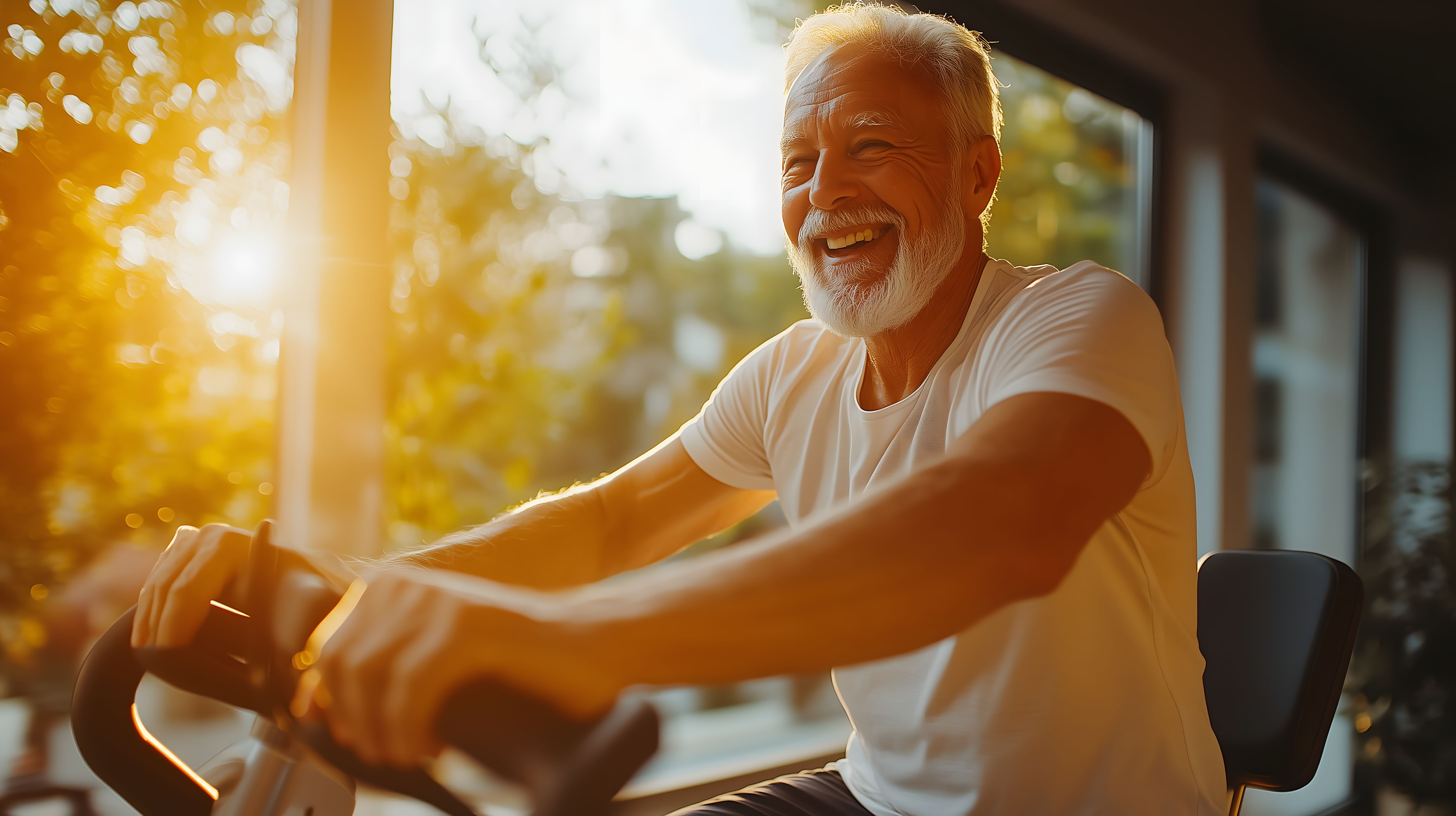 Das Foto zeigt einen lächelnden, älteren Mann, der auf einem Heimtrainer in einer natürlichen Umgebung trainiert. Er sitzt im Freien vor einem Gebäude und genießt offensichtlich die warmen Sonnenstrahlen. Der Mann strahlt eine positive, lebendige Ausstrahlung aus und demonstriert, dass ein aktiver Lebensstil auch im Alter möglich und erstrebenswert ist. Dieses Stockfoto wäre ideal für Artikel, Blogbeiträge oder Werbematerial rund um Senioren-Fitness, gesunden Lebensstil und Wohlbefinden im Alter. Das hochauflösende Bild steht unter einer Creative-Commons-Lizenz kostenlos zur Verfügung.