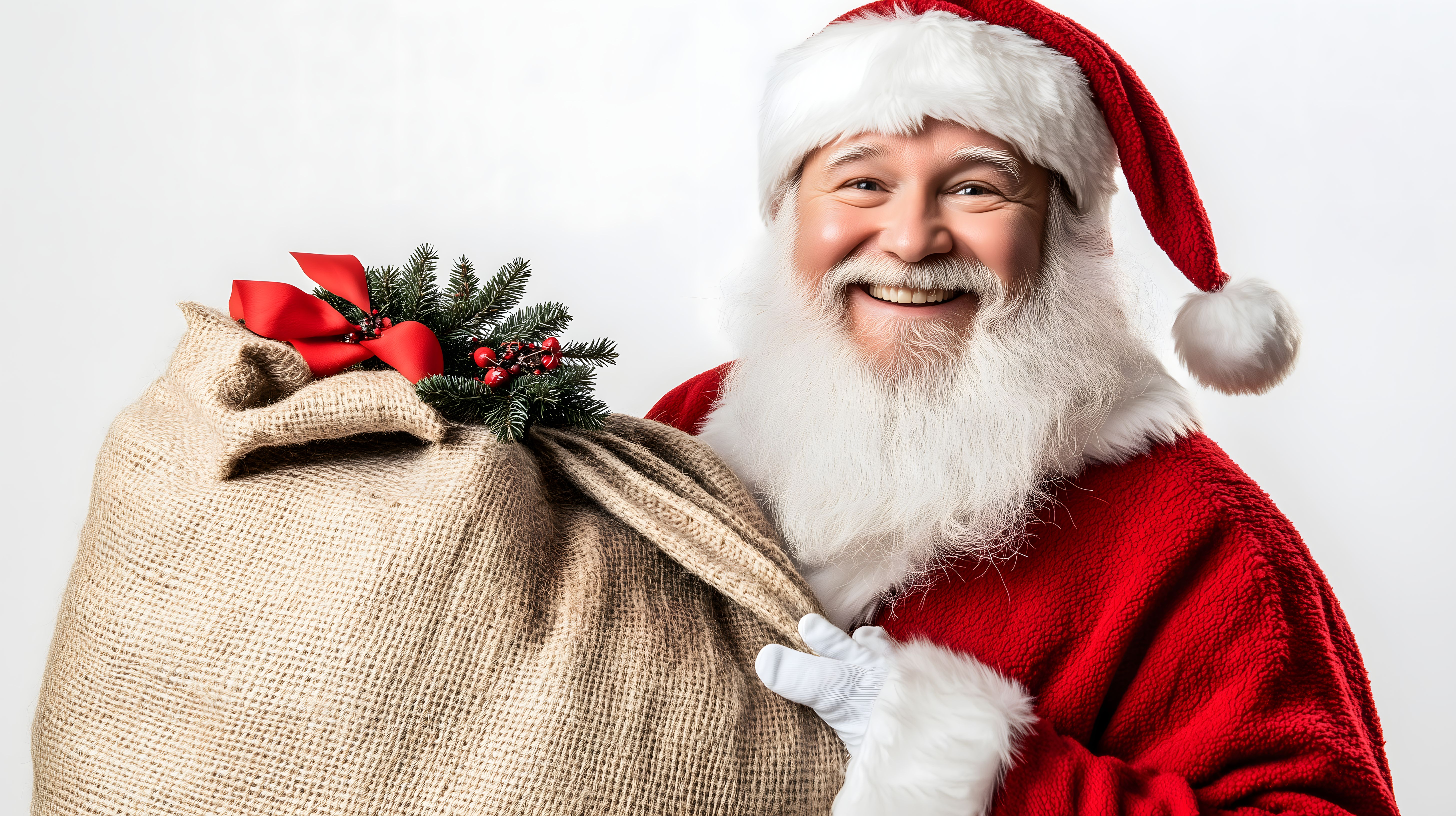 Das Foto zeigt einen fröhlichen Weihnachtsmann mit einem großen Geschenksack. Er trägt den traditionellen roten Mantel und Mütze und strahlt ein breites Lächeln. Der Sack ist mit Tannenzweigen und einer roten Schleife geschmückt, was eine festliche Stimmung vermittelt. Das Bild eignet sich hervorragend für Weihnachtskarten, Werbekampagnen, Blogbeiträge oder Social-Media-Posts rund um die Feiertage. Als hochauflösendes, kostenloses Stockfoto unter Creative-Commons-Lizenz kann es vielfältig eingesetzt werden.
