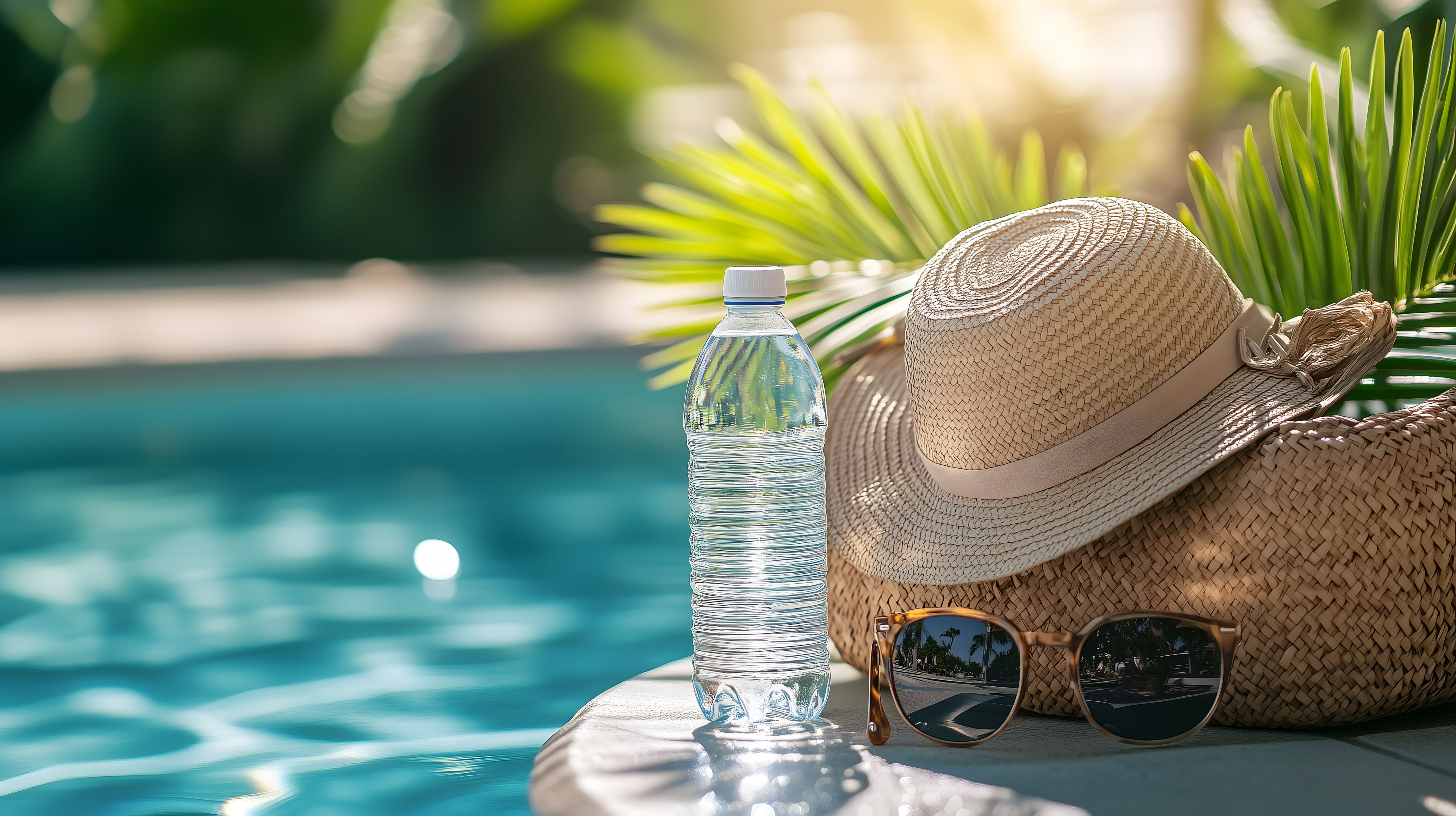 Dieses Bild zeigt einen Strohhut und eine Sonnenbrille, die neben einer Wasserflasche am Poolrand stehen. Im Hintergrund ist eine grüne Palme zu sehen und das Wasser des Pools schimmert in einem klaren Blauton. Die Szene vermittelt einen friedlichen, erholsamen Eindruck und lässt an einen Sommertag im Urlaub denken. Dieses stimmungsvolle Stockfoto in hoher Auflösung eignet sich hervorragend für den Einsatz in Blogbeiträgen, Newsletter-Layouts, Social-Media-Posts und Werbematerialien, die eine entspannte, tropische Atmosphäre zum Ausdruck bringen möchten. Das Bild steht unter der Creative-Commons-Lizenz zur freien Nutzung zur Verfügung.