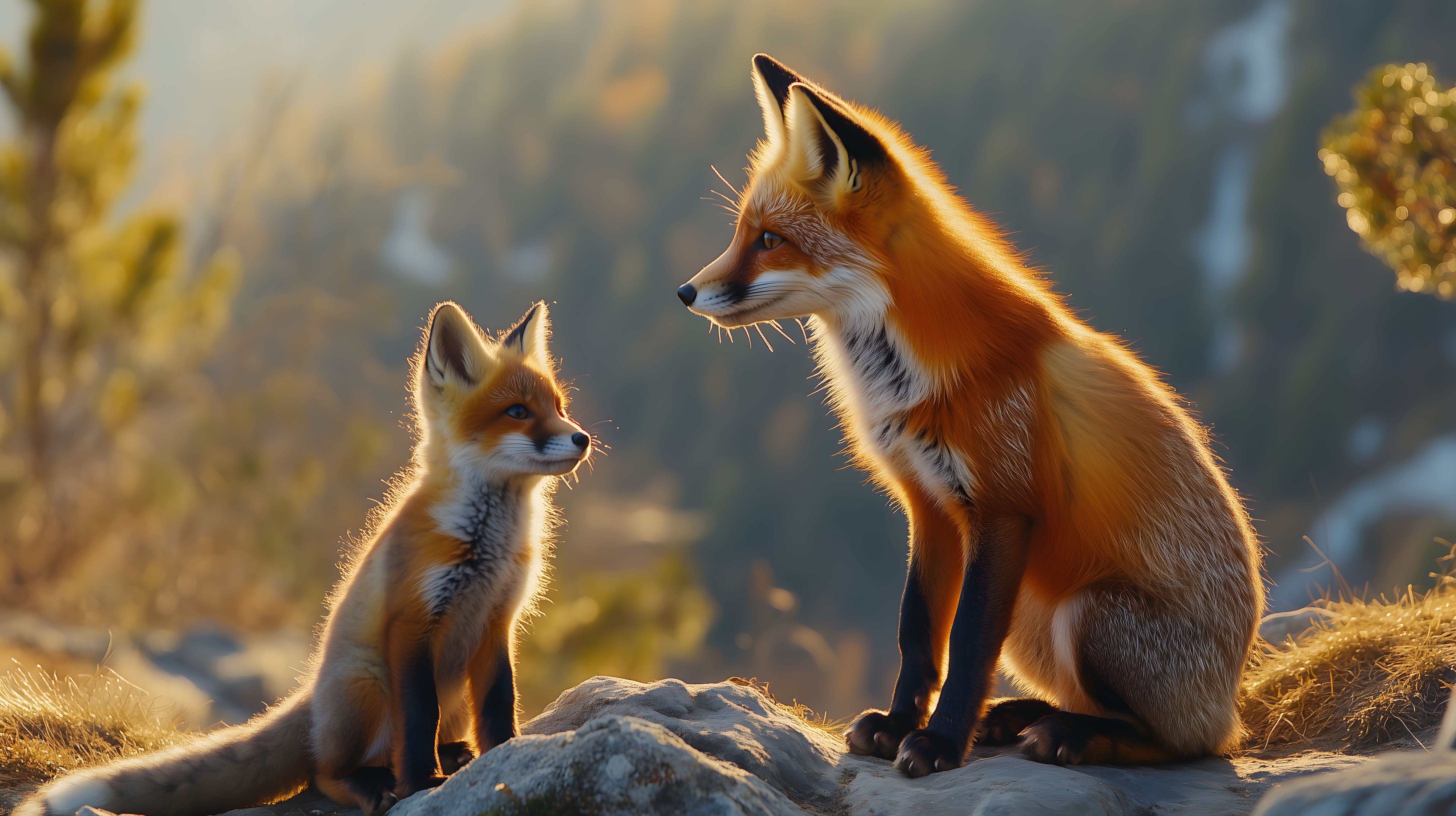 Dieses atemberaubende Foto zeigt eine Fuchsmutter und ihr Jungtier in ihrer natürlichen Umgebung. Die goldene Abendsonne wirft ein warmes Licht auf die beiden Füchse, die friedlich auf einem Felsen sitzen und die Umgebung beobachten. Die scharfe Detailzeichnung und die natürliche Komposition lassen die Szene authentisch und beruhigend wirken. Dieses hochauflösende Stockfoto eignet sich hervorragend für den Einsatz in Blogs, Newslettern, Social-Media-Kanälen oder Werbekampagnen rund um Themen wie Natur, Tiere, Familienleben oder Tierschutz. Als kostenfreies, unter Creative Commons lizenziertes Bild kann es vielfältig und ohne Einschränkungen verwendet werden.