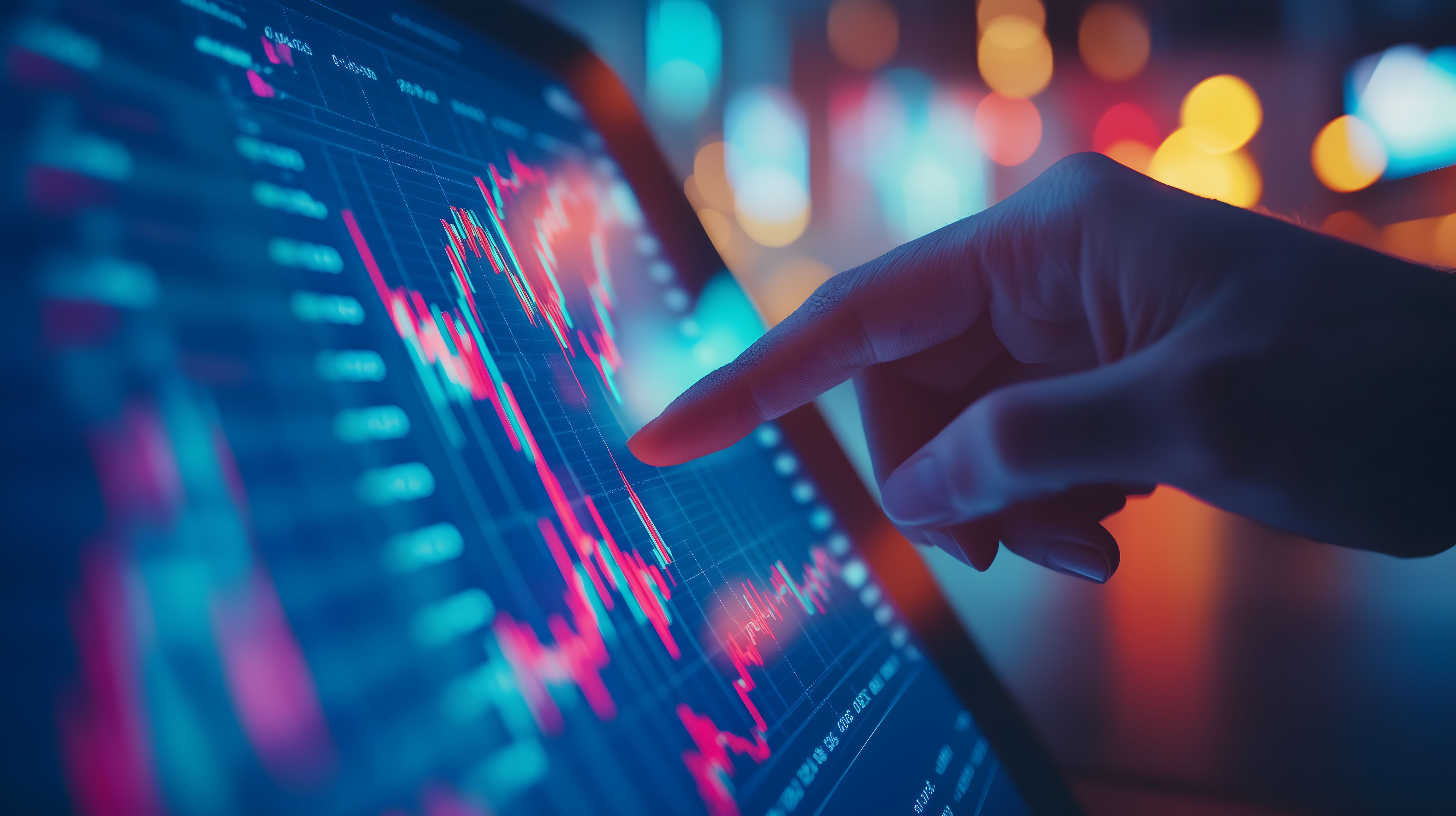 Das Bild zeigt die Hand eines Menschen, der auf ein digitales Display mit Börsenkursen und Finanzdaten zeigt. Der Hintergrund ist verschwommen und bunt beleuchtet, was eine dynamische und hochmoderne Atmosphäre vermittelt. Die Grafiken und Diagramme auf dem Display deuten auf eine professionelle Börsensoftware oder Finanzanalyse-Anwendung hin. Dieses Stockfoto eignet sich hervorragend für Artikel und Beiträge rund um Themen wie Aktienhandel, Investitionen, Finanztrends und Wirtschaftsberichterstattung. Es bietet eine hochauflösende, kostenlose und frei nutzbare Alternative zu Archivbildern für den kommerziellen und redaktionellen Einsatz unter Creative-Commons-Lizenz.