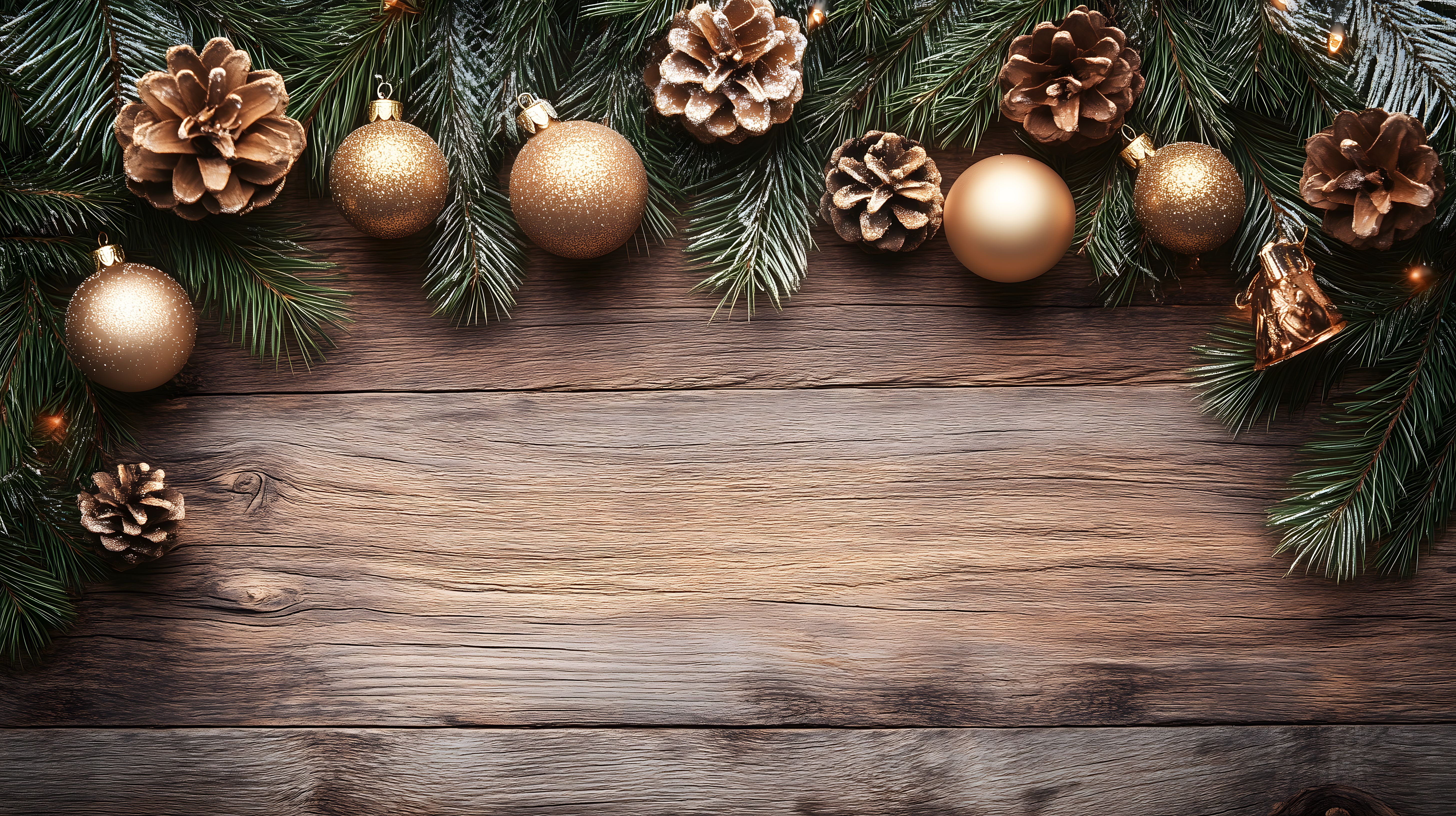 Dieses stimmungsvolle Weihnachtsfoto zeigt eine Anordnung von Dekorationselementen auf einem rustikalen Holzhintergrund. Zu sehen sind grüne Tannenzweige, goldfarbene Kugeln und braune Tannenzapfen, die eine winterliche und festliche Atmosphäre schaffen. Der Fokus liegt auf der natürlichen, reduzierten Gestaltung, die einen idealen Rahmen für Texte oder Logos bietet. Dieses hochauflösende Stockfoto ist kostenlos unter einer Creative-Commons-Lizenz verfügbar und eignet sich hervorragend für Weihnachtsgrüße, Blogbeiträge, Newsletter-Designs oder Werbematerialien im Advent- und Weihnachtskontext.