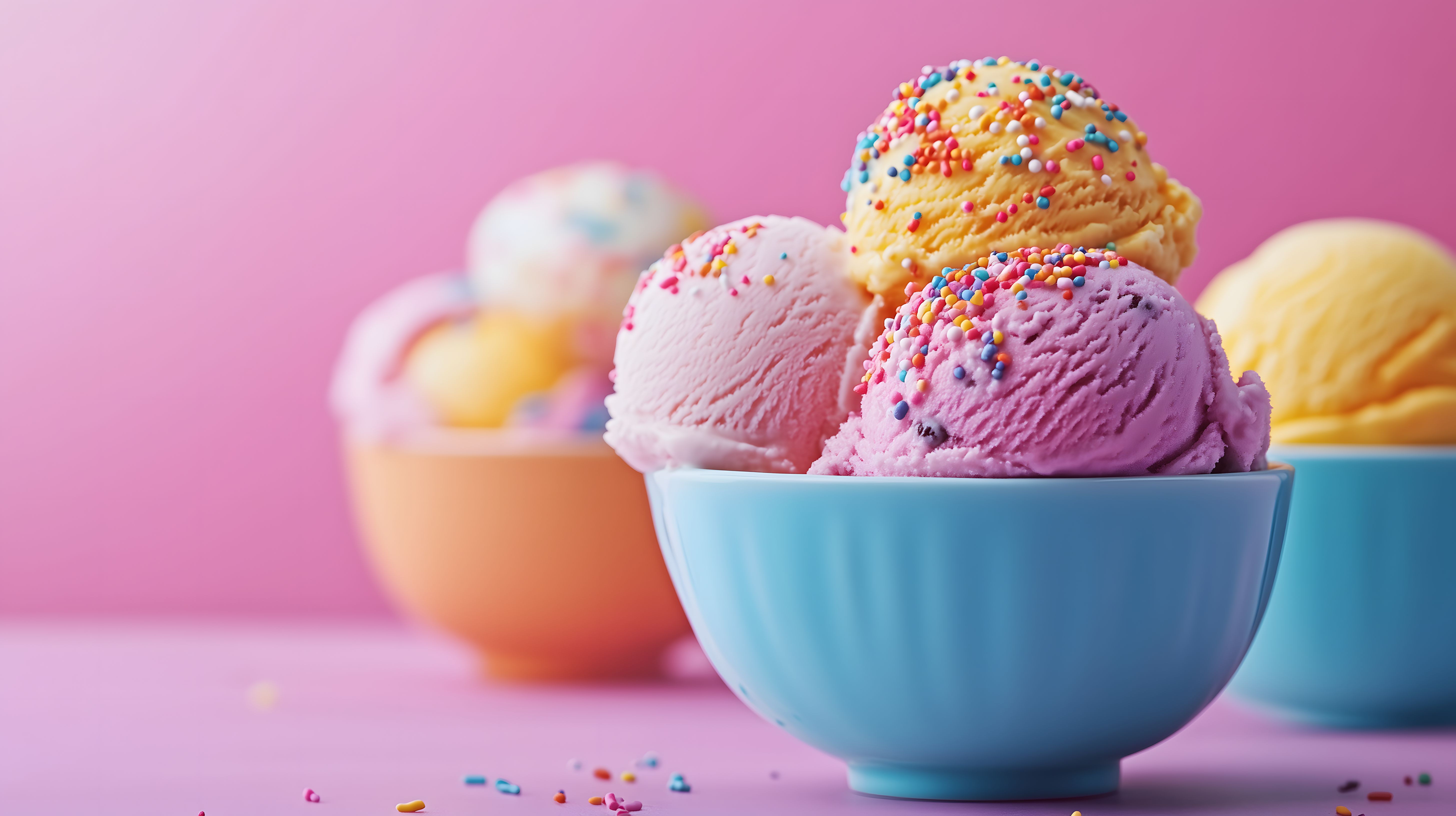 Das Foto zeigt eine Reihe bunter Eisportionen in unterschiedlichen Farben und Dekorationen. Die Eiskugeln sind in hellblauen Schälchen angerichtet, die Oberfläche ist mit farbigen Streuseln und Konfetti übersät. Die Eissorten reichen von gelbem Vanilleeis über pinkfarbenes Erdbeereis bis hin zu lila Lavendeleis. Das Foto besticht durch seine lebendigen Farben, die den Betrachter in eine sommerliche, fröhliche Stimmung versetzen. Es eignet sich perfekt als Stockfoto für Werbung, Social-Media-Beiträge oder Foodblog-Artikel rund um Eis und Süßigkeiten. Das hochauflösende Bild steht unter einer Creative-Commons-Lizenz zur kostenlosen Nutzung zur Verfügung.