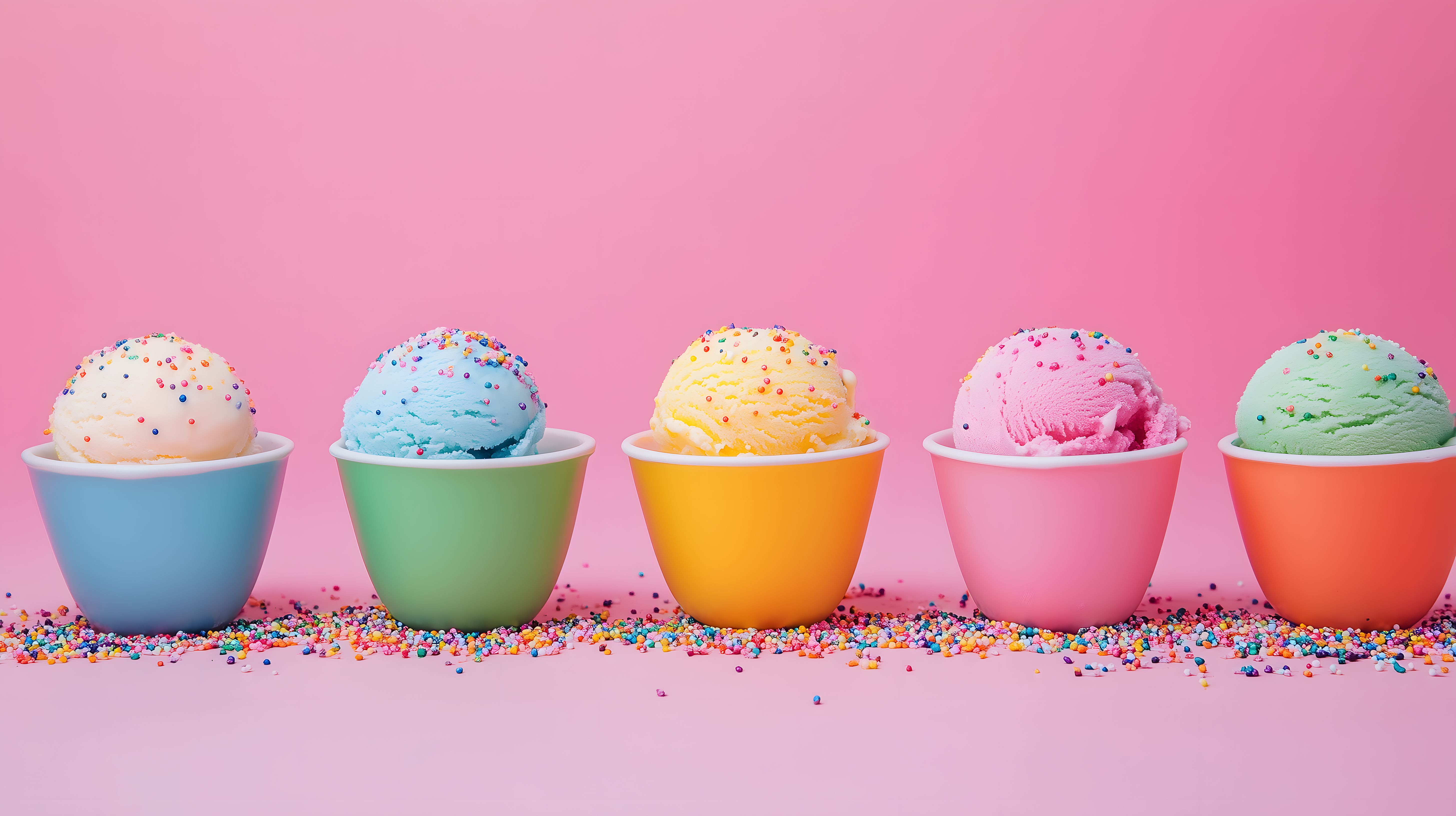 Dieses farbenfrohe Foto zeigt eine Reihe von Eiskreme-Kugeln in verschiedenen Pastelltönen in bunten Schalen mit Streuseln. Die Komposition mit den leuchtenden Farben und der klaren Anordnung der Eisportionen ergibt ein stimmungsvolles und appetitliches Bild. Es eignet sich hervorragend als kostenloses Stockfoto für den Einsatz in Blogs, Newslettern, Social-Media-Posts oder Werbekampagnen zum Thema Essen, Desserts oder Sommerfreuden. Die hochauflösende Darstellung in Creative-Commons-Lizenz lädt zum kreativen Gestalten ein.