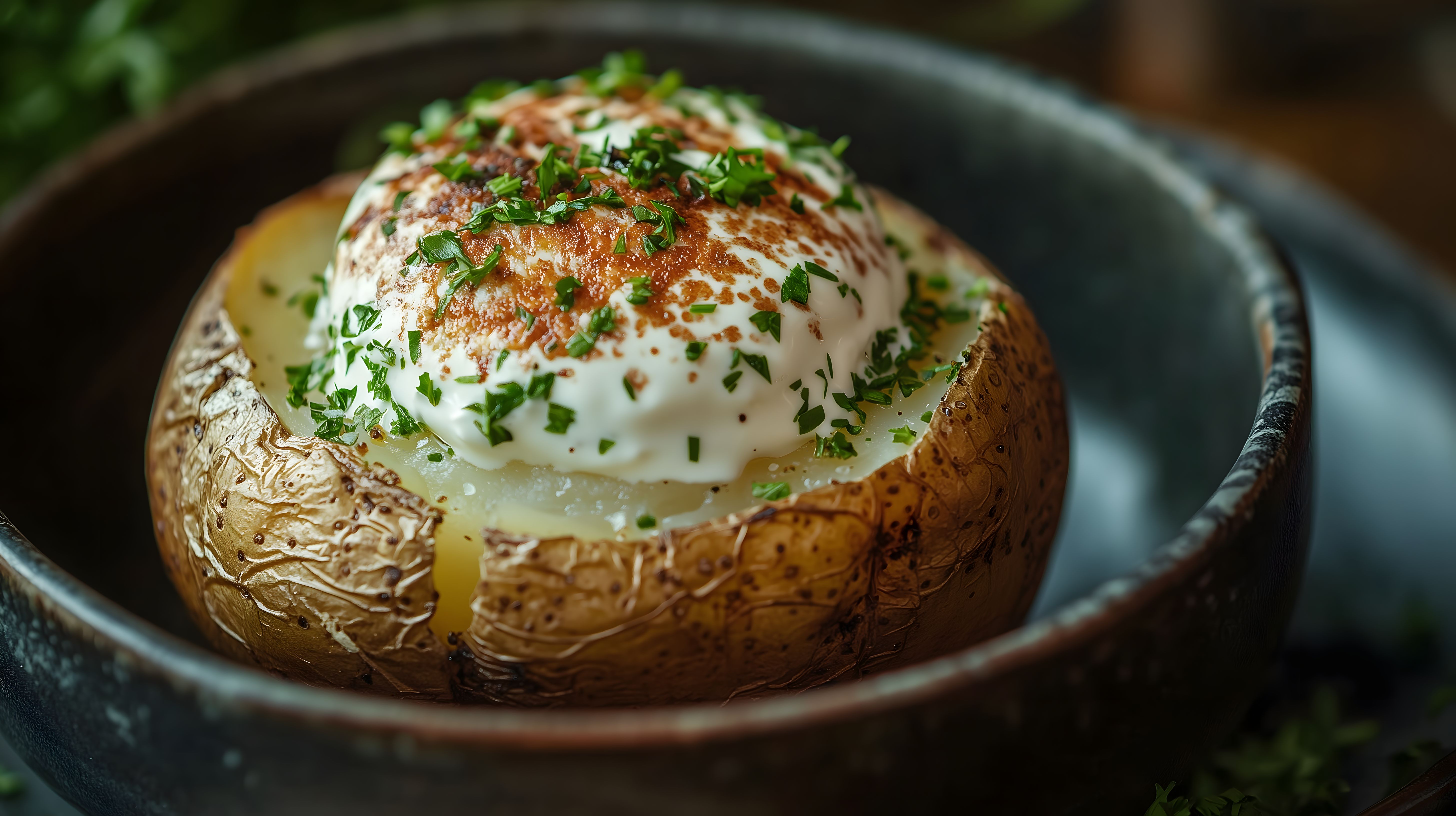 Dieses köstliche Foto zeigt eine saftige Ofenkartoffel, die mit cremigem Sauerrahm und frisch gehackten Kräutern garniert ist. Die Kartoffel liegt in einer rustikalen Keramikschüssel auf einem dunklen Hintergrund, was einen stimmungsvollen, natürlichen Rahmen schafft. Die Zubereitung ist simpel, aber das Ergebnis ist ein schmackhaftes, gesundes Gericht, das sowohl als Beilage als auch als Hauptspeise dienen kann. Dieses hochauflösende Stockfoto ist unter einer Creative-Commons-Lizenz verfügbar und eignet sich hervorragend für Verwendung in Blogs, Newslettern, Social-Media-Kanälen oder Werbematerialien.