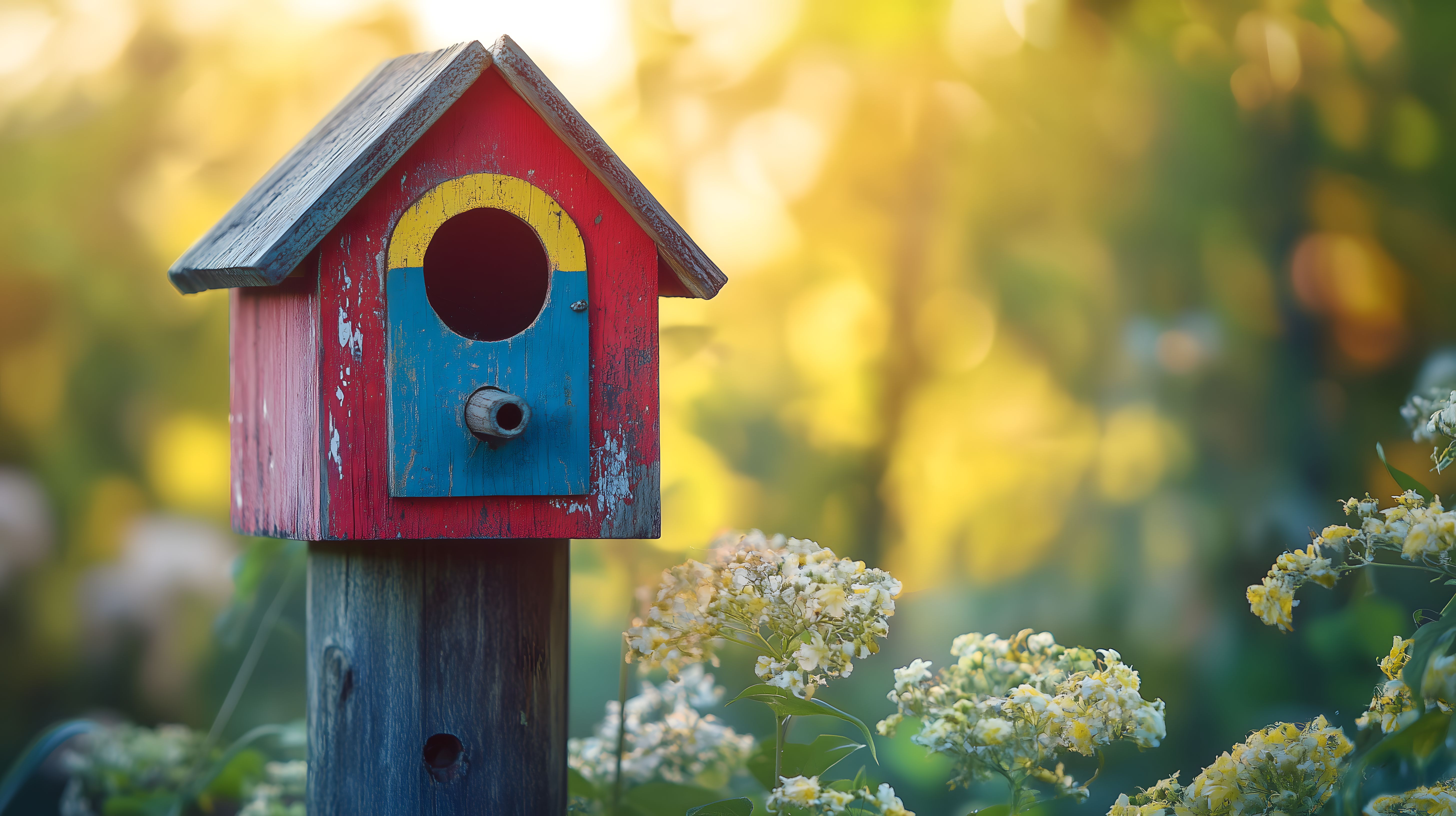 Dieses Foto zeigt ein farbenfrohes Vogelhaus, das auf einem Holzpfahl in einem sommerlichen Garten steht. Das Vogelhaus ist in kräftigen Rot-, Blau- und Gelbtönen bemalt und hebt sich wirkungsvoll vom üppigen grünen Hintergrund ab. Im Vordergrund sind bunte Blumen und Gräser zu sehen, die eine idyllische Gartenatmosphäre schaffen. Das Bild vermittelt eine friedliche, ländliche Stimmung, die durch den warmen Sonnenschein und die weichen Konturen zusätzlich verstärkt wird. Dieses kostenlose Stockfoto in hoher Auflösung unter Creative-Commons-Lizenz eignet sich hervorragend für die Verwendung in Blogbeiträgen, Newslettern, Social-Media-Kanälen oder Werbematerialien rund um die Themen Garten, Natur, Dekoration und Tierwelt.