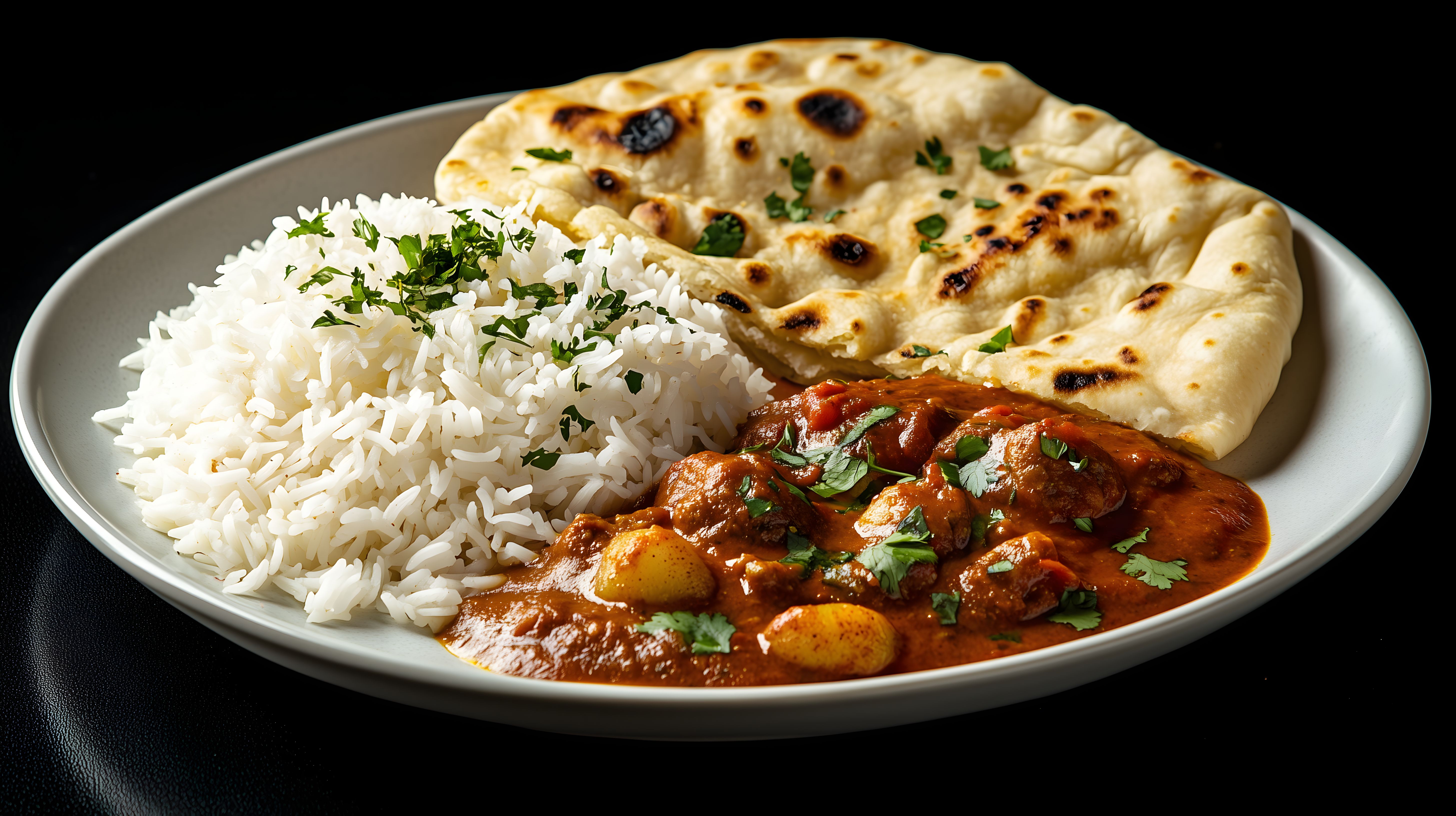 Dieses Foto zeigt ein traditionelles indisches Curry-Gericht, bestehend aus einem sämigen Fleischcurry mit Kartoffeln, serviert auf einem Teller mit weißem Reis und einem leckeren Naan-Fladenbrot. Das farbenfrohe Gericht ist in einem rustikalen Stil fotografiert, mit Fokus auf die köstlichen Zutaten. Dieses hochauflösende Foto eignet sich hervorragend als kostenloses Stockfoto für Blogs, Newsletter, Social-Media-Beiträge oder Werbekampagnen rund um das Thema asiatische Küche, Gewürze und traditionelle Gerichte. Die Aufnahme steht unter der Creative Commons-Lizenz zur Verfügung.