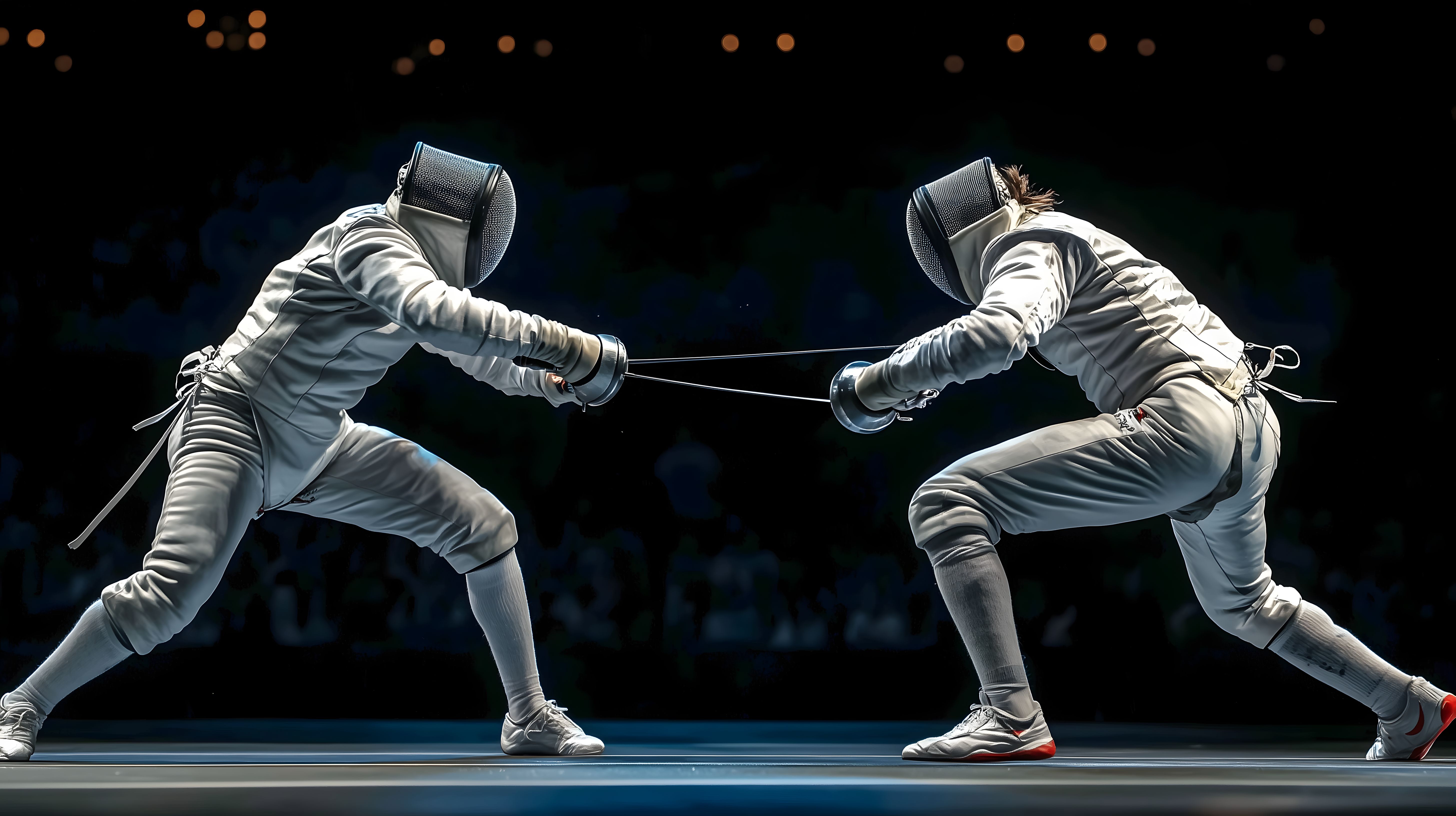 Das Bild zeigt zwei Fechter in vollem Kampfanzug, die sich in einem intensiven Duell auf einer Fechtbahn befinden. Die Athleten sind in vollkommener Konzentration, mit Rapieren in den Händen und in einer dynamischen Kampfpose dargestellt. Die Szene strahlt Spannung, Eleganz und Präzision aus - typische Elemente des Fechtsports. Dieses hochwertige Stockfoto eignet sich hervorragend für den Einsatz in Blogs, Newsletters, sozialen Medien oder Werbematerialien rund um Sportarten, Wettkämpfe und Herausforderungen. Es ist in hoher Auflösung verfügbar und unter der Creative-Commons-Lizenz frei nutzbar.