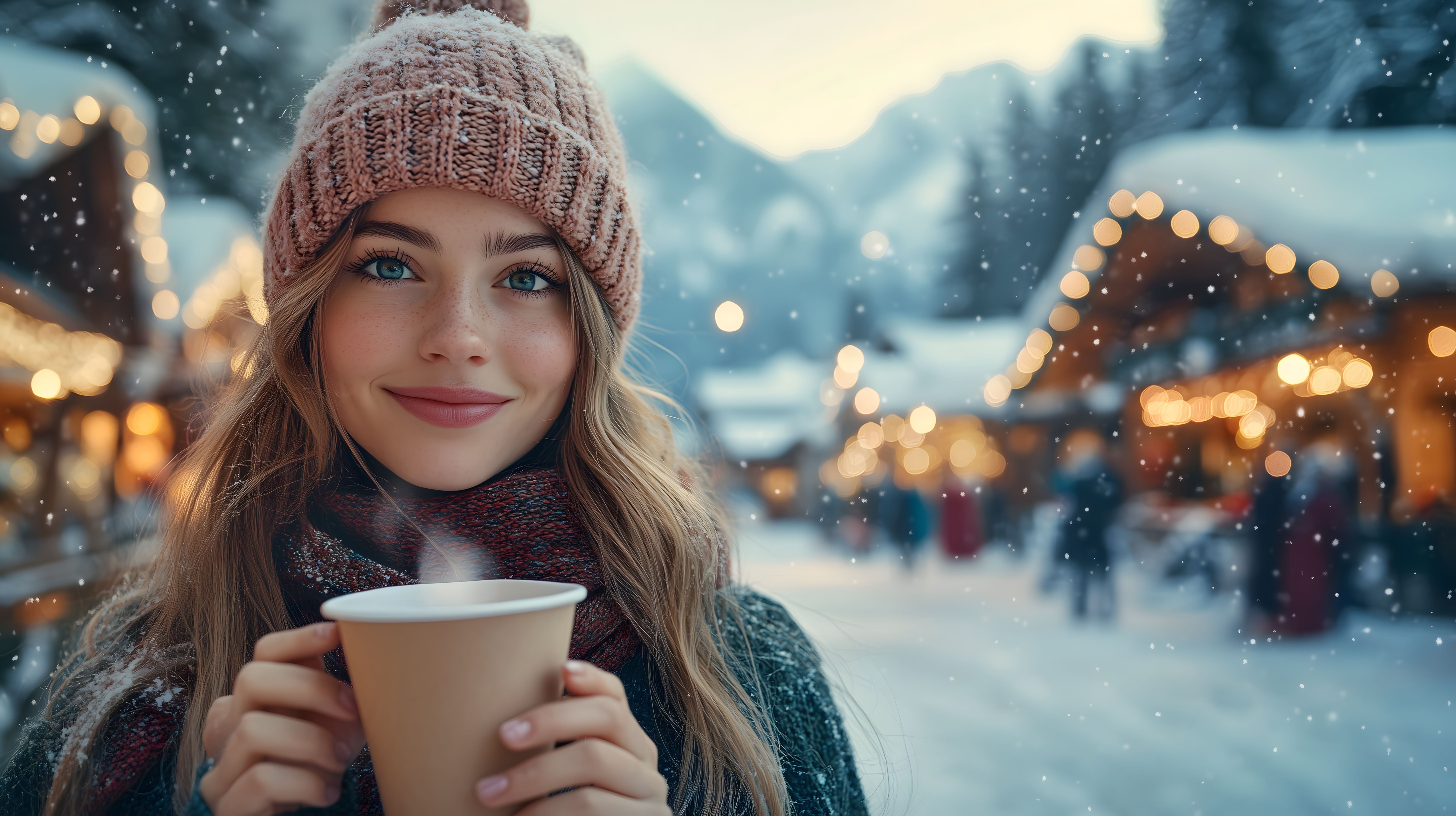 Dieses winterliche Foto zeigt eine hübsche junge Frau, die zufrieden lächelnd einen heißen Getränk auf einem verschneiten Weihnachtsmarkt genießt. Die Szene ist stimmungsvoll beleuchtet und von Schnee umgeben, was eine festliche und entspannte Atmosphäre vermittelt. Das Bild eignet sich hervorragend für den Einsatz in Blogs, Newslettern oder Werbematerialien rund um die Themen Weihnachten, Winterurlaub oder Genuss in der kalten Jahreszeit. Als hochauflösendes und kostenloses Stockfoto unter Creative-Commons-Lizenz kann es vielfältig genutzt werden.