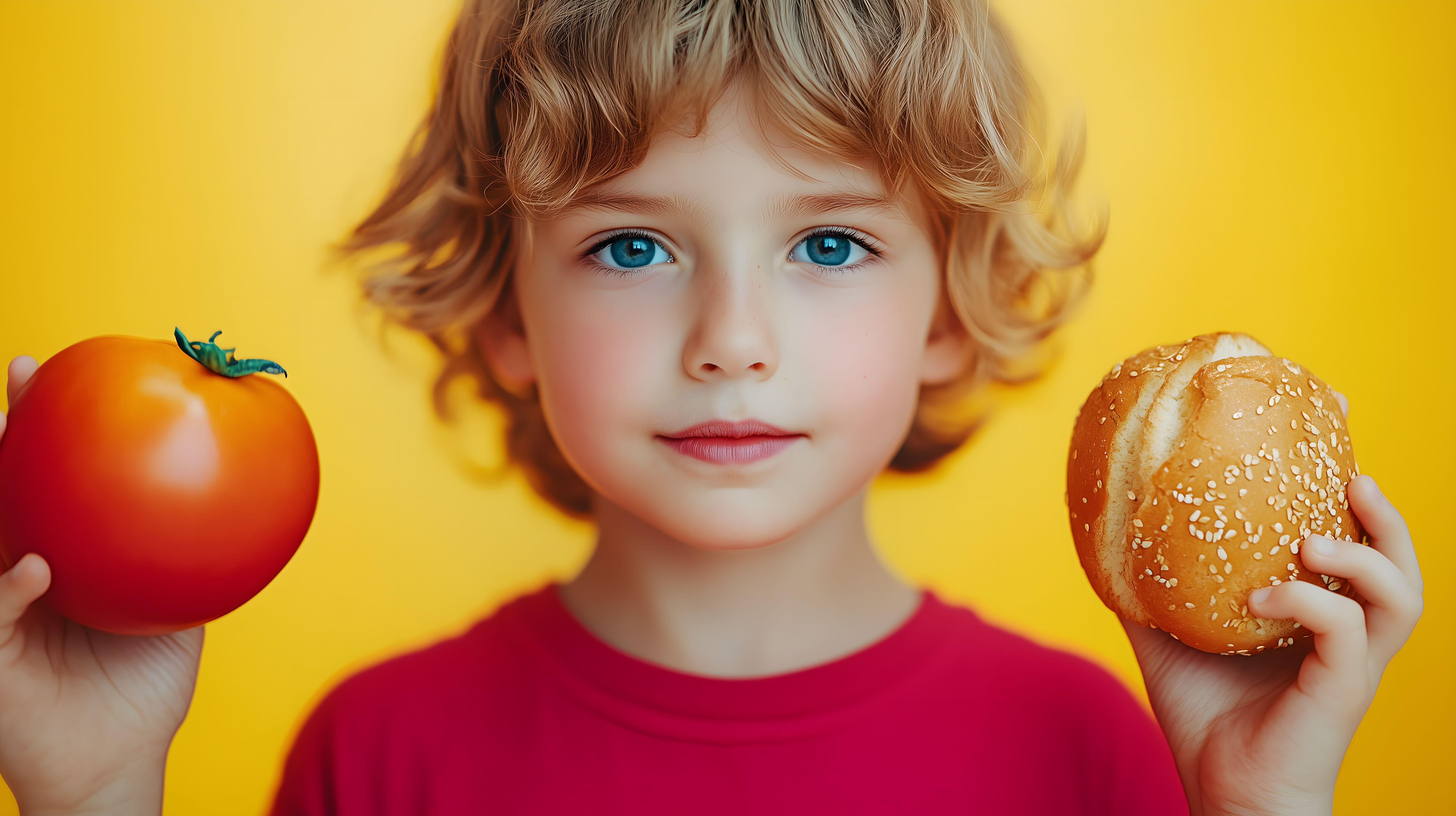 Das Bild zeigt ein junges, blondes Kind mit blauen Augen, das zwischen einer roten Tomate und einer Burger-Semmel mit Sesam wählt. Der Fokus liegt auf dem nachdenklichen Gesichtsausdruck des Kindes, das offensichtlich vor einer Entscheidung zwischen gesunder und ungesunder Ernährung steht. Der gelbe Hintergrund sorgt für einen starken Farbkontrast und betont die beiden unterschiedlichen Lebensmittel. Dieses Stockfoto in hoher Auflösung eignet sich ideal für Blogs, Newsletter, Social-Media-Beiträge oder Werbematerialien rund um das Thema gesunde Ernährung, Kindheit und Entscheidungsfindung. Die Creative-Commons-Lizenz ermöglicht eine vielfältige Nutzung des Motivs.