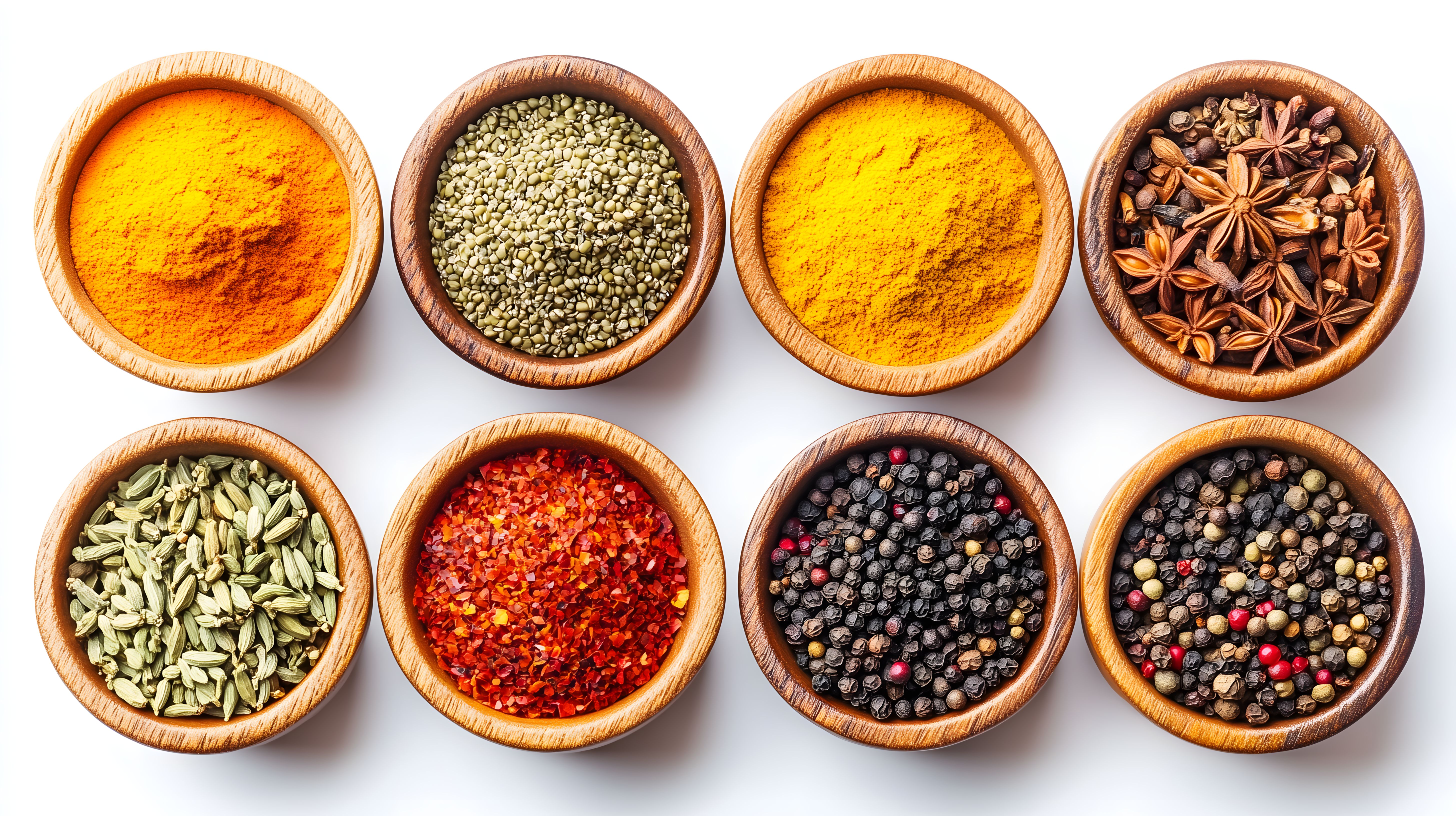 Dieses Bild zeigt eine bunte Auswahl an verschiedenen Gewürzen und Kräutern in rustikalen Holzschalen. Die Schalen sind in einer strukturierten Anordnung auf einem weißen Hintergrund platziert, wodurch die reiche Farbpalette und Textur der Gewürze besonders gut zur Geltung kommt. Das Foto eignet sich hervorragend für die Verwendung in Food-Blogs, Kochrezepten, sowie für Werbezwecke im Lebensmittel- und Gastronomiebereich. Als kostenloses Stockfoto in hoher Auflösung und unter einer Creative-Commons-Lizenz verfügbar, lässt es sich flexibel in verschiedenen Projekten einsetzen.