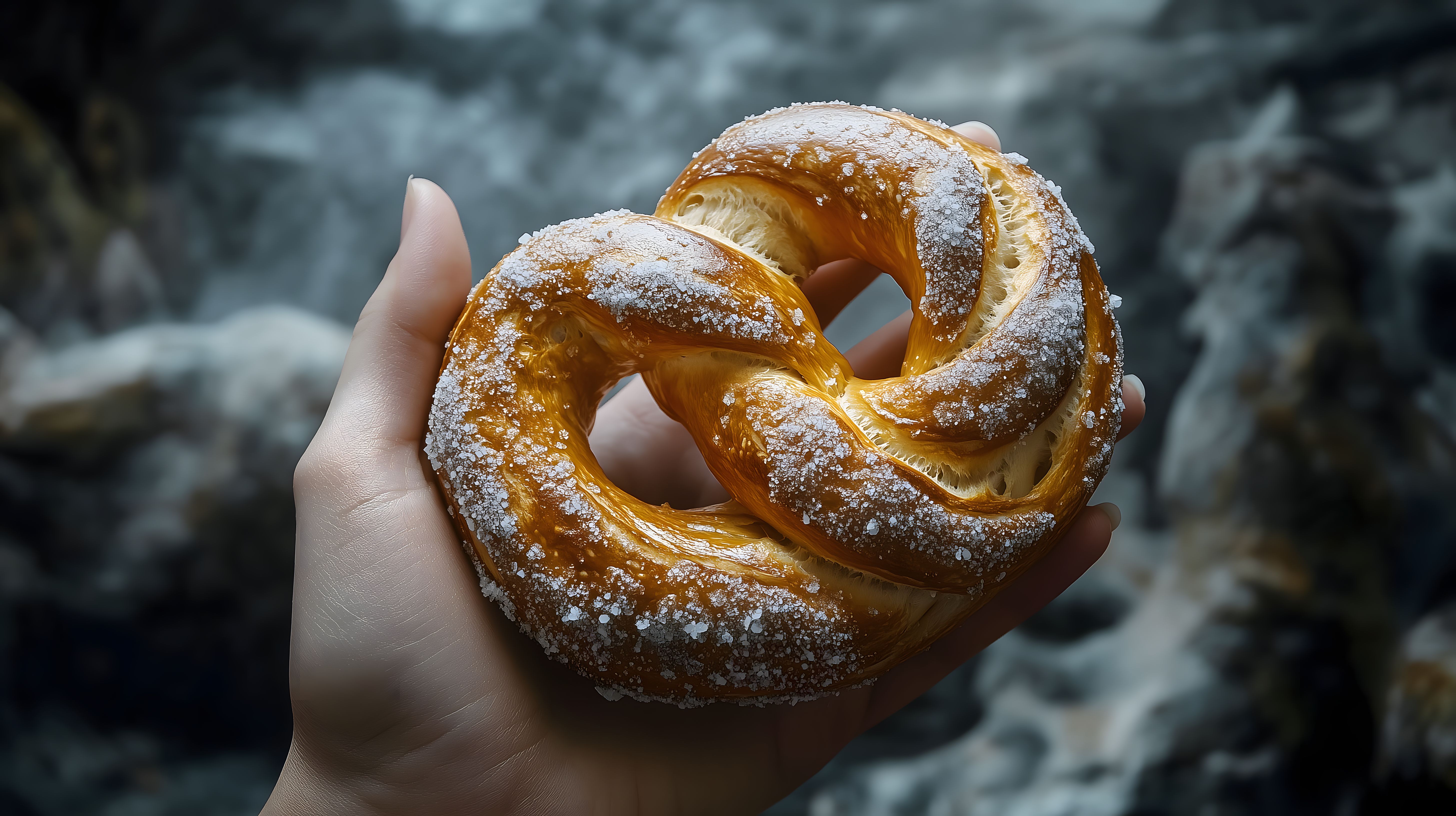 Das Bild zeigt eine frisch gebackene, zuckrig bestäubte deutsche Brezel, die in einer menschlichen Hand gehalten wird. Die goldbraune Färbung, die knusprige Oberfläche und der sichtbare Salzstreusel verleihen dem Gebäck einen appetitlichen Charakter. Der winterliche Hintergrund mit Schnee und dunklen Wolken am Himmel schafft eine gemütliche und saisonale Stimmung.