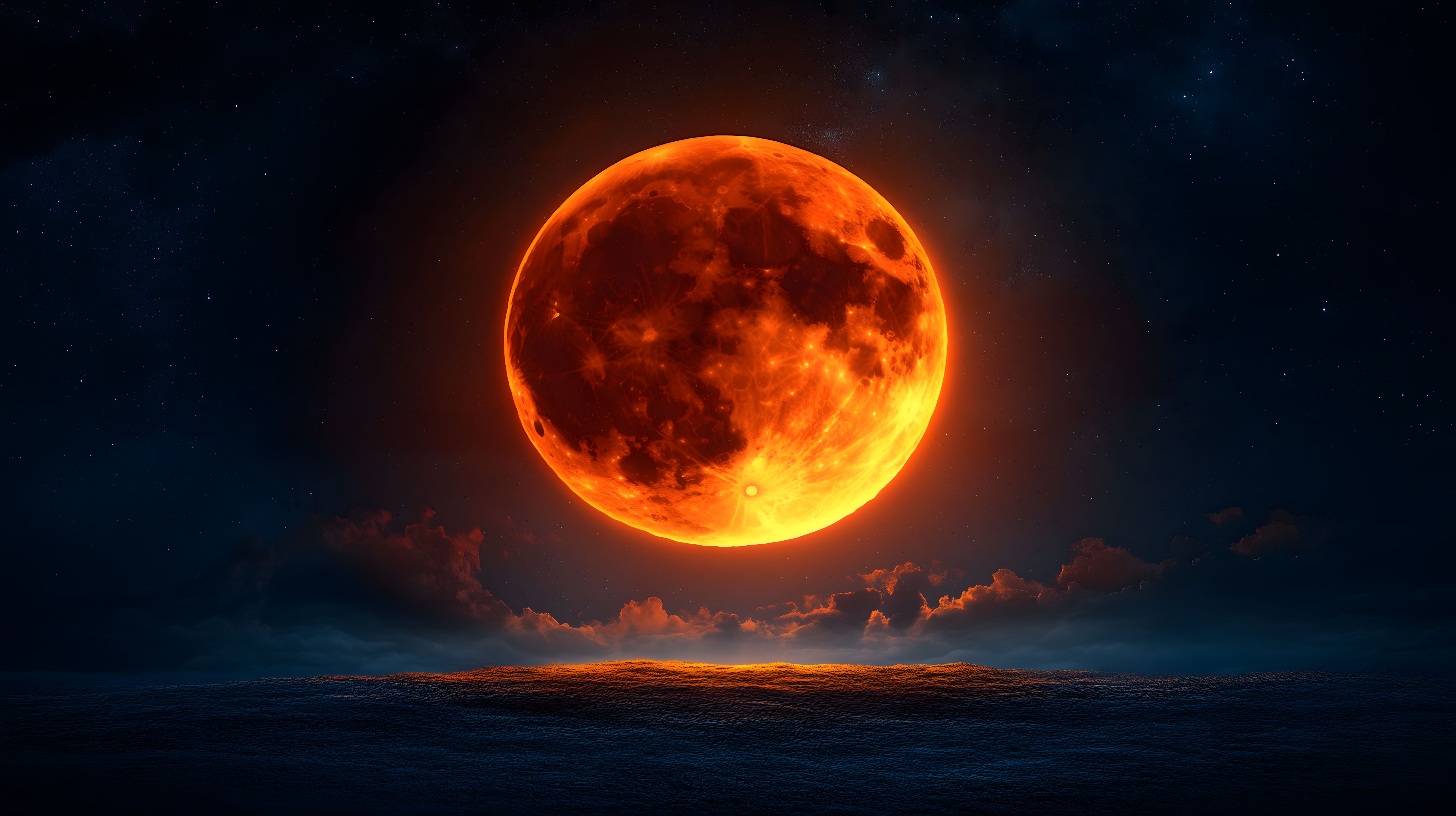 Das Bild zeigt einen beeindruckenden Blutmond, der sich am nächtlichen Himmel abhebt. Der rötlich-orangefarbene Mond erscheint außergewöhnlich groß und dominiert die Szenerie. Im Hintergrund erstreckt sich eine dunkle Landschaft, deren Konturen lediglich als Silhouette zu erkennen sind. Der Kontrast zwischen dem dramatisch leuchtenden Himmelskörper und der düsteren Umgebung erzeugt eine mystische und atmosphärische Stimmung.