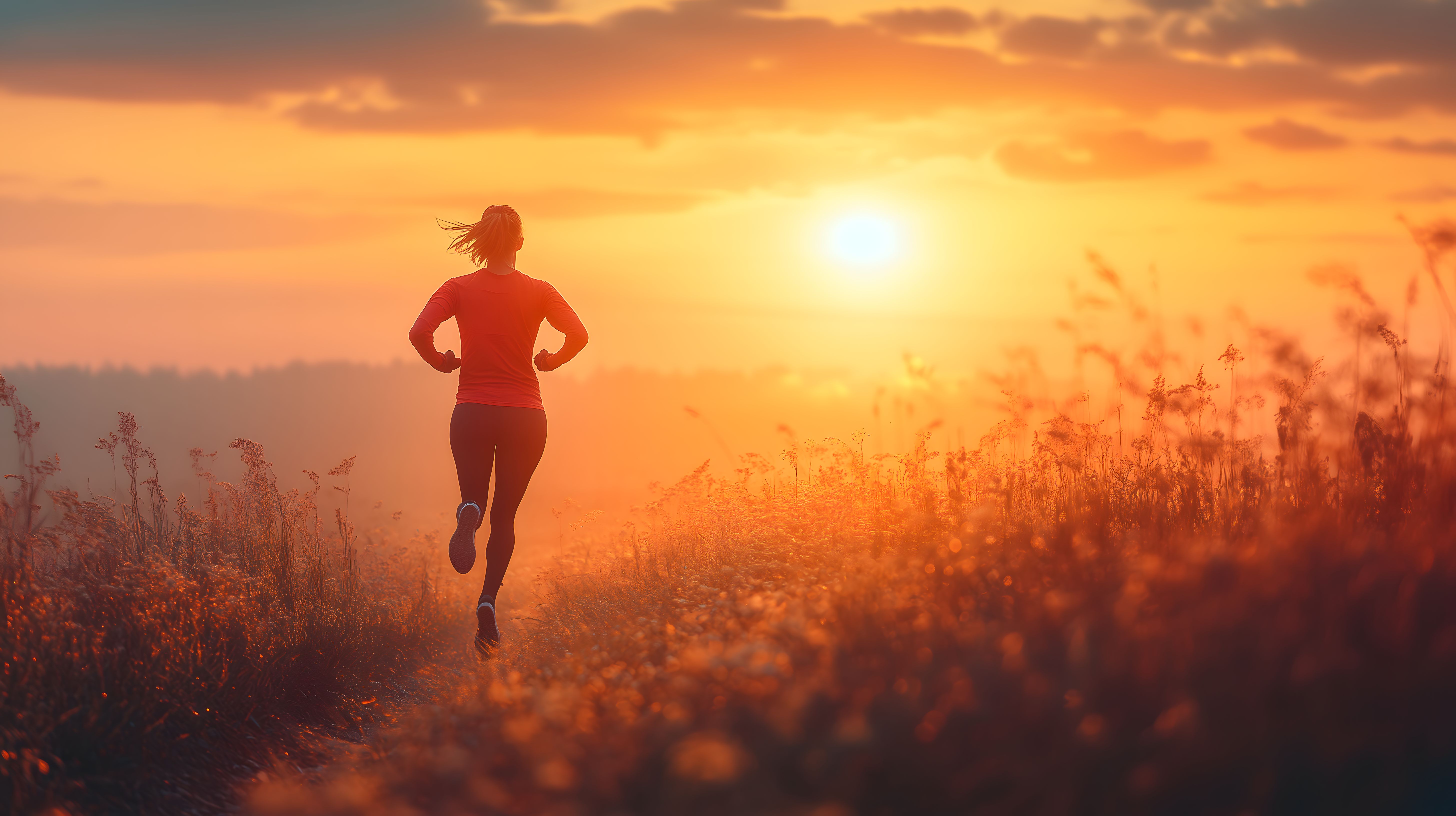 Dieses stimmungsvolle Foto zeigt eine Läuferin, die bei einem Sonnenaufgang durch eine idyllische Wiesenlandschaft joggt. Die Silhouette der Person hebt sich vor dem leuchtenden orangeroten Himmel ab, umgeben von Gräsern und Wildblumen. Das Bild vermittelt Freiheit, Ruhe und Energie zugleich - perfekt als kostenloses Stockfoto für Blogbeiträge zu Themen wie Fitness, Outdoor-Sport oder Gesundheit. Die hochauflösende Aufnahme in warm-stimmungsvoller Farbgebung eignet sich dank der Creative-Commons-Lizenz für vielfältige Verwendungszwecke in Printmedien, Online-Werbung oder Social-Media-Kanälen.