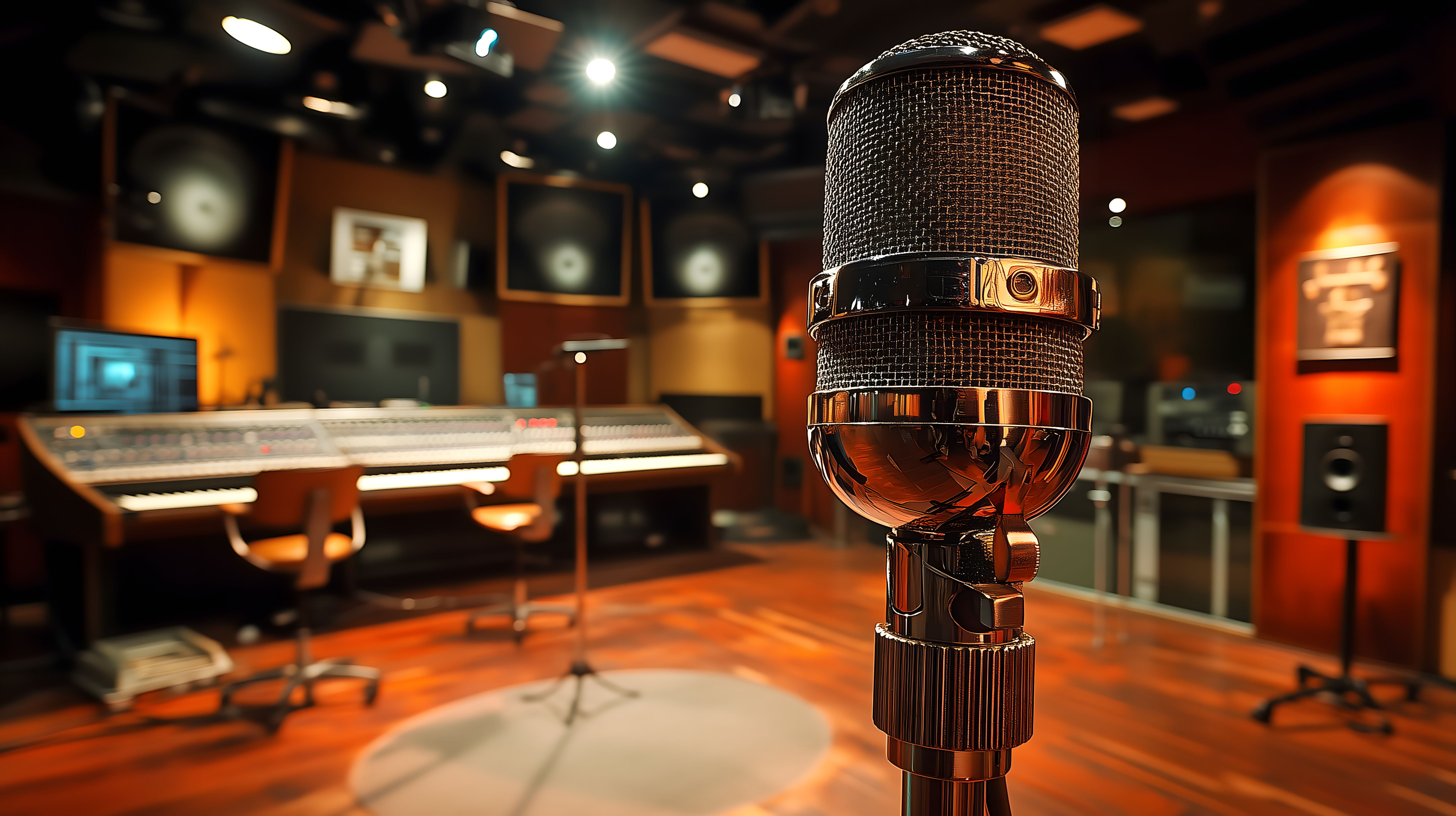 Dieses Foto zeigt ein modernes und professionelles Tonstudio-Umfeld. Im Vordergrund ist ein hochwertiges, großes Studiomikrofon zu sehen, das für hochwertige Audioaufnahmen verwendet wird. Im Hintergrund erkennt man verschiedene Lautsprecher, Bildschirme und weitere Studiotechnik, die für die Musikproduktion und Postproduktion eingesetzt werden können. Die Raumbeleuchtung ist warm und einladend, was eine kreative Stimmung fördert. Dieses Stockfoto eignet sich hervorragend für die Verwendung in Blogbeiträgen, Newslettern oder Werbematerialien rund um das Thema Musikproduktion, Tonstudiotechnik oder Kreativität. Es ist in hoher Auflösung verfügbar und unter einer Creative-Commons-Lizenz frei nutzbar.