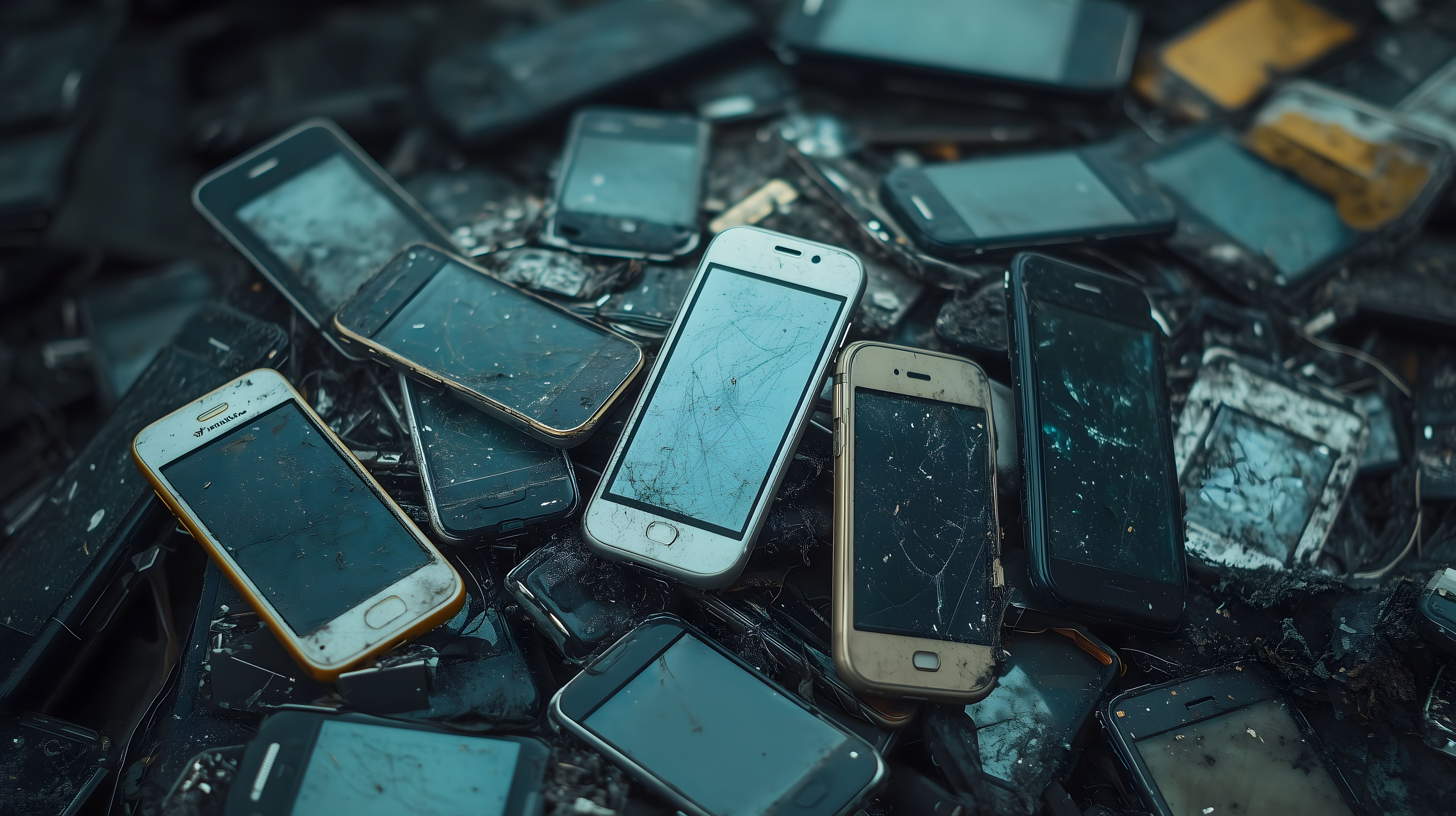 Das Bild zeigt einen großen Haufen zerbrochener und beschädigter Mobiltelefone, die als Elektroschrott gesammelt wurden. Die Geräte liegen in unordentlichen Stapeln und Häufen auf einer dunklen Oberfläche, was eine düstere und triste Stimmung vermittelt. Die Telefone weisen verschiedene Schäden wie zersprungene Displays, fehlende Teile und Verschmutzungen auf, was den Eindruck von Verwahrlosung und Verschwendung hervorruft.