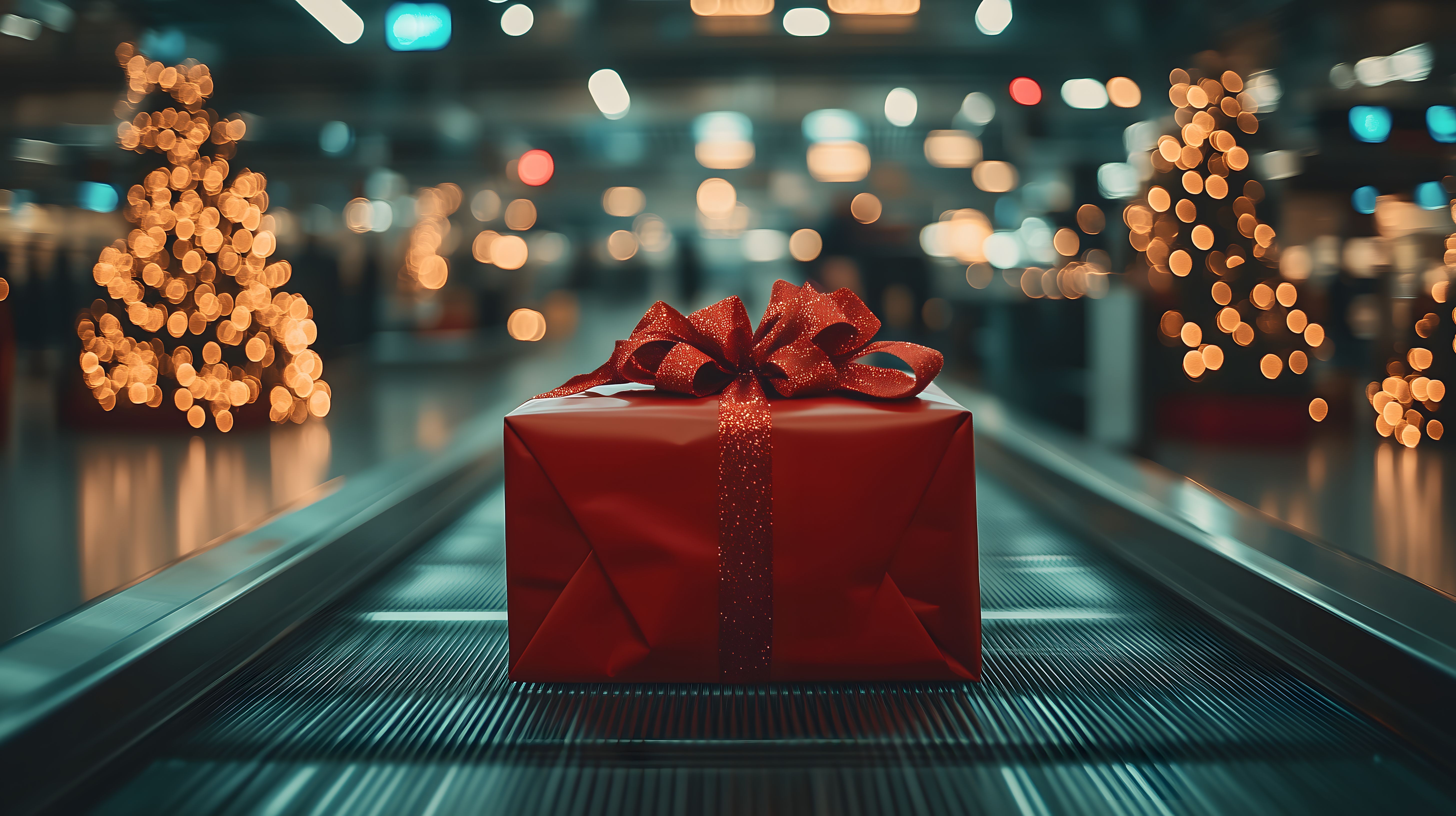 Das Bild zeigt ein festlich verpacktes rotes Weihnachtsgeschenk mit einer glitzernden Schleife, das auf einem Förderband in einer stimmungsvollen, festlichen Umgebung platziert ist. Die Szene wird von Lichterketten mit warmen, verwischten Lichtpunkten umrahmt, die eine gemütliche und besinnliche Atmosphäre schaffen. Das Foto eignet sich hervorragend als hochwertiges Stockfoto für Weihnachts- und Feiertags-Designs, beispielsweise für Blogs, Newsletter, Social-Media-Beiträge oder Werbematerialien. Mit seiner hohen Auflösung und Creative-Commons-Lizenz ist dieses Bild kostenlos für viele Anwendungen nutzbar.