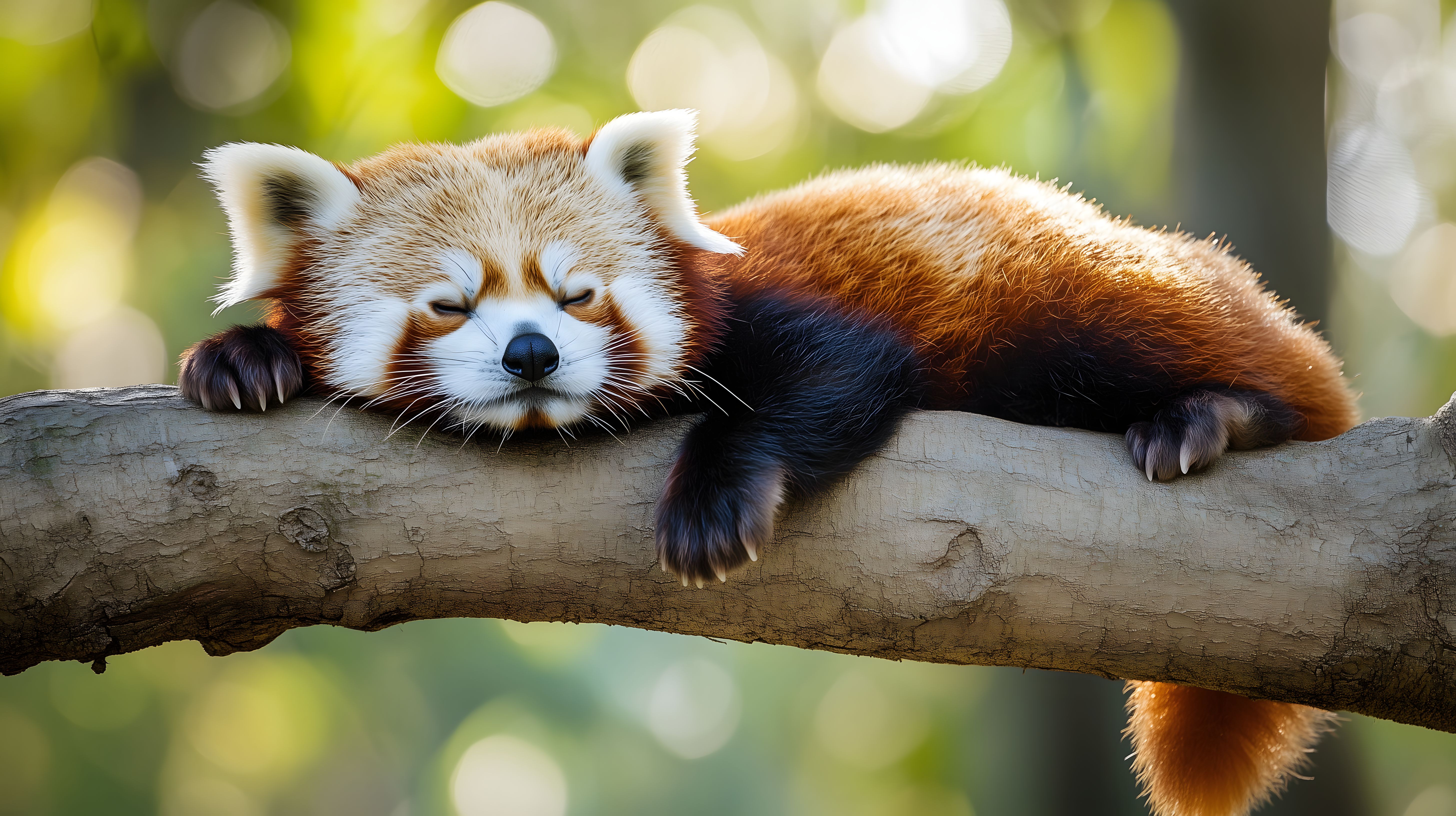 Das Foto zeigt einen ruhenden Roten Panda, der entspannt auf einem Ast in einer naturnahen, grünen Umgebung liegt. Mit halbgeschlossenen Augen und entspannter Körperhaltung wirkt das Tier entspannt und friedlich. Der Hintergrund ist verschwommen, sodass der Fokus ganz auf dem Panda liegt. Die warmen Farbtöne und weichen Konturen verleihen dem Bild eine malerische, fast märchenhafte Anmutung. Dieses hochauflösende Stockfoto in Creative-Commons-Lizenz eignet sich perfekt für Blogs, Newsletter, Social-Media-Beiträge oder Werbeanzeigen, in denen die Schönheit und Ruhe der Natur und der Tiere im Vordergrund stehen soll.