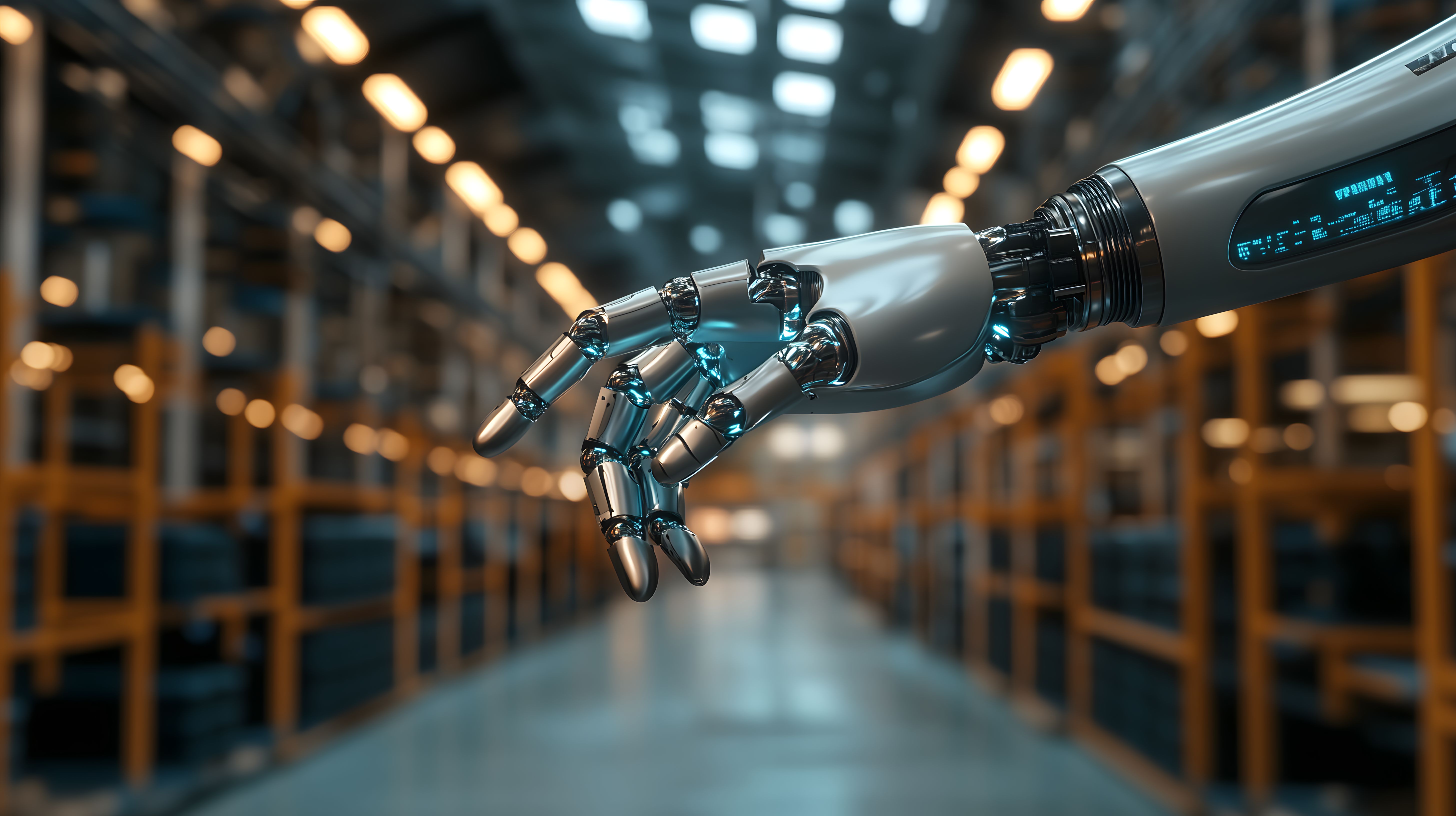 Das Bild zeigt eine detaillierte Roboterhand vor einem modernen, hochautomatisierten Lagerlayout. Die silberne, metallische Hand dominiert den Vordergrund und scheint in die Tiefe des Bildes zu greifen. Im Hintergrund erstrecken sich Regalreihen und Beleuchtungskörper, die eine futuristische, technologiegetriebene Atmosphäre erzeugen. Diese Szene vermittelt den Eindruck einer hochtechnologischen, digitalisierten Produktions- oder Logistikumgebung, wie sie in der Industrie 4.0 zum Einsatz kommt. Als kostenloses Stockfoto in hoher Auflösung und unter einer Creative-Commons-Lizenz eignet sich das Bild hervorragend für Blogbeiträge, Social-Media-Posts oder Werbematerialien rund um die Themen Automatisierung, Digitalisierung und Zukunftstechnologien.
