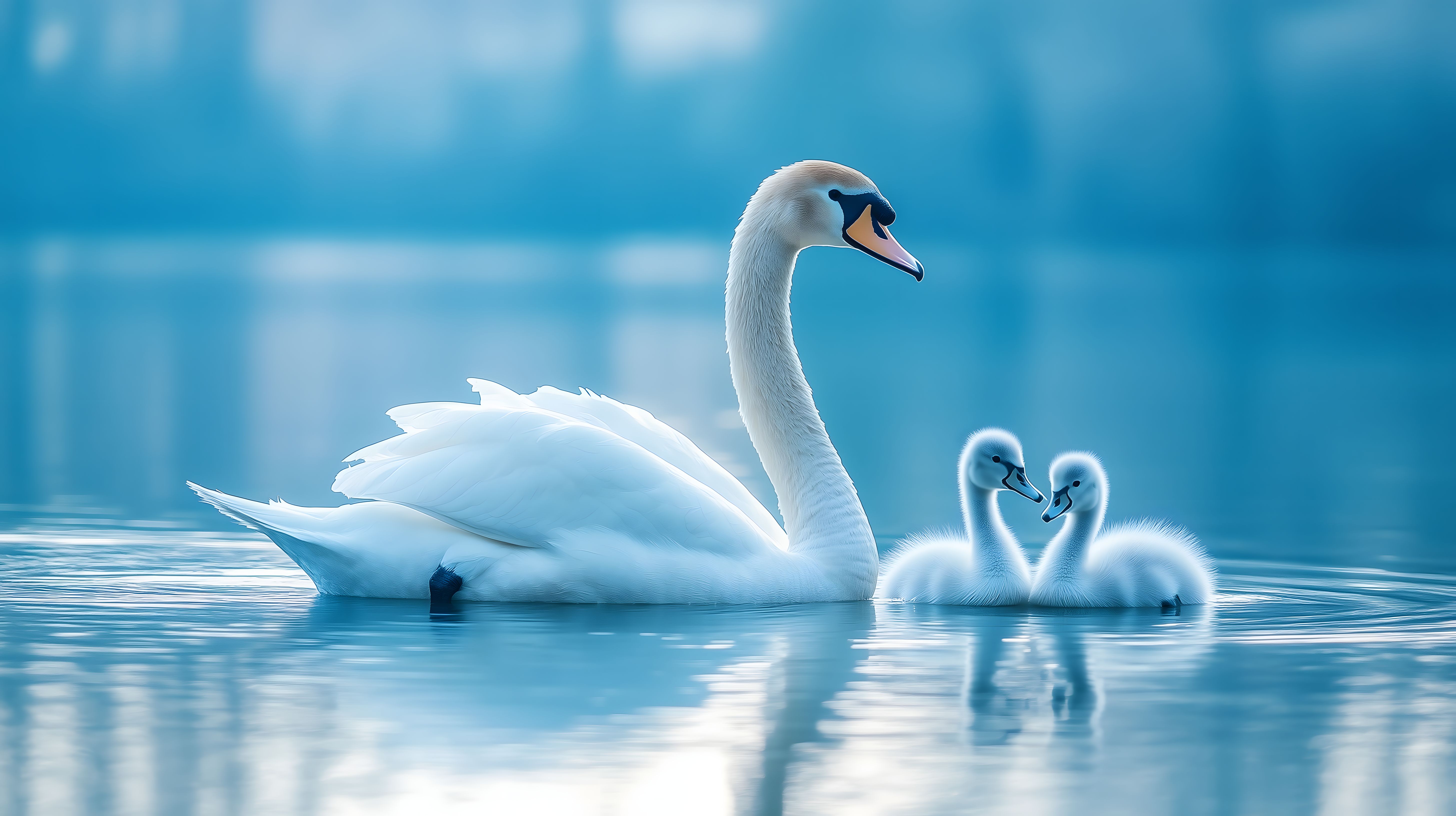 Das Bild zeigt eine Schwanenfamilie auf einem ruhigen, blaugrünen Gewässer. Der Schwan steht im Vordergrund, während seine beiden Jungtiere elegant neben ihm schwimmen. Die Szene strahlt Frieden, Harmonie und Natürlichkeit aus. Die pastelligen Blautöne, die sich im Wasser spiegeln, verleihen der Aufnahme eine beruhigende, fast surreale Atmosphäre. Dieses Stockfoto in hoher Auflösung eignet sich hervorragend für den Einsatz in Blogs, Newslettern, Social-Media-Beiträgen oder Werbematerialien, bei denen eine stimmungsvolle, naturverbundene Ästhetik gefragt ist. Es steht unter der Creative-Commons-Lizenz zur kostenlosen Nutzung zur Verfügung.