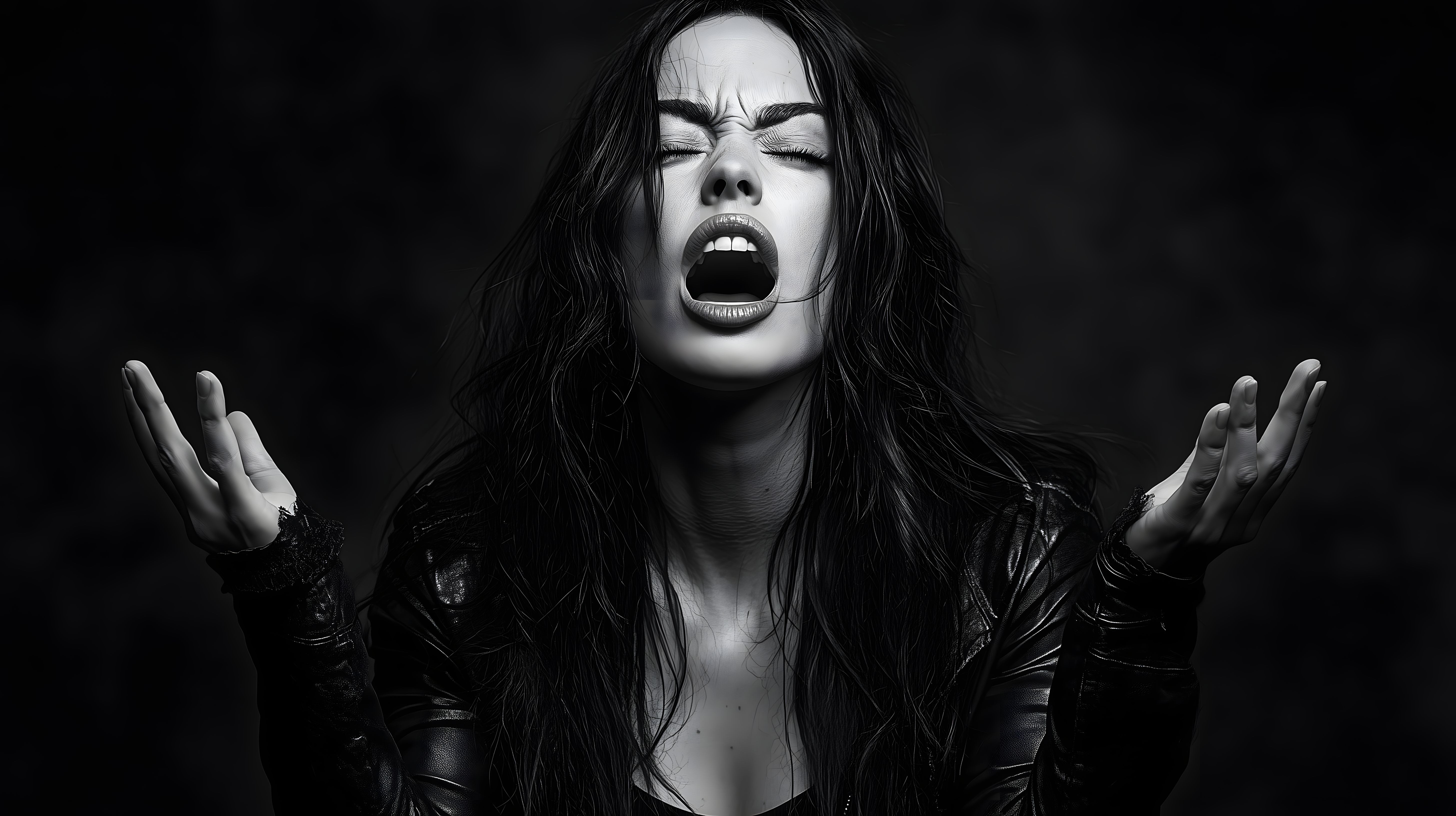 Dieses eindrucksvolle Schwarzweißfoto zeigt das Gesicht einer Frau im Nahaufnahme-Format. Die Person hat lange, dunkle Haare, die dynamisch nach oben und zur Seite wehen. Der Gesichtsausdruck ist von Wut und Leidenschaft geprägt - die Frau hat den Mund weit aufgerissen und die Augen fest geschlossen. Das kontraststarke Bild in hochqualitativer Auflösung vermittelt eine dramatische und intensive Stimmung. Es eignet sich hervorragend für den Einsatz in Blogs, Social-Media-Beiträgen, Newslettern oder Werbematerialien, in denen starke Emotionen und Dramatik vermittelt werden sollen. Das Foto ist als kostenloses Stockfoto unter Creative-Commons-Lizenz verfügbar.