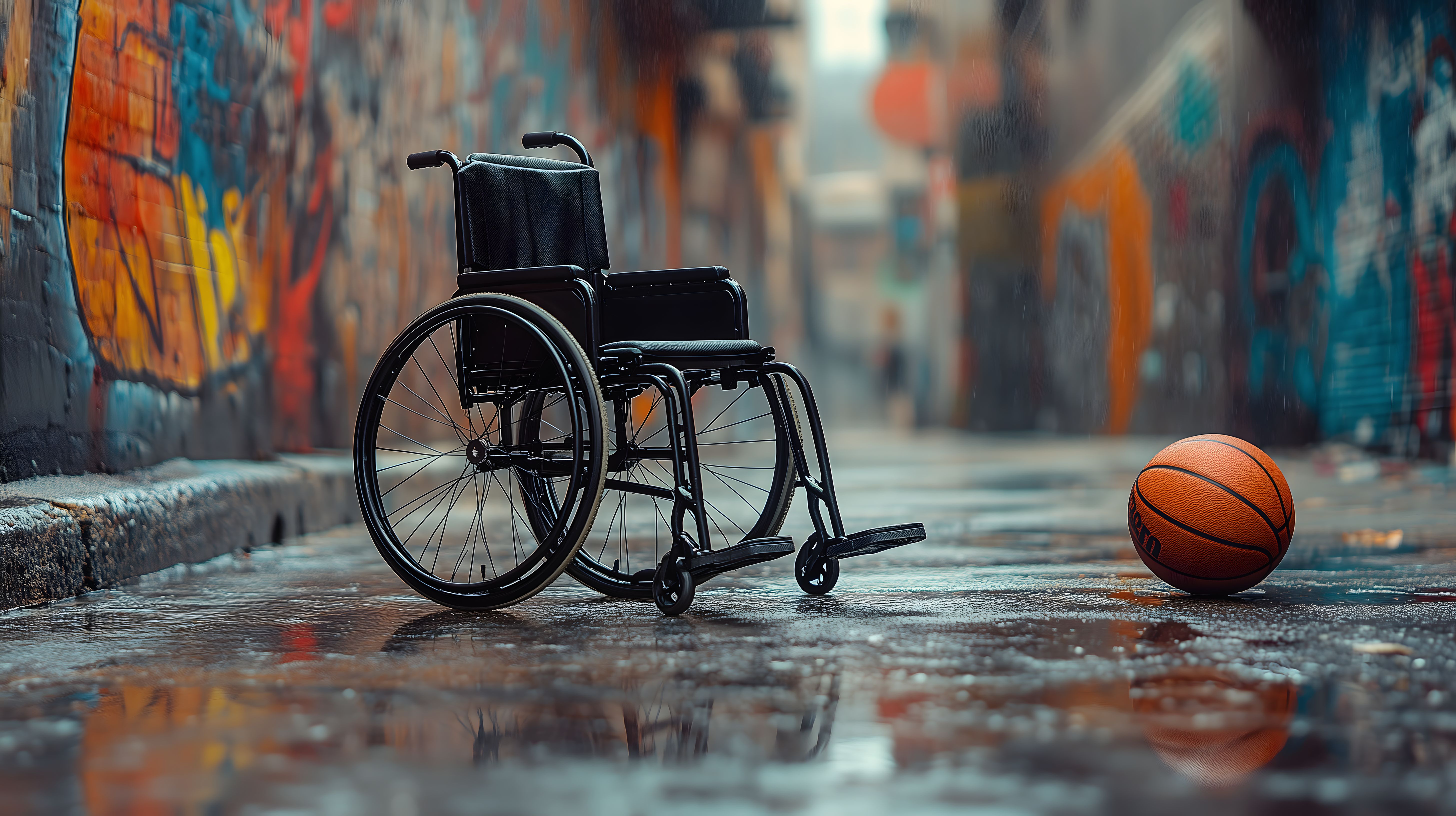 Das Bild zeigt einen leeren Rollstuhl, der in einer bunten, urban geprägten Gasse steht. Neben dem Rollstuhl liegt ein oranger Basketball auf dem feuchten, reflektierenden Boden. Die Umgebung ist von farbenfrohen Graffiti-Motiven an den Wänden geprägt, was eine lebendige, aber auch grungy Atmosphäre schafft. Das Bild thematisiert Inklusion und Barrierefreiheit, indem es den Rollstuhl als Symbol für Menschen mit Behinderungen in den Fokus rückt und so auf deren Teilhabe am gesellschaftlichen Leben und Sport aufmerksam macht.