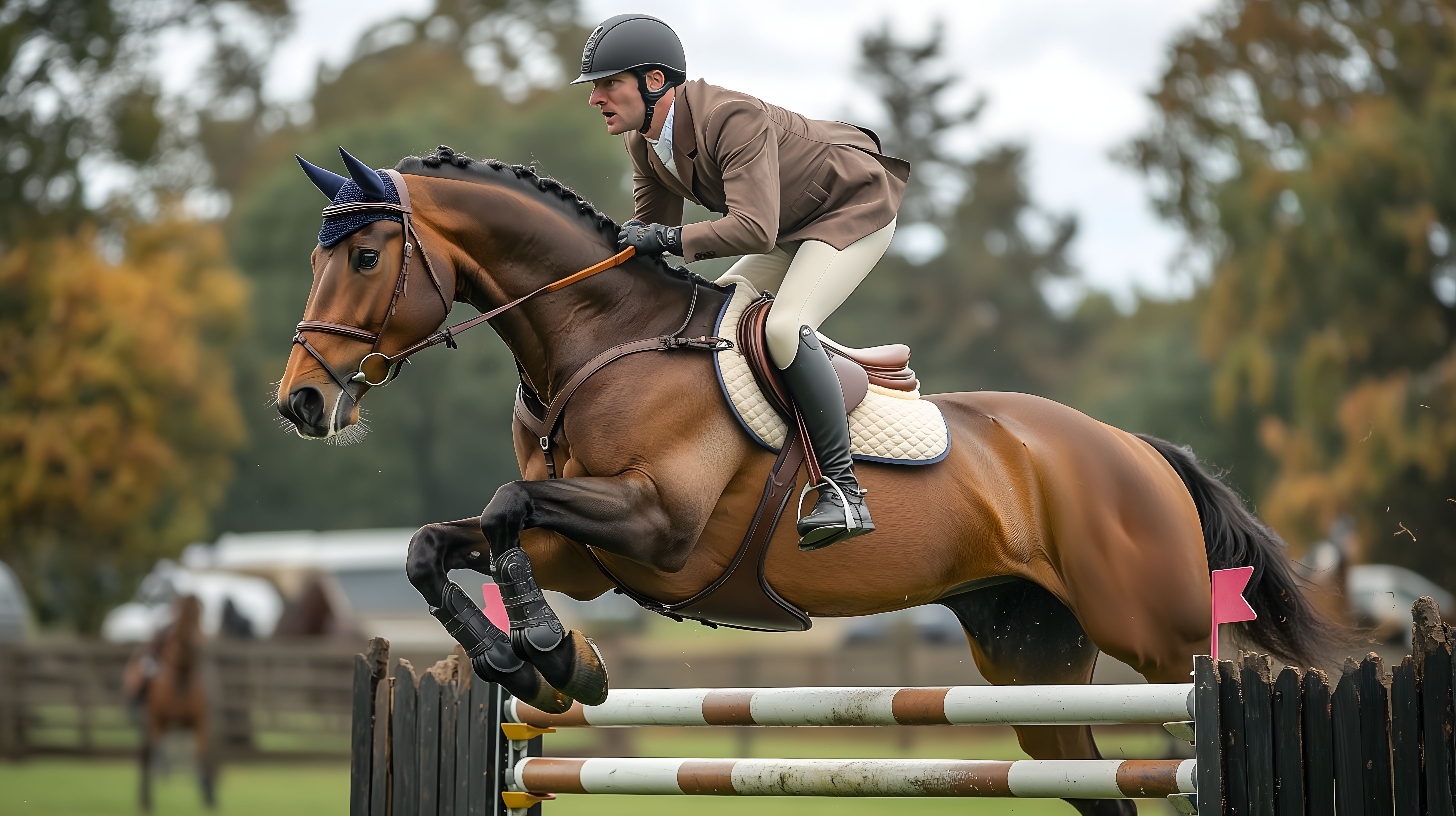 Das Foto zeigt einen Springreiter, der auf seinem Pferd über ein Hindernis im Wald springt. Der Reiter ist konzentriert und sitzt aufrecht im Sattel, während das Pferd elegant über das Hindernis fliegt. Die Szene spielt sich vor einer herbstlichen Waldlandschaft ab, was dem Foto eine natürliche und stimmungsvolle Atmosphäre verleiht. Das Bild eignet sich hervorragend für die Verwendung in Blogs, Newslettern, Social-Media-Kanälen oder Werbematerialien rund um den Reitsport, Outdoor-Aktivitäten oder allgemein die Natur. Dieses hochauflösende Stockfoto steht unter der Creative-Commons-Lizenz zur kostenlosen Nutzung zur Verfügung.