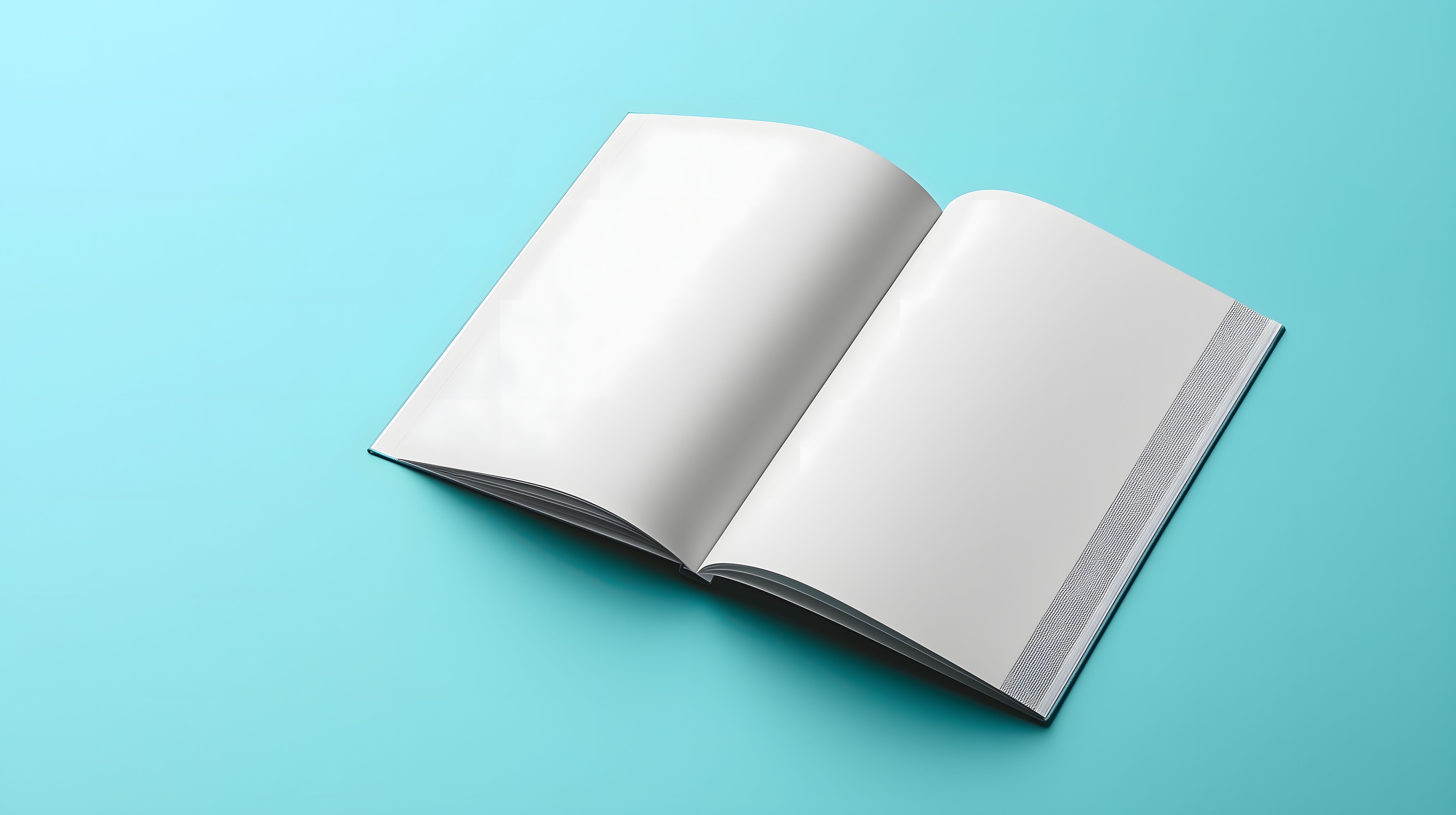 Das Bild zeigt eine offene Broschüre oder ein Magazin mit leeren weißen Seiten auf einem türkisfarbenen, minimalistischen Hintergrund. Die Broschüre liegt zentral im Bild und ist in einer natürlichen Perspektive dargestellt. Durch die klaren Formen und die einheitliche Farbgebung wirkt das Motiv hochwertig und edel. Es eignet sich hervorragend als Mockup-Vorlage für die Präsentation von Werbe-, Editorial- oder Designprojekten, sei es in Blogbeiträgen, Newslettern, Social-Media-Posts oder der klassischen Werbung. Als kostenloses Stockfoto in hoher Auflösung und unter Creative-Commons-Lizenz kann es vielseitig eingesetzt werden.