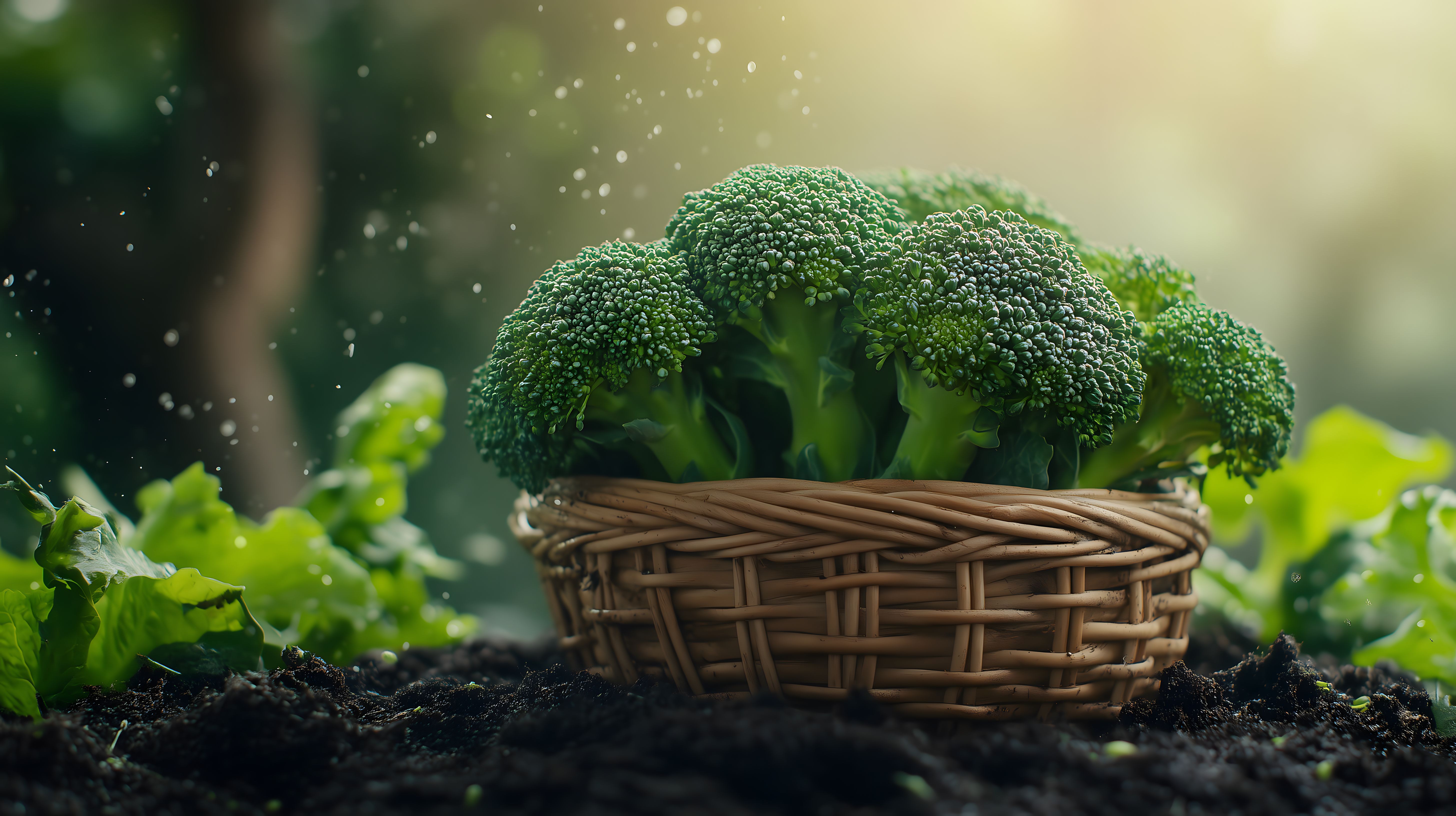 Dieses Foto zeigt einen Korb voller frischer, grüner Brokkoli-Knospen, die auf dunkler Erde stehen. Die Brokkoli-Köpfe sind von Wassertropfen bedeckt und stehen im Kontrast zum hellen, weichen Sonnenlicht, das den Hintergrund erleuchtet. Das Bild vermittelt ein Gefühl von Natürlichkeit, Frische und Gesundheit. Es eignet sich ideal als kostenloses Stockfoto für Blogs, Newsletter, Social-Media-Beiträge oder Werbeanzeigen mit Themen wie Ernährung, Landwirtschaft oder Nachhaltigkeit. Die hohe Auflösung und Creative-Commons-Lizenz machen dieses Foto frei nutzbar.