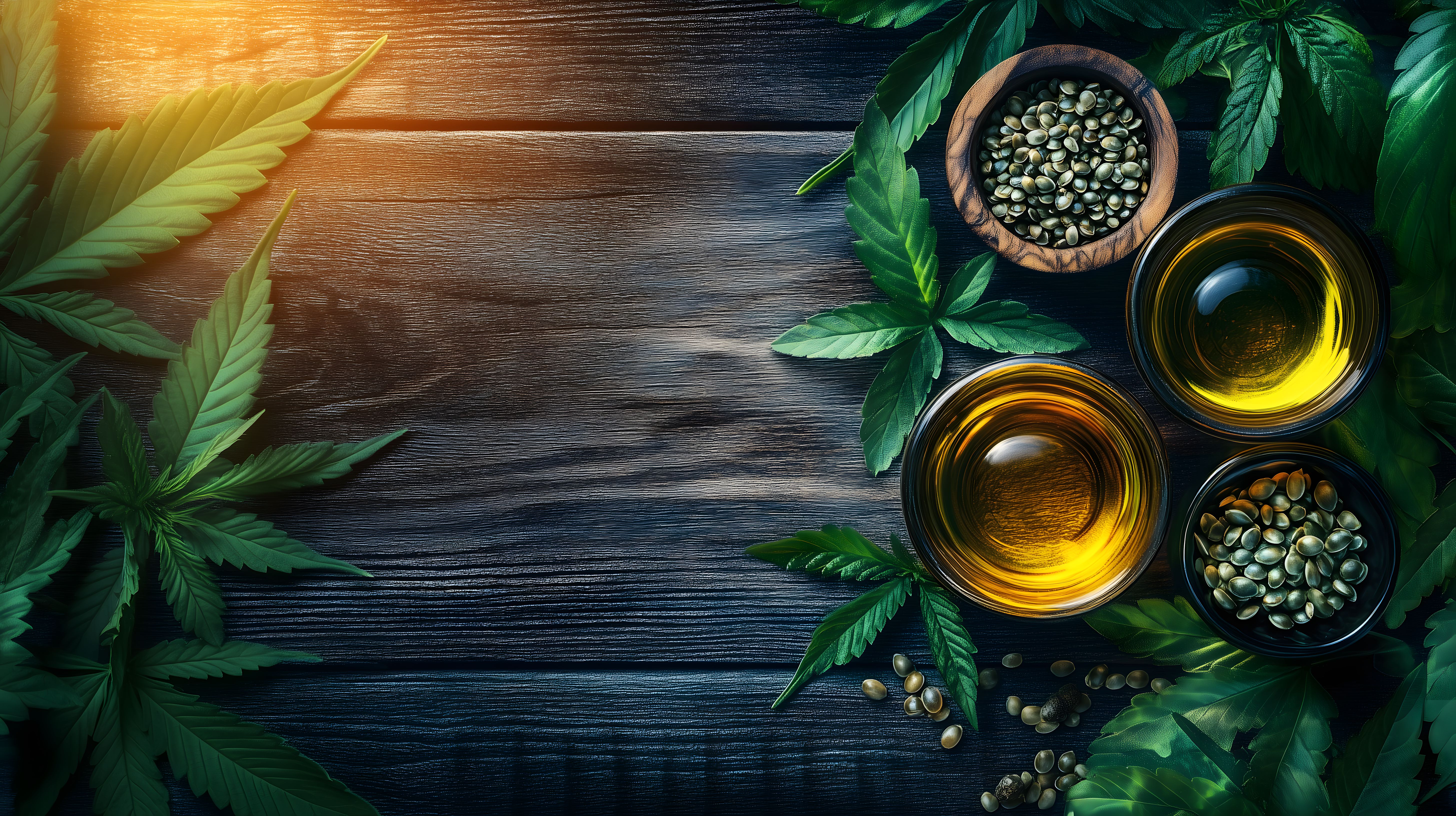 Dieses Foto zeigt eine Auswahl an natürlichen Hanfprodukten auf einem rustikalen Holzhintergrund. Im Zentrum befinden sich mehrere Glasgefäße, die mit gelbem Hanföl sowie grünen Hanfsamen gefüllt sind. Umrahmt werden sie von frischen, grünen Hanfblättern, die der Szene einen natürlichen, tropischen Charakter verleihen. Die warmen Farben, die natürliche Optik und die schlichte Komposition machen dieses Bild zu einem idealen Hintergrund für Webseiten, Social-Media-Posts, Werbe- und Marketingmaterialien rund um Naturkosmetik, Lebensmittel, Wellness und Gesundheit. Als kostenloses Stockfoto in hochauflösender Qualität unter Creative-Commons-Lizenz eignet es sich hervorragend für redaktionelle und kommerzielle Zwecke.