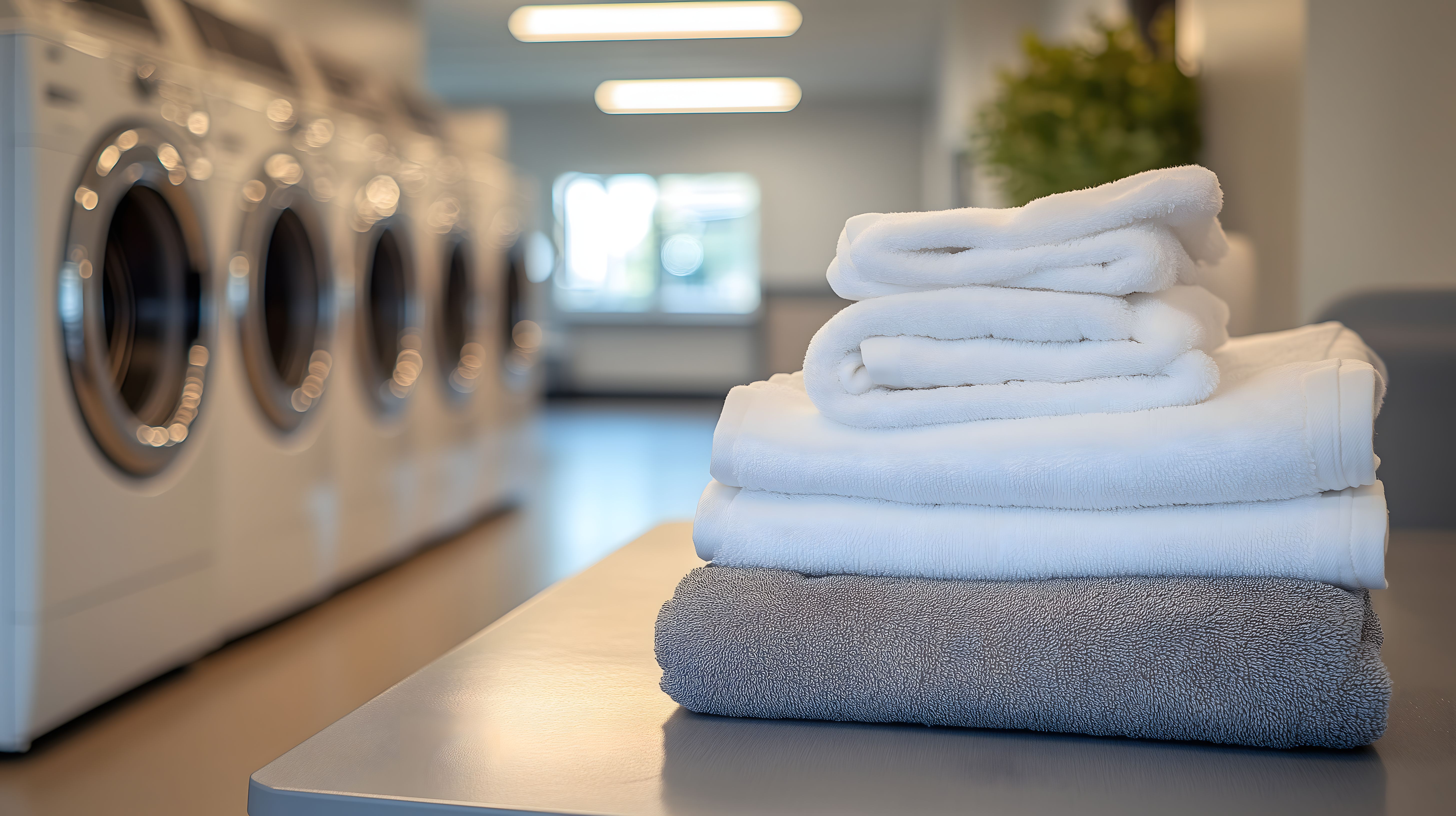 Dieses Foto zeigt einen sauberen, modernen Waschsalon mit Waschmaschinen und gestapelten, frisch gewaschenen Handtüchern auf einer Ablage. Die Einrichtung wirkt minimalistisch und aufgeräumt, mit hellen Farben wie Blau und Grau. Das Bild vermittelt ein Gefühl von Sauberkeit, Ordnung und Komfort und wäre ideal für die Verwendung in Blogbeiträgen, Newslettern oder Werbematerialien zum Thema Wäscherei, Haushaltsführung oder Dienstleistungen. Als kostenloses Stockfoto in hoher Auflösung und unter Creative-Commons-Lizenz ist es frei verwendbar.