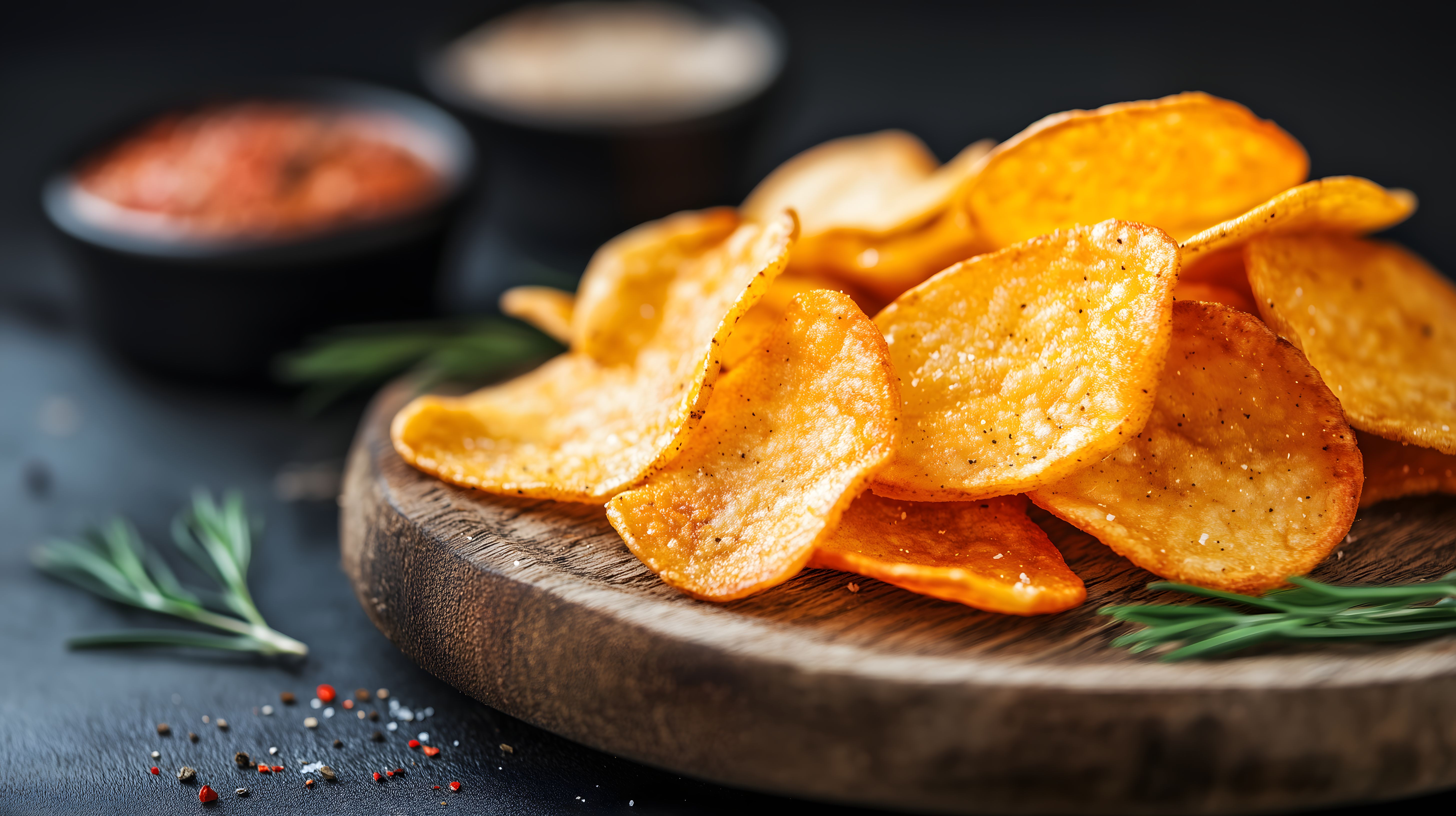 Dieses Foto zeigt eine Nahaufnahme von knusprigen, goldbraunen Kartoffelchips, die auf einem rustikalen, hölzernen Schneidebrett angerichtet sind. Die Chips sind mit Gewürzen und etwas Olivenöl verfeinert, was ihnen eine appetitanregende Optik verleiht. Die Komposition ist stimmungsvoll, mit einer dunklen Hintergrundfarbe, die den Fokus auf die sättigenden Kartoffelchips lenkt. Dieses Stockfoto eignet sich hervorragend für die Verwendung in Rezeptbeiträgen, auf Foodblogs oder in der Lebensmittelwerbung, um den Appetit der Betrachter anzuregen. Das hochauflösende Bild ist kostenlos und unter Creative-Commons-Lizenz verfügbar.