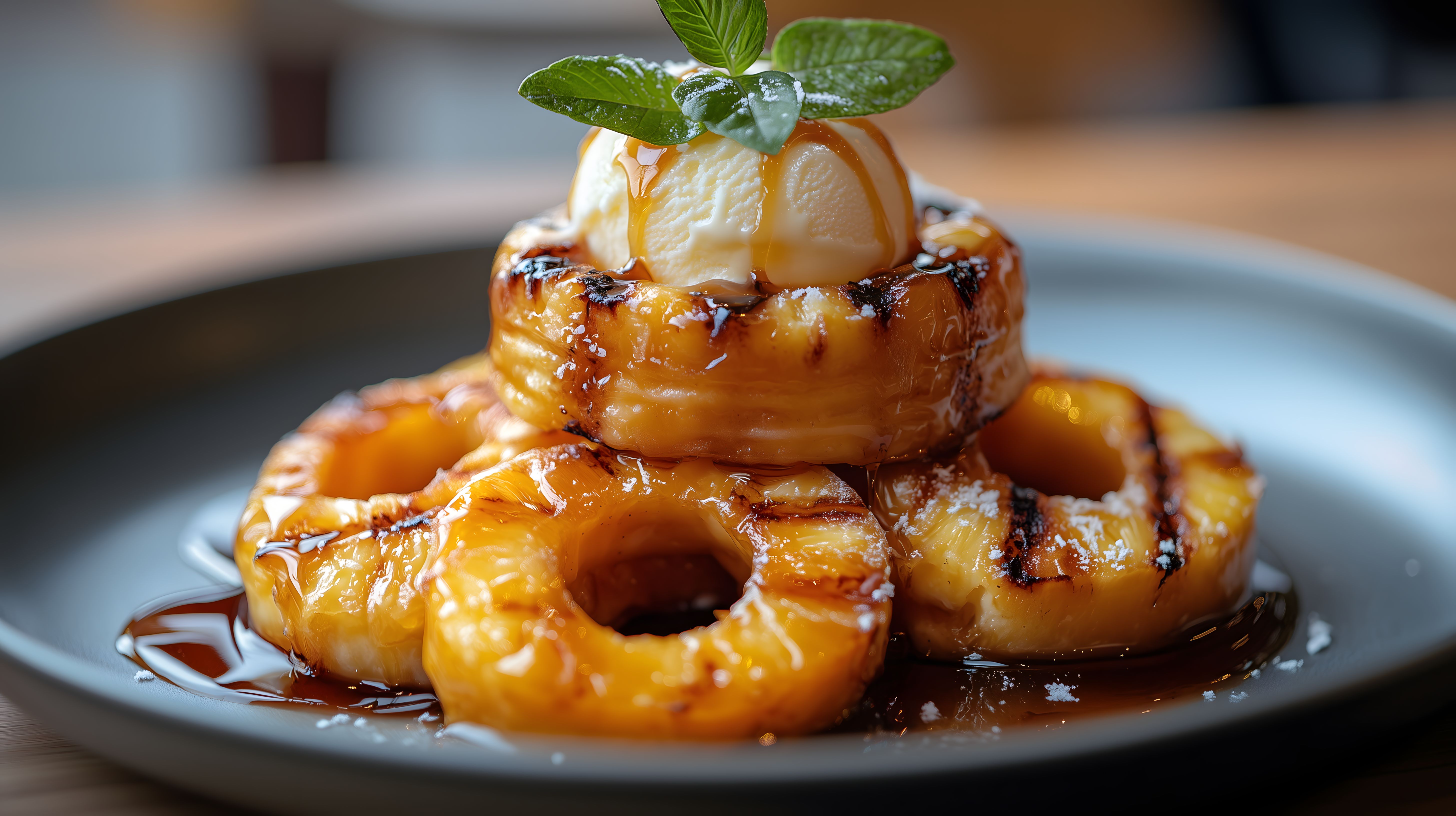 Das Foto zeigt eine köstliche Komposition aus gegrillten Ananasringen, einer Kugel Vanilleeis und einer delikaten Karamellsauce. Die Ananasscheiben sind leicht karamellisiert und verleihen dem Gericht eine wunderbare Süße und einen fruchtigen Akzent. Die Vanillekugel auf der Spitze fügt eine cremige Textur und einen erfrischenden Kontrast hinzu. Die Anordnung der Zutaten auf dem Teller schafft eine appetitliche und harmonische Optik. Dieses Stockfoto in hoher Auflösung eignet sich hervorragend für Rezepte, Reiseblogbeiträge, Food-Posts in sozialen Medien oder zur Verwendung in Werbematerialien. Es steht unter einer Creative-Commons-Lizenz zur Verfügung.