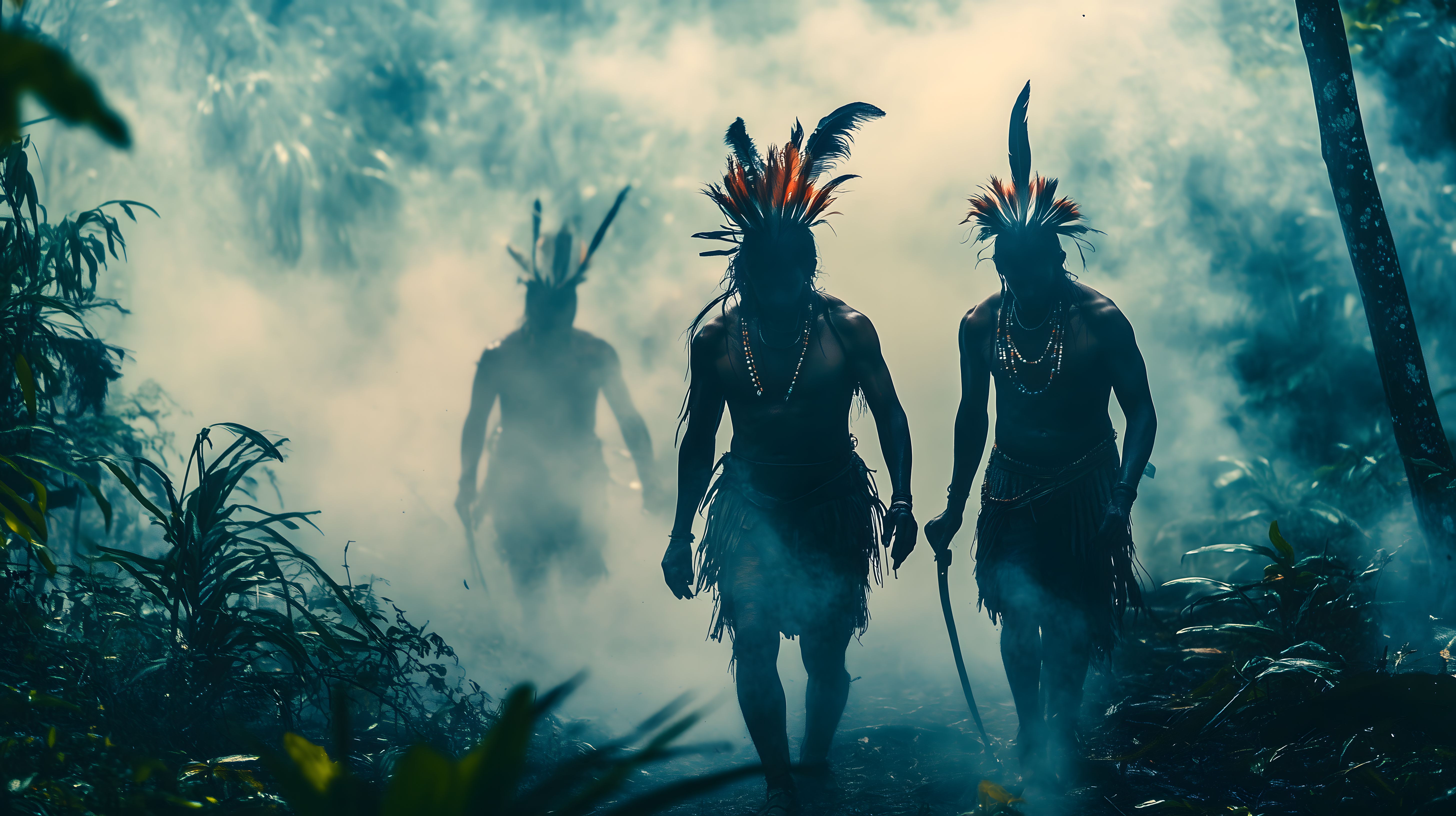 Das Bild zeigt die Silhouetten von zwei Stammestänzern, die in einem nebligen Urwald zu sehen sind. Die Tänzer tragen farbenfrohe, traditionelle Kostüme mit Federschmuck auf ihren Köpfen und geben der Szene eine mystische und spirituelle Ausstrahlung. Die Umgebung ist von üppigem Blattwerk und Nebelschwaden geprägt, was dem Bild eine natürliche, fast surreale Atmosphäre verleiht. Dieses hochwertige Stockfoto eignet sich hervorragend für Verwendung in Blogbeiträgen, Newslettern, Social-Media-Posts oder Werbematerialien, die eine exotische, naturverbundene und kulturell inspirierende Stimmung transportieren möchten. Es ist in hoher Auflösung und unter einer Creative-Commons-Lizenz für kostenlose, kommerzielle Nutzung verfügbar.