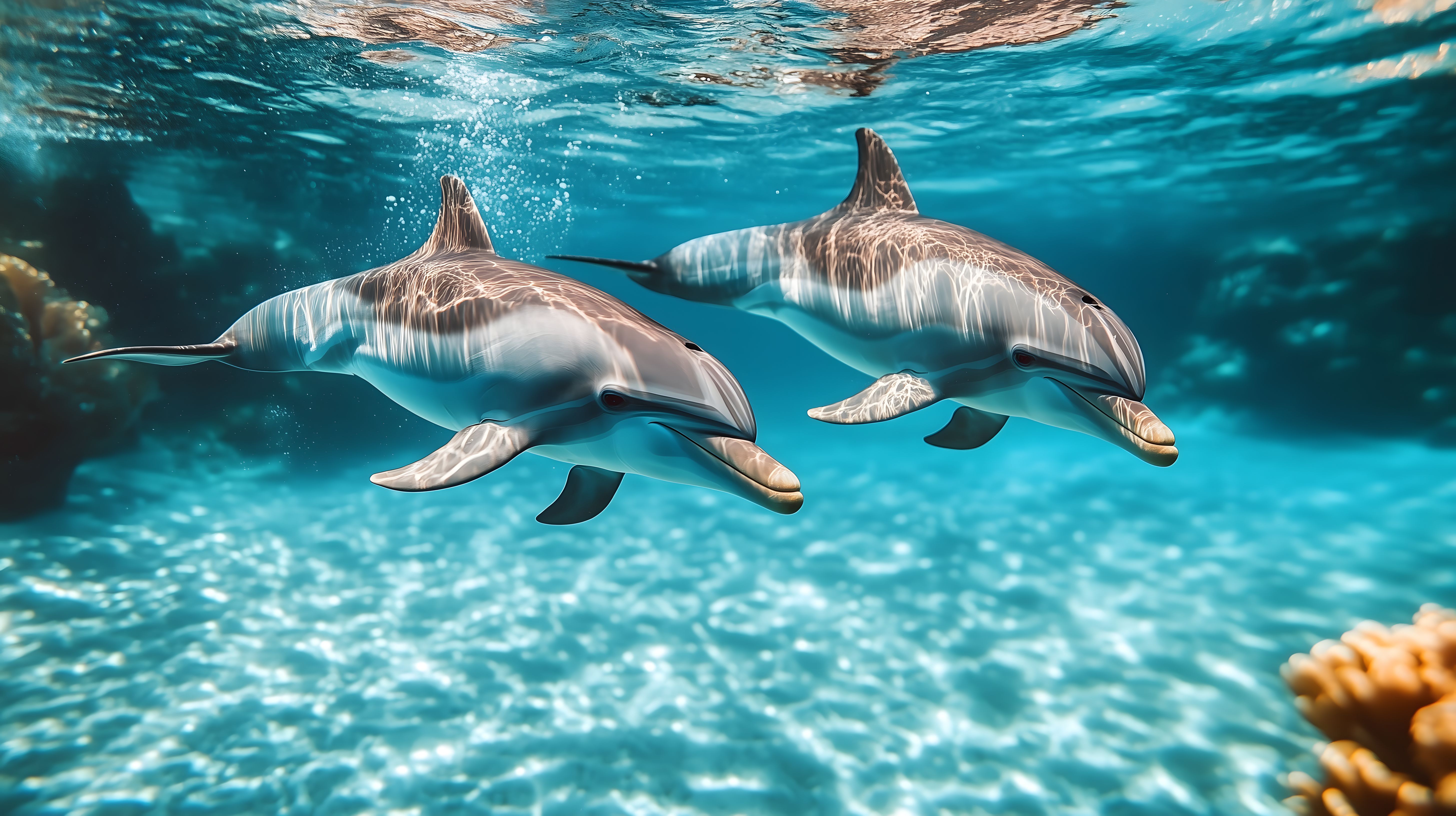 Das Bild zeigt zwei elegant schwimmende Delfine in kristallklarem, türkisfarbenem Meerwasser. Die Tiere scheinen mühelos durch die Wellen zu gleiten, ihre Bewegungen wirken fließend und natürlich. Im Hintergrund sind vereinzelt Korallenstrukturen zu erkennen, die dem Bild eine tropische Unterwasserkulisse verleihen. Die Szene strahlt Ruhe und Freiheit aus und lässt den Betrachter in die Welt der Meeresbewohner eintauchen. Dieses hochauflösende, kostenlose Stockfoto unter Creative-Commons-Lizenz ist ideal für den Einsatz in Blogs, Newslettern, Social-Media-Kanälen oder Werbekampagnen rund um Reisen, Naturschutz oder das Meeresleben.