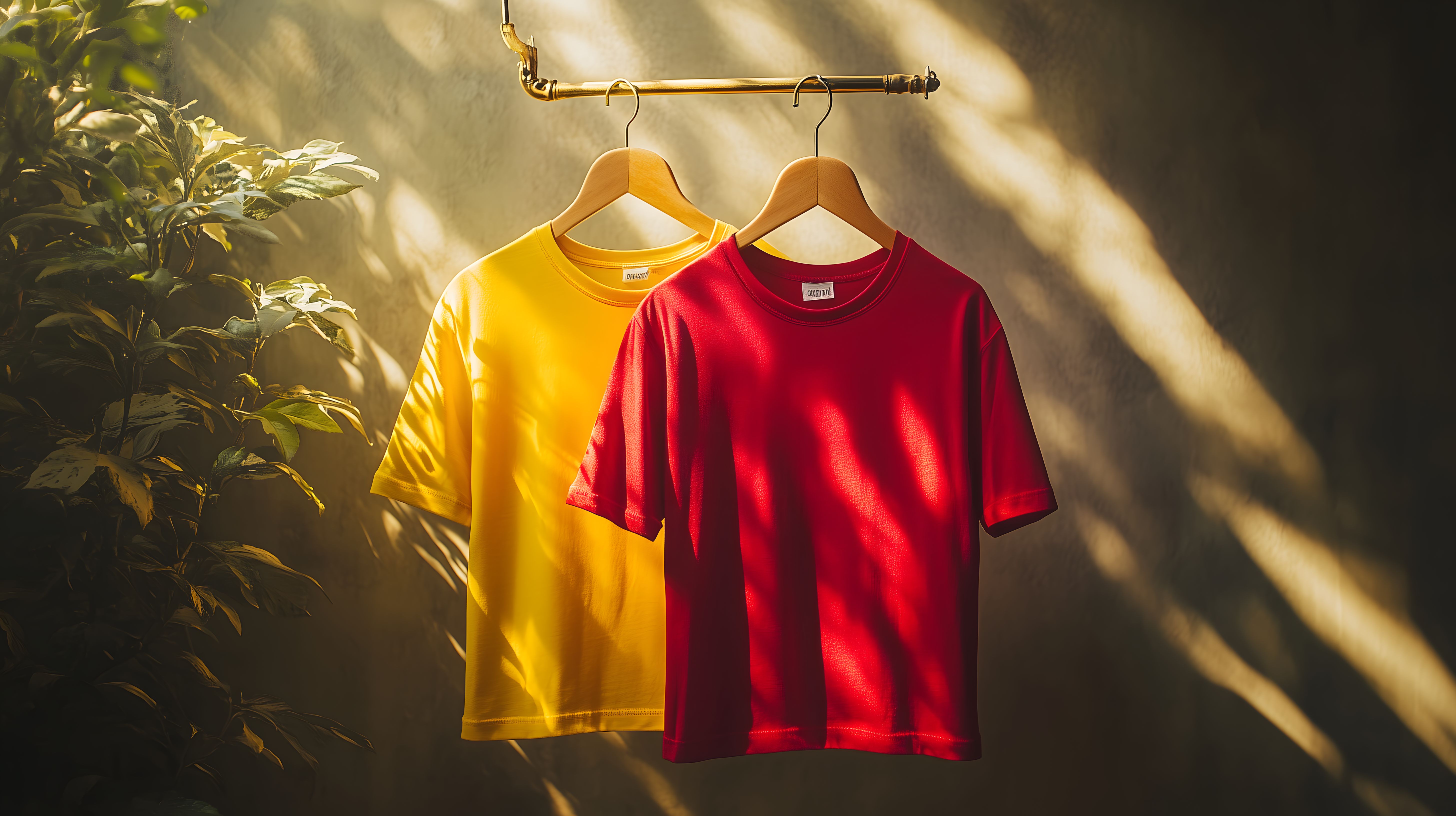 Dieses farbenfrohe Foto zeigt zwei T-Shirts in leuchtend gelb und rot, die an einem Kleiderbügel im warmen Sonnenlicht hängen. Die Shirts kontrastieren perfekt mit den grünen Blättern im Hintergrund, was eine frische, sommerliche Stimmung erzeugt. Das Bild eignet sich hervorragend für den Einsatz in Blogbeiträgen, Newslettern, Social-Media-Posts oder Werbematerialien rund um Mode, Textilien und sommerliche Themen. Dieses hochauflösende Stockfoto ist kostenlos und unter einer Creative-Commons-Lizenz verfügbar.