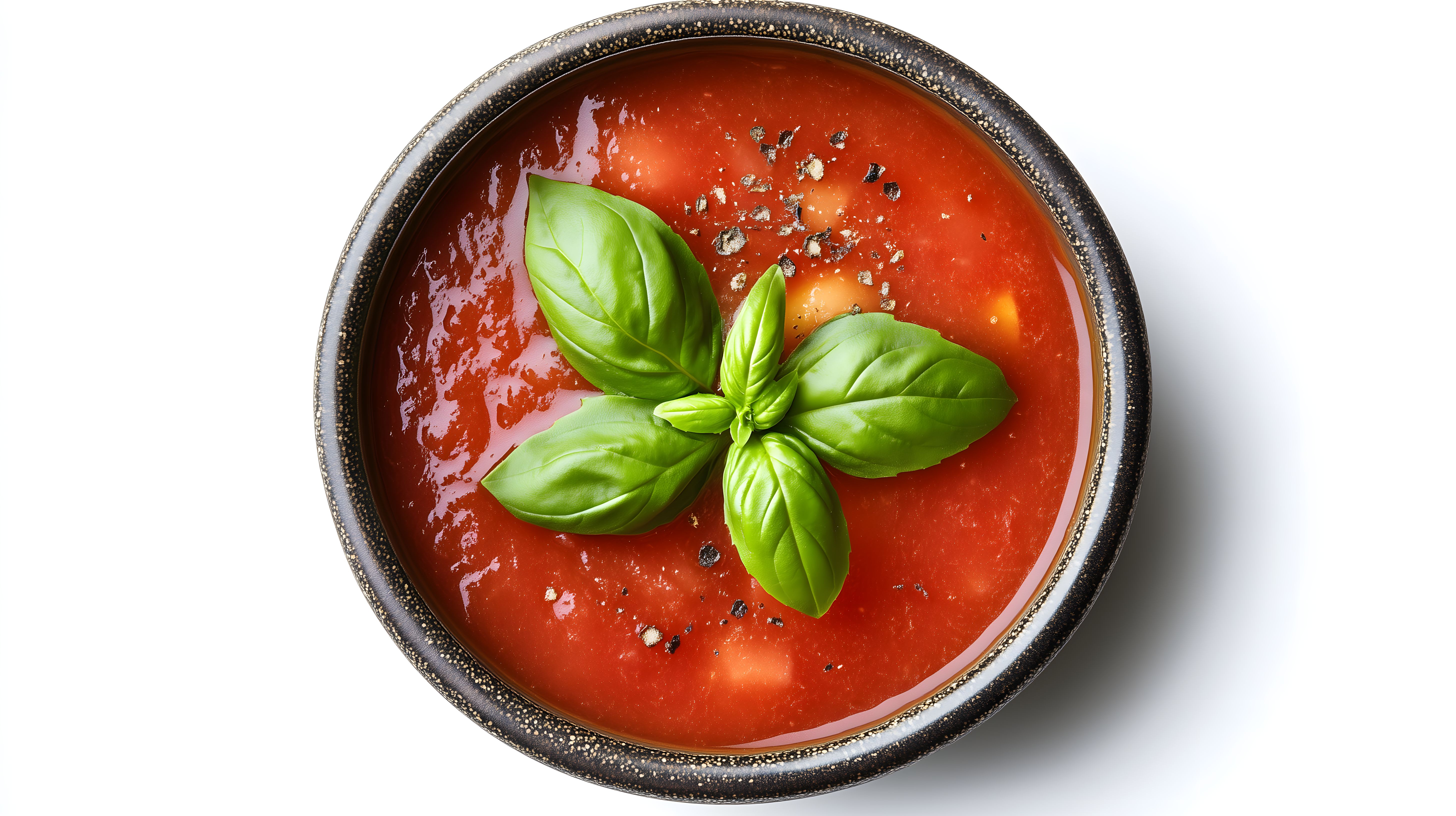 Dieses Bild zeigt eine köstliche, frisch zubereitete Tomatensuppe in einer rustikal anmutenden Keramikschale. Die tiefrote Suppe ist mit grünen Basilikumblättern dekoriert, die dem Gericht eine leckere, frische Note verleihen. Die Suppe ist mit Salz und Pfeffer gewürzt, was den Geschmack abrundet. Das Bild vermittelt eine natürliche, appetitliche Optik und könnte ideal für Rezeptblogbeiträge, Restaurantmenüs, Catering-Angebote oder Lebensmittelpräsentationen in sozialen Medien eingesetzt werden. Dieses hochauflösende Stockfoto steht unter einer Creative-Commons-Lizenz zur Verfügung und kann daher kostenfrei genutzt werden.
