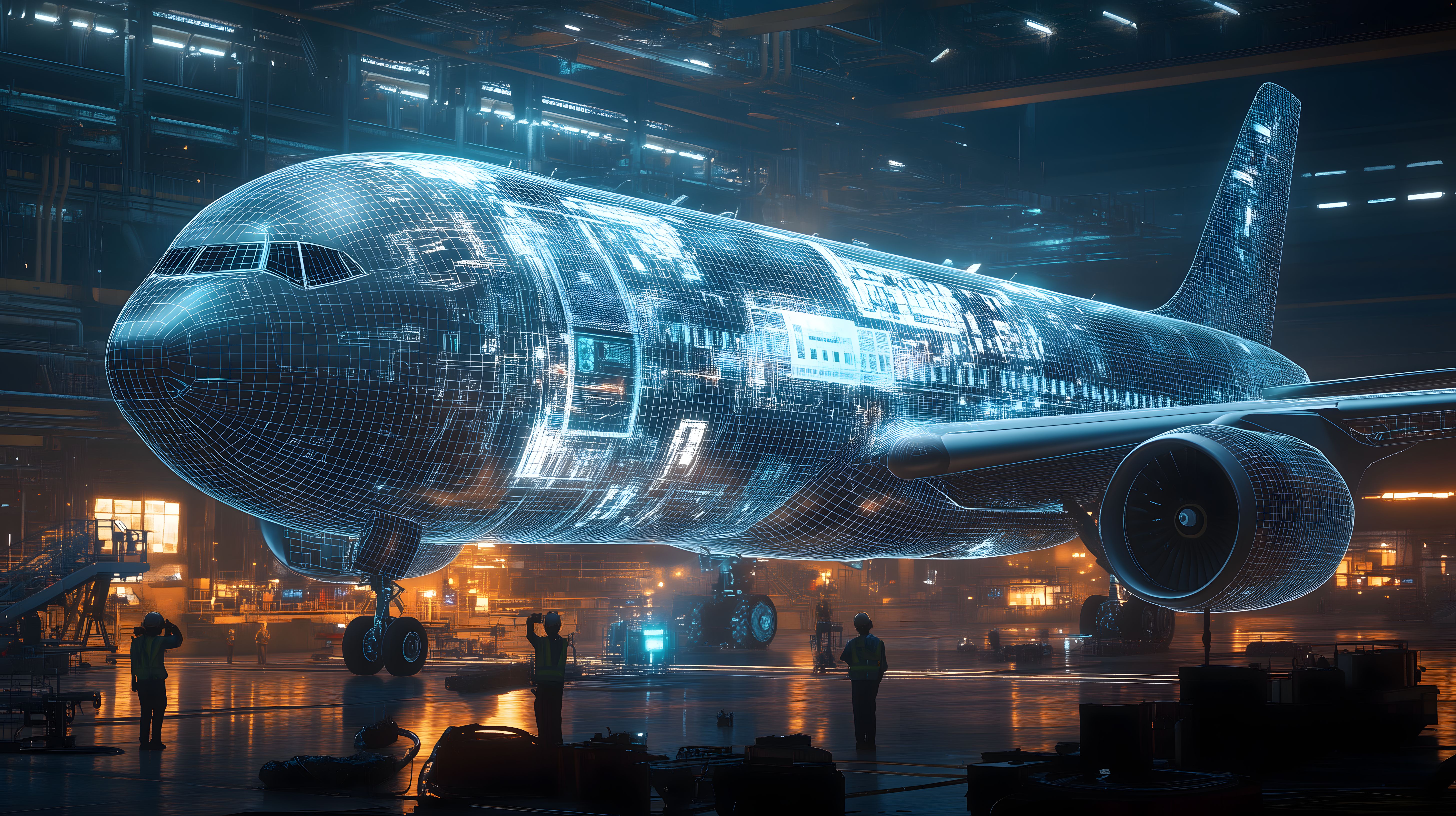 Dieses beeindruckende Bild zeigt einen futuristischen Flugzeugprototyp, der als dreidimensionales Hologramm in einer modernen Industriehalle präsentiert wird. Die detaillierten Konturen des Flugzeugs werden durch ein Gitter aus blau leuchtenden Linien dargestellt, die eine hochtechnologische und innovative Ästhetik verleihen. Die Arbeiter in der Halle sind in den Hintergrund gerückt, wodurch der Fokus ganz auf dem digitalen Modell liegt. Dieses Bild eignet sich hervorragend für den Einsatz in Blogbeiträgen, Newslettern oder sozialen Medien, die sich mit Themen wie Technologie, Fortschritt und Zukunftsvisionen beschäftigen. Als hochauflösendes, kostenloses Stockfoto unter Creative-Commons-Lizenz bietet es vielfältige Verwendungsmöglichkeiten.