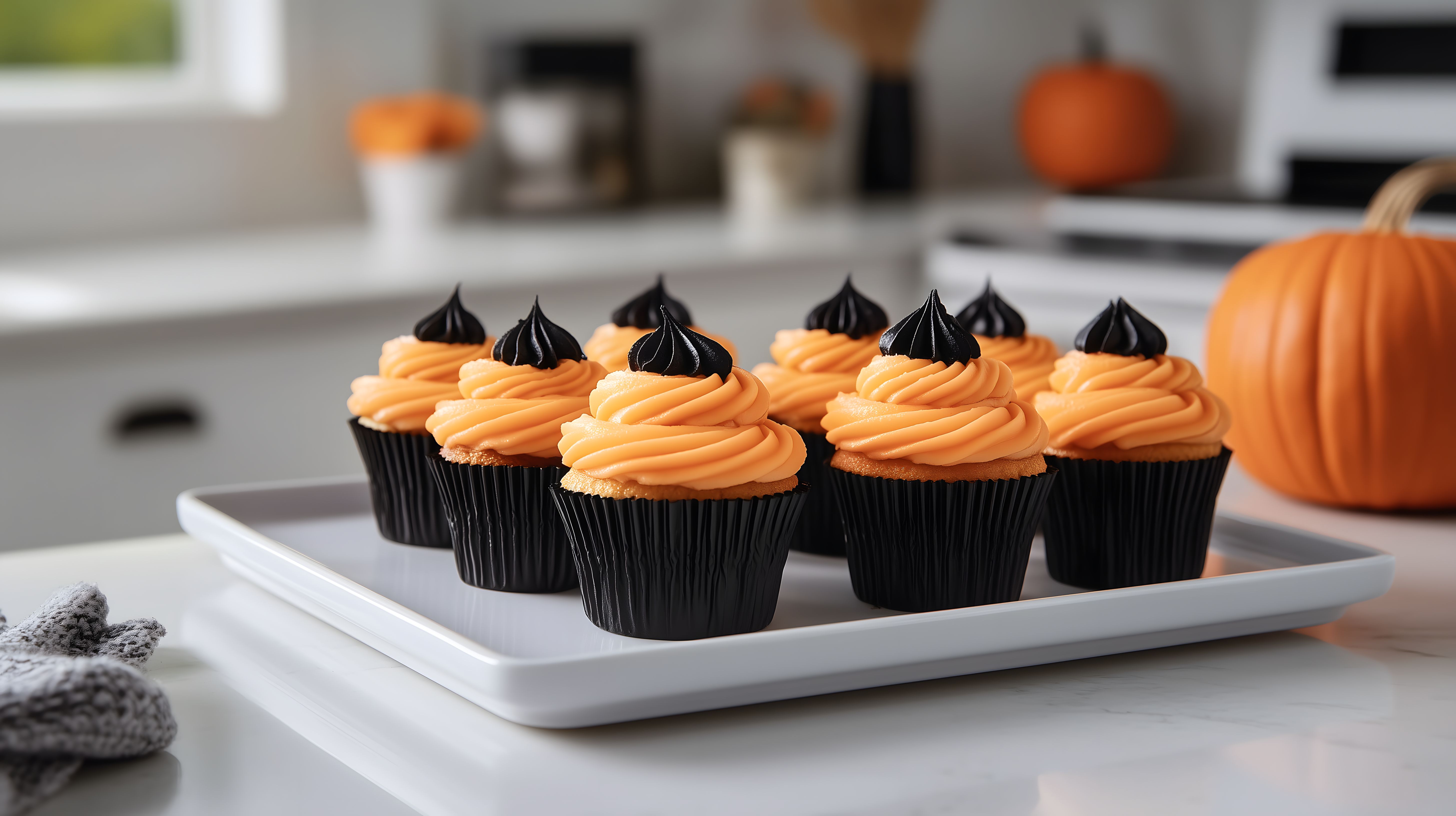 Das Foto zeigt eine Reihe von Halloween-Muffins, die auf einem weißen Tablett angerichtet sind. Die Muffins haben eine saftige, orangen Creme-Füllung, die mit schwarzen Zuckerverzierungen garniert ist. Im Hintergrund sind weitere Details wie eine Kürbisfigur und andere Dekorationselemente zu sehen, die eine stimmungsvolle, herbstliche Atmosphäre schaffen. Dieses Foto eignet sich hervorragend als kostenloses Stockfoto für saisonale Dekorationen, Backrezepte oder Herbst-Inspirationen in Blogs, Newslettern oder Social-Media-Beiträgen. Die hohe Auflösung und die Creative-Commons-Lizenz ermöglichen eine flexible Nutzung.