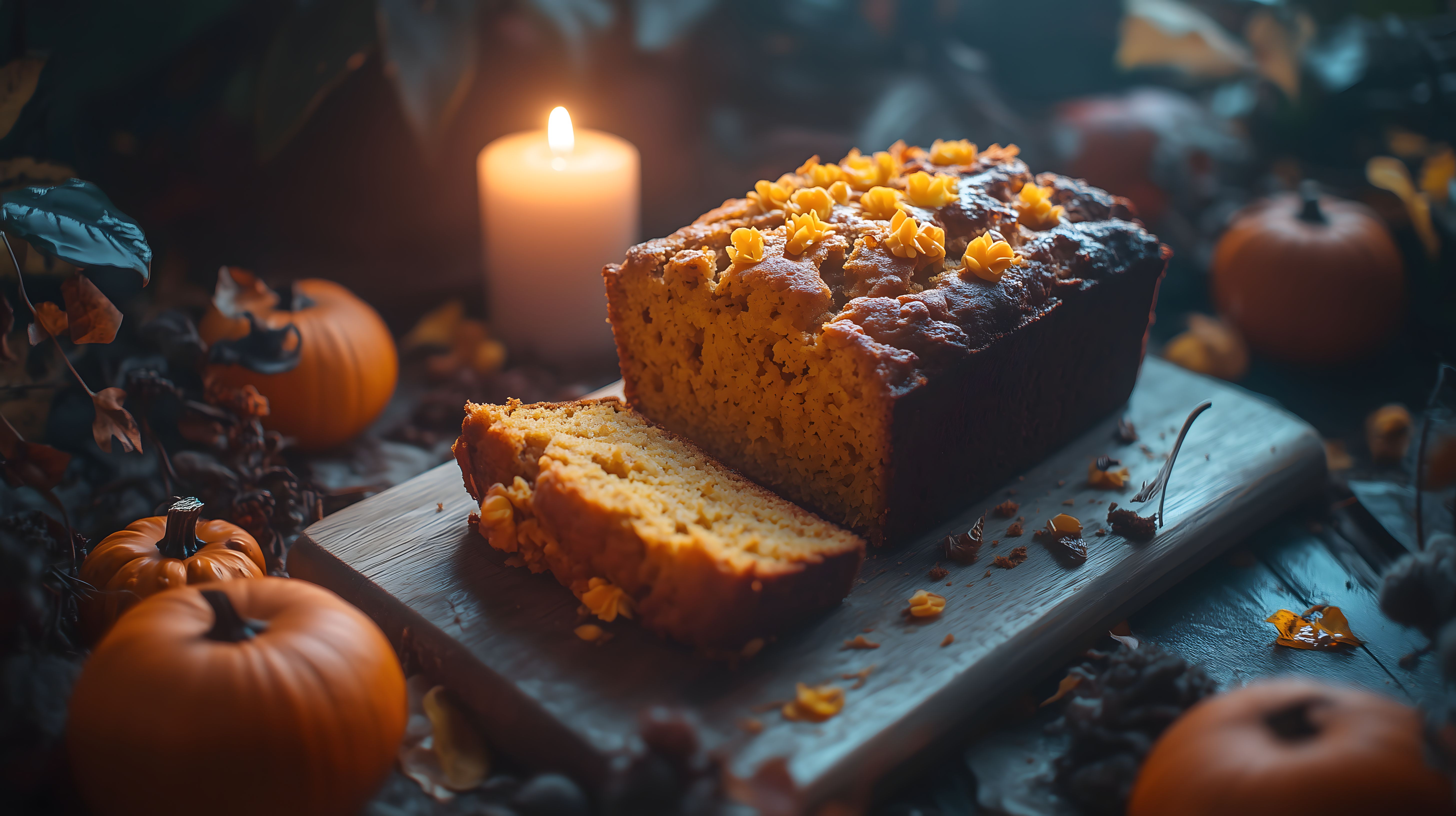 Dieses stimmungsvolle Foto zeigt einen saftig aussehenden Kürbisbrot-Laib, der auf einem rustikalen Holzbrett präsentiert wird. Um das Brot herum sind dekorative Herbstutensilien wie Kerzen, kleine Kürbisse und Blätter arrangiert, die eine gemütliche Herbstatmosphäre schaffen. Der Brotlaib ist dunkelbraun und mit knusprigen Oberflächenstruktur zu sehen, die den Appetit auf ein köstliches Stück Herbstbackwerk weckt. Das Foto bietet sich für den Einsatz in Herbst-Editorials, Rezept-Blogs oder Werbungen für saisonale Backwaren an. Als hochwertiges, kostenloses Stockfoto in Creative-Commons-Lizenz kann es vielfältig in digitalen Medien eingesetzt werden.