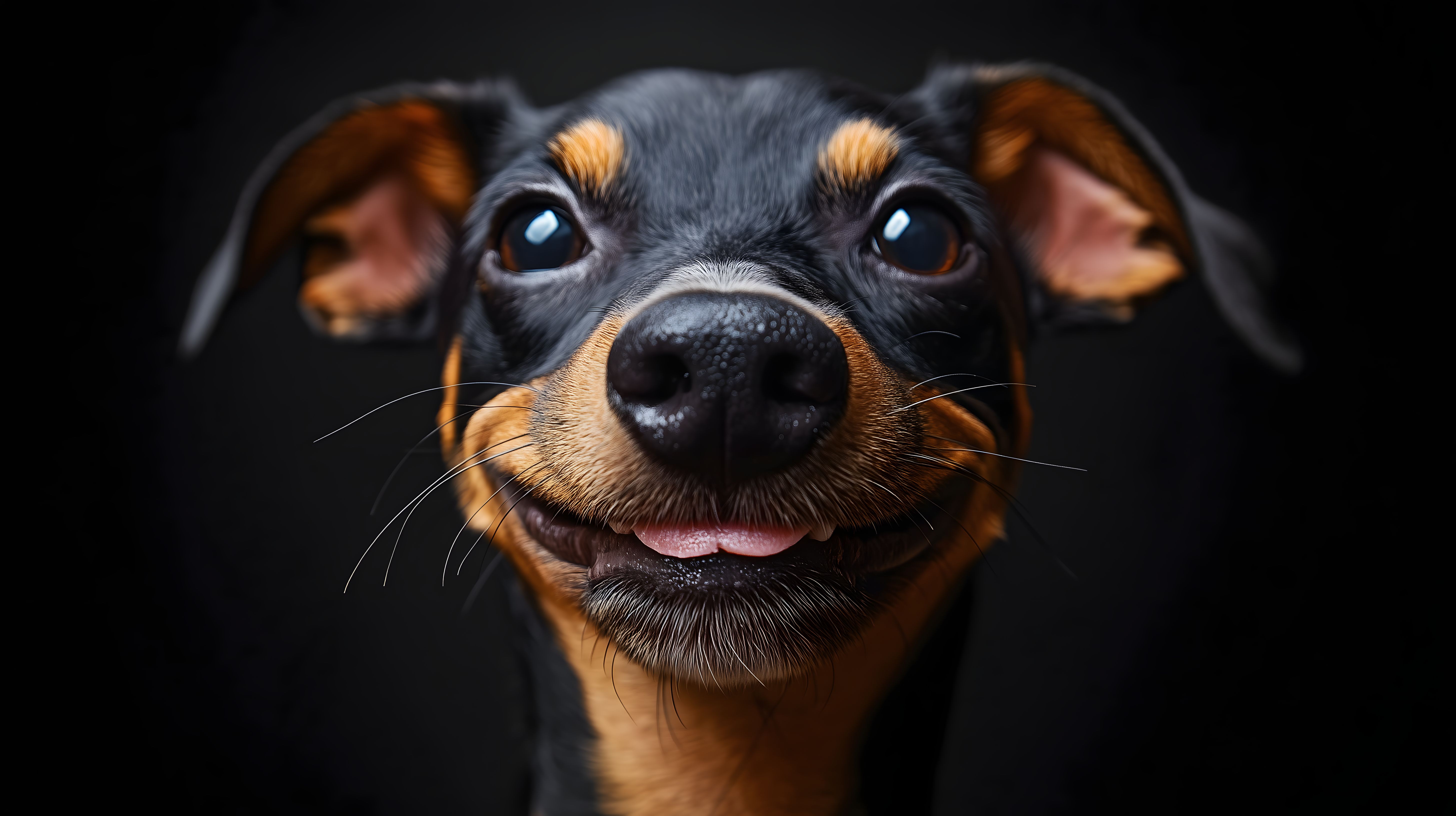 Dieses faszinierende Stockfoto zeigt eine Nahaufnahme eines lächelnden Hundes mit großen, ausdrucksvollen Augen. Der Hund hat ein schwarzes Fell mit braunen Akzenten und blickt direkt in die Kamera mit einem freundlichen, fast menschlichen Ausdruck. Durch den dunklen Hintergrund und die scharfe Fokussierung auf das Gesicht wird die Aufmerksamkeit des Betrachters voll und ganz auf den Hund gelenkt, der den Eindruck von Freude und Zufriedenheit vermittelt.