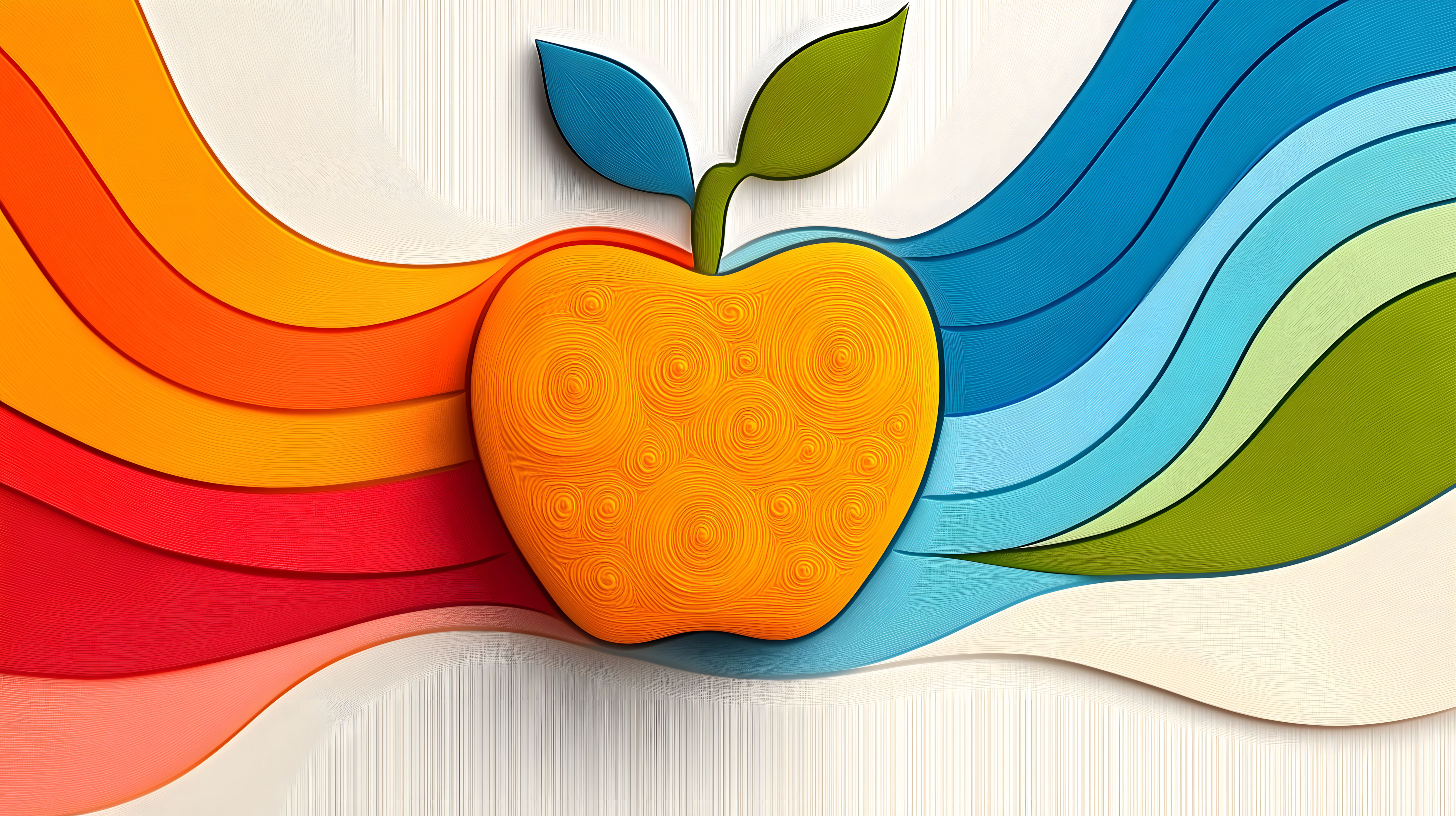 Diese farbenfrohe digitale Illustration zeigt ein abstraktes Apfelmotiv vor einem Hintergrund aus dynamischen Regenbogenfarben. Die Apfelform ist mit einem detaillierten Mandelbrotmuster gefüllt, das eine organische, natürliche Wirkung erzeugt. Die Komposition ist minimalistisch und modern, wodurch das Bild als hochwertiger Hintergrund, in Werbematerialien oder für Social-Media-Posts verwendet werden kann. Das freie, hochauflösende Stockfoto steht unter der Creative-Commons-Lizenz zur Verfügung.