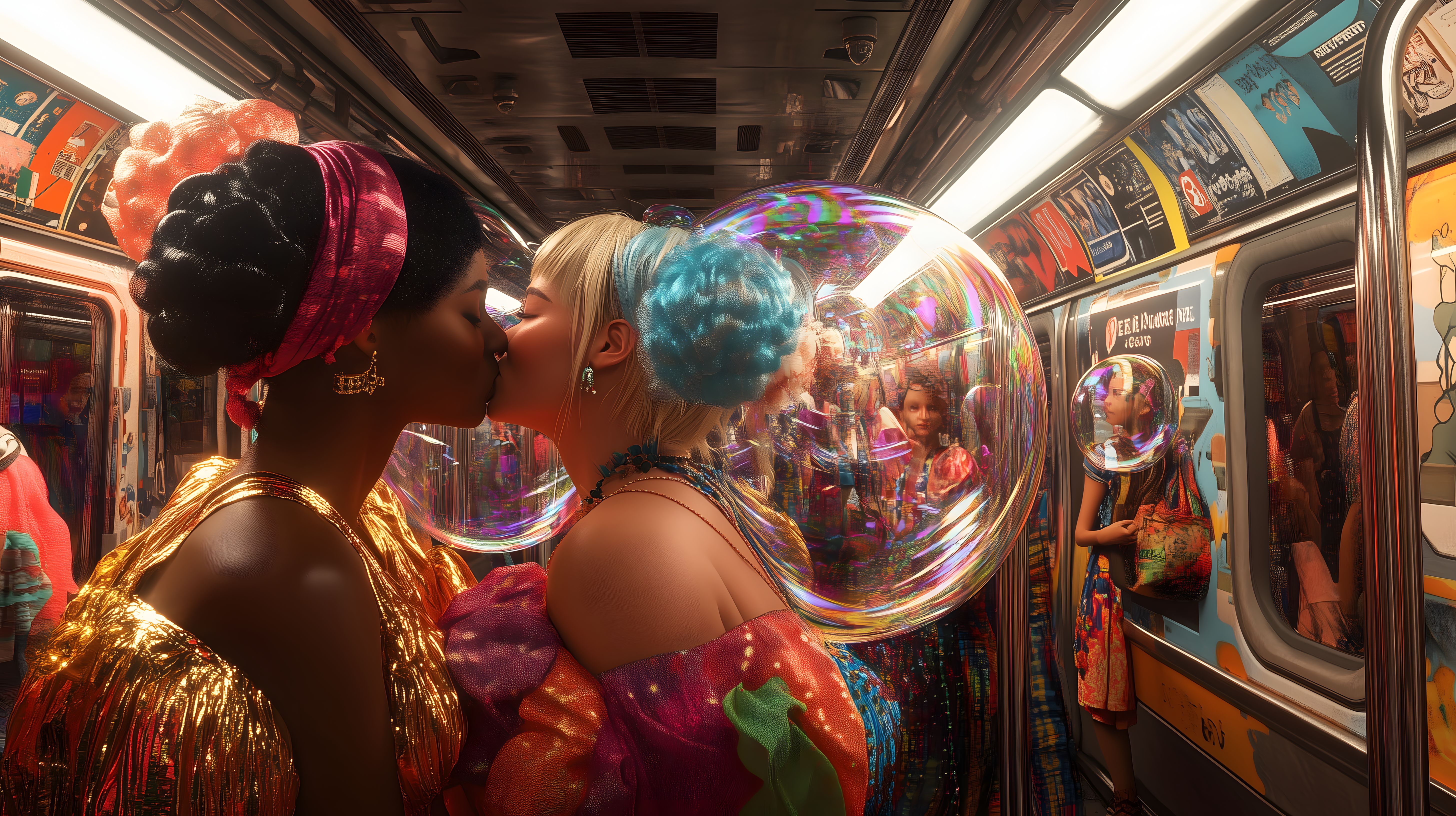 Dieses faszinierende Foto fängt einen bunten, lebendigen Moment in einer Stadtbahn ein. Im Mittelpunkt steht ein Paar, das sich leidenschaftlich küsst, umgeben von farbenfroher Dekoration und grafischen Elementen an den Wänden. Die Kleidung der beiden hebt sich von der sonst eher düsteren Umgebung ab und verleiht der Szene eine fast surreale Atmosphäre.