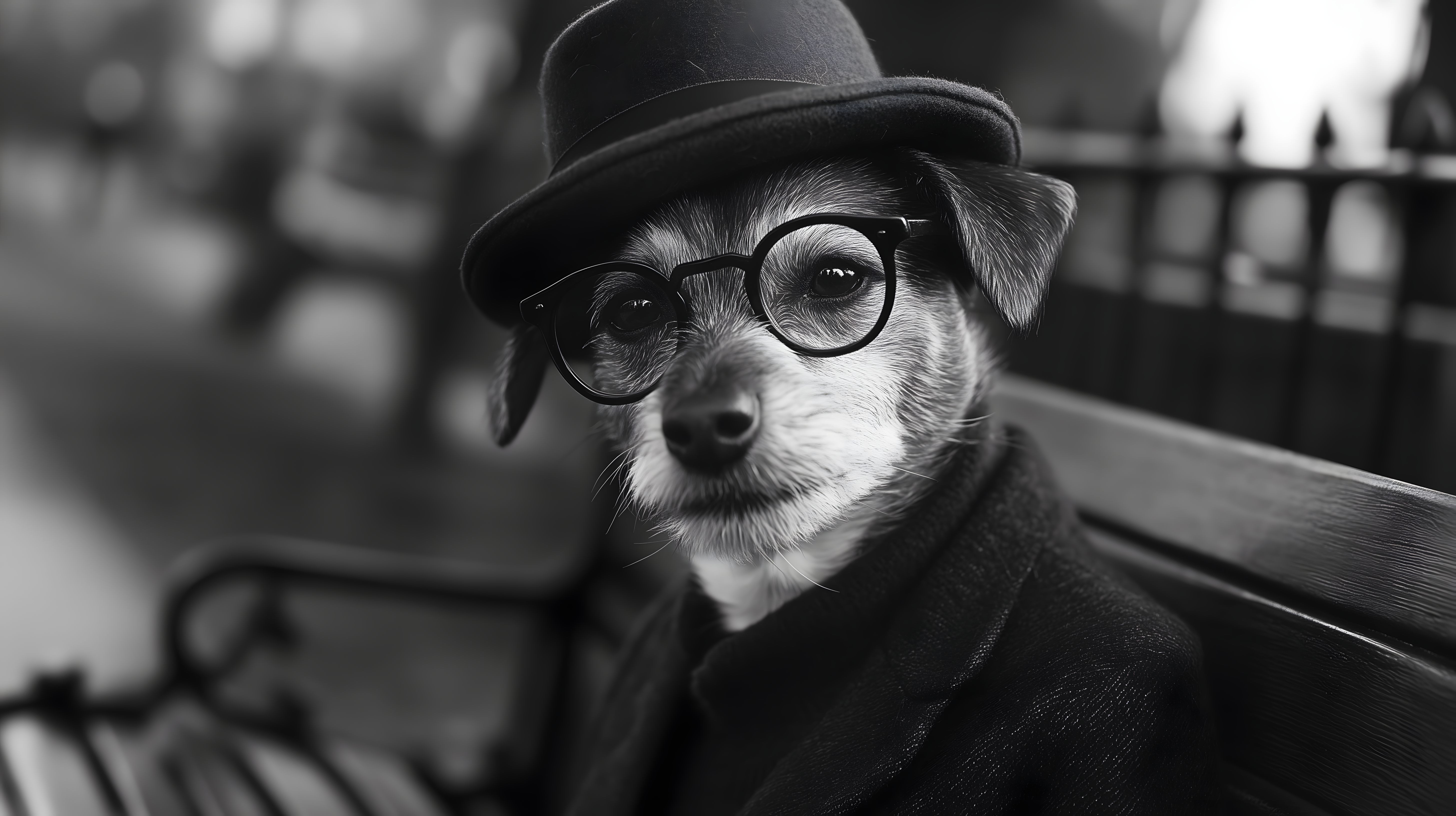Dieses charmante Schwarz-Weiß-Foto zeigt einen Hund, der elegant gekleidet ist. Er trägt eine Brille mit runden Gläsern und einen klassischen Bowler-Hut. Der Hund blickt ernst in die Kamera, was dem Bild eine humorvolle und kreative Note verleiht. Diese hochauflösende Aufnahme eignet sich perfekt für den Einsatz in Blogs, Newslettern, Werbekampagnen oder auf Social-Media-Kanälen. Als kostenloses Stockfoto unter einer Creative-Commons-Lizenz kann es frei genutzt werden.