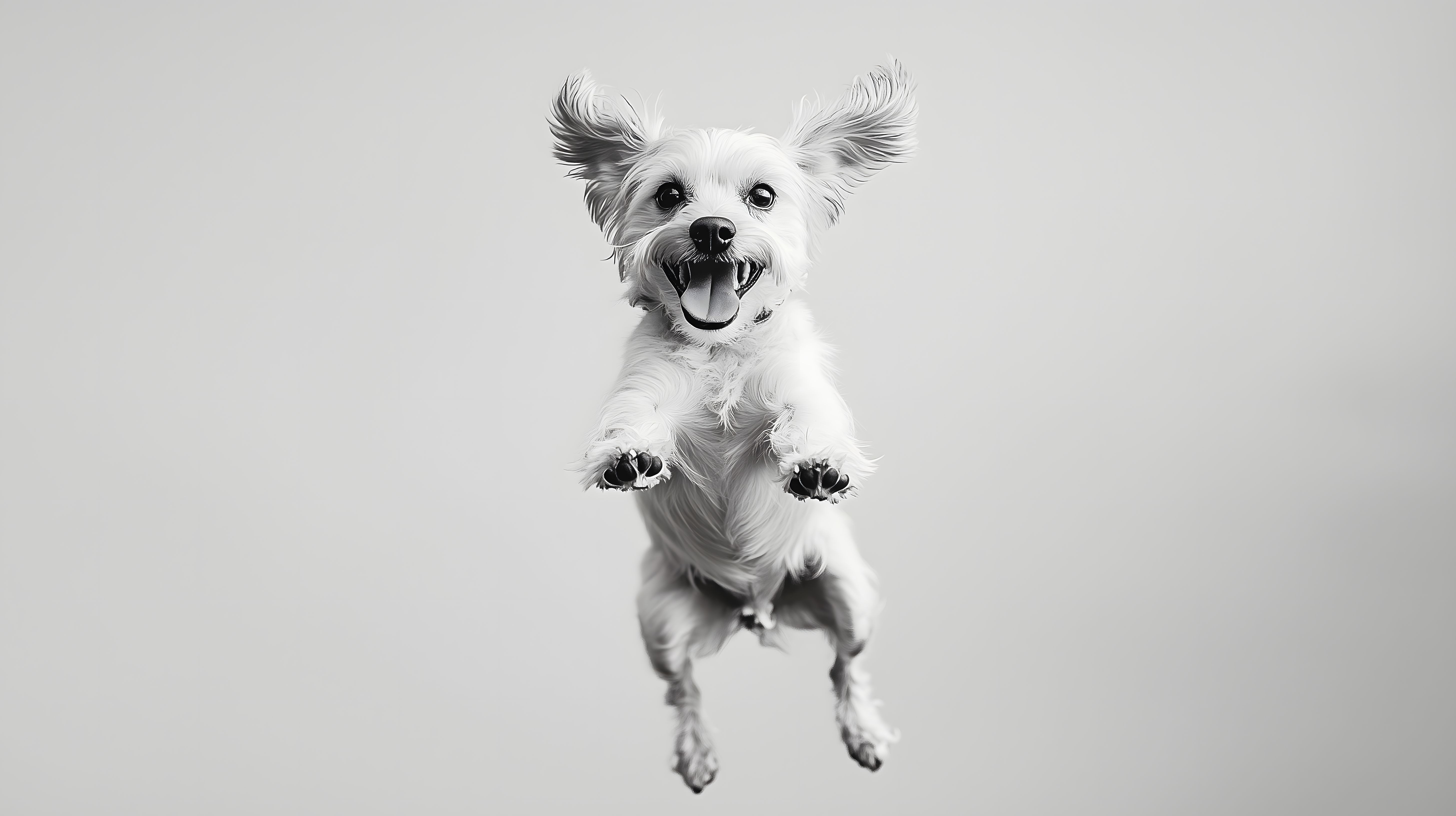 Das Bild zeigt einen weißen Hund, der fröhlich in die Luft springt. Der Hund hat lange, wehende Ohren und einen glücklichen Gesichtsausdruck. Die Schwarz-Weiß-Aufnahme legt den Fokus auf die Dynamik und Lebendigkeit der Szene. Dieses Stockfoto eignet sich hervorragend für Beiträge in Blogs, Newsletter-Designs oder Social-Media-Posts, die eine positive, spielerische Stimmung vermitteln möchten. Das hochauflösende Bild ist unter einer Creative-Commons-Lizenz frei verwendbar.
